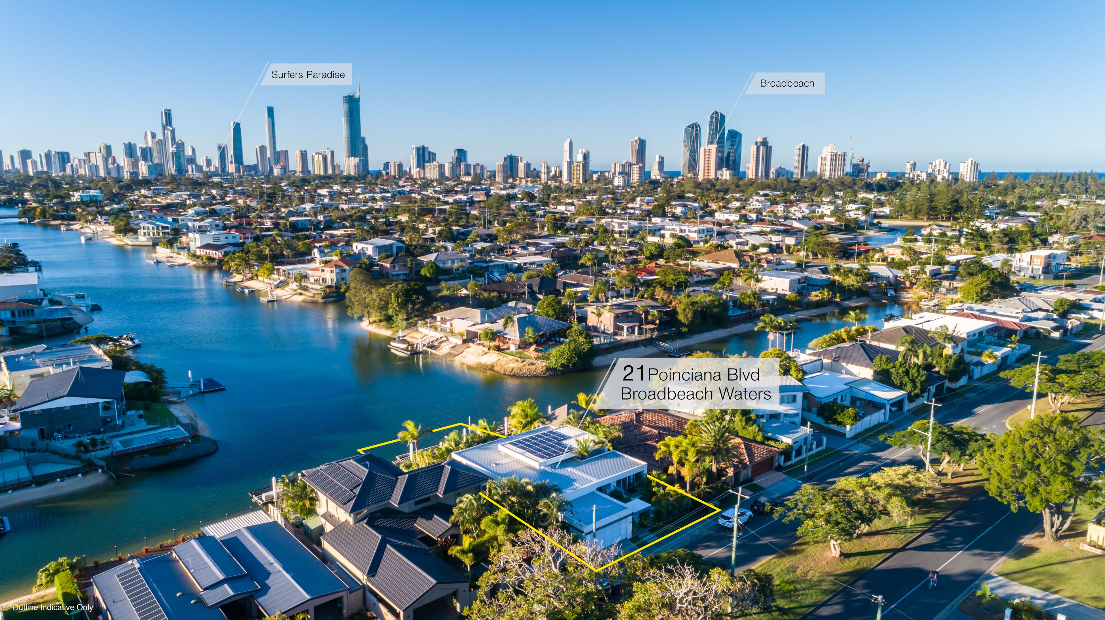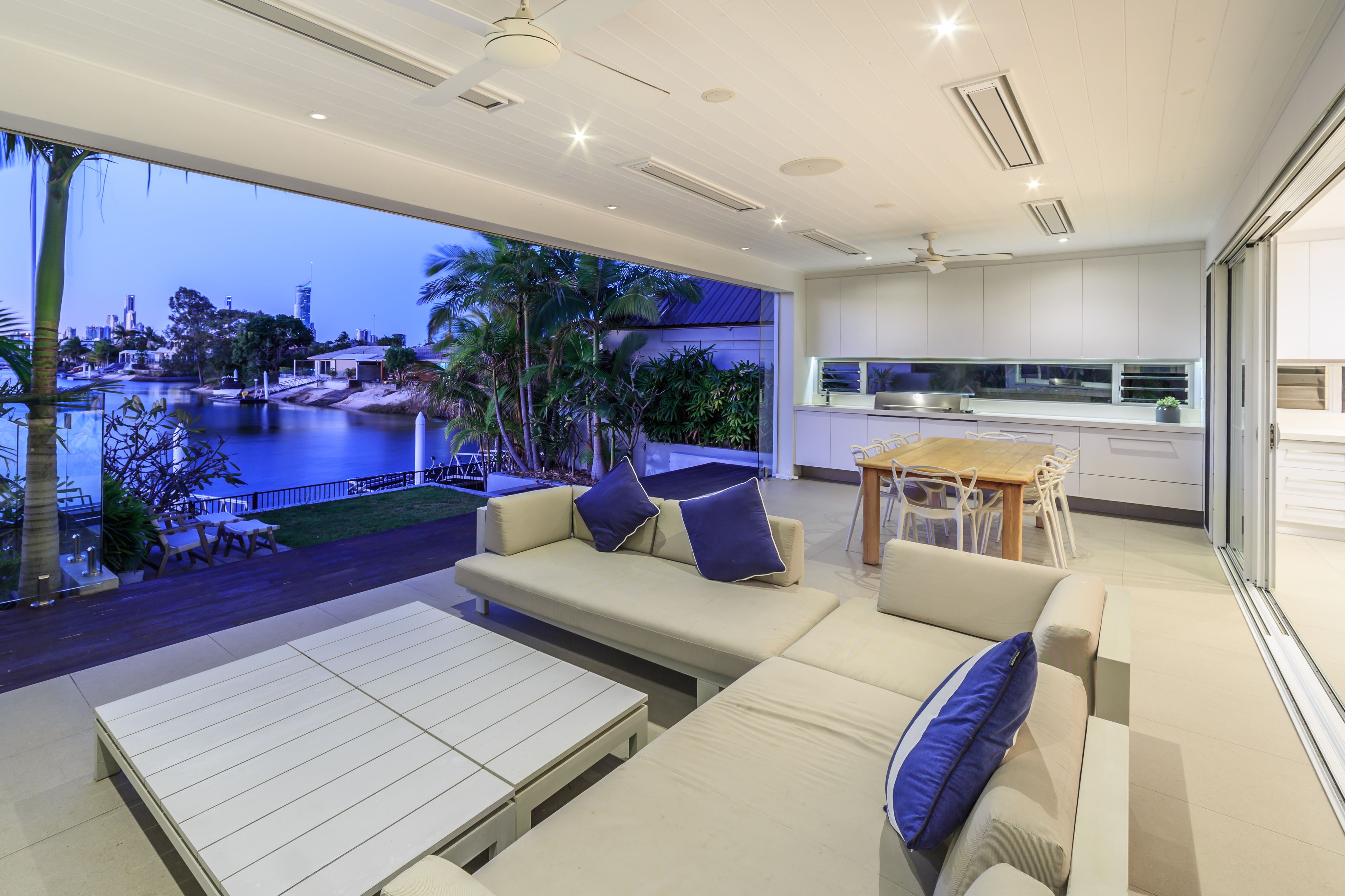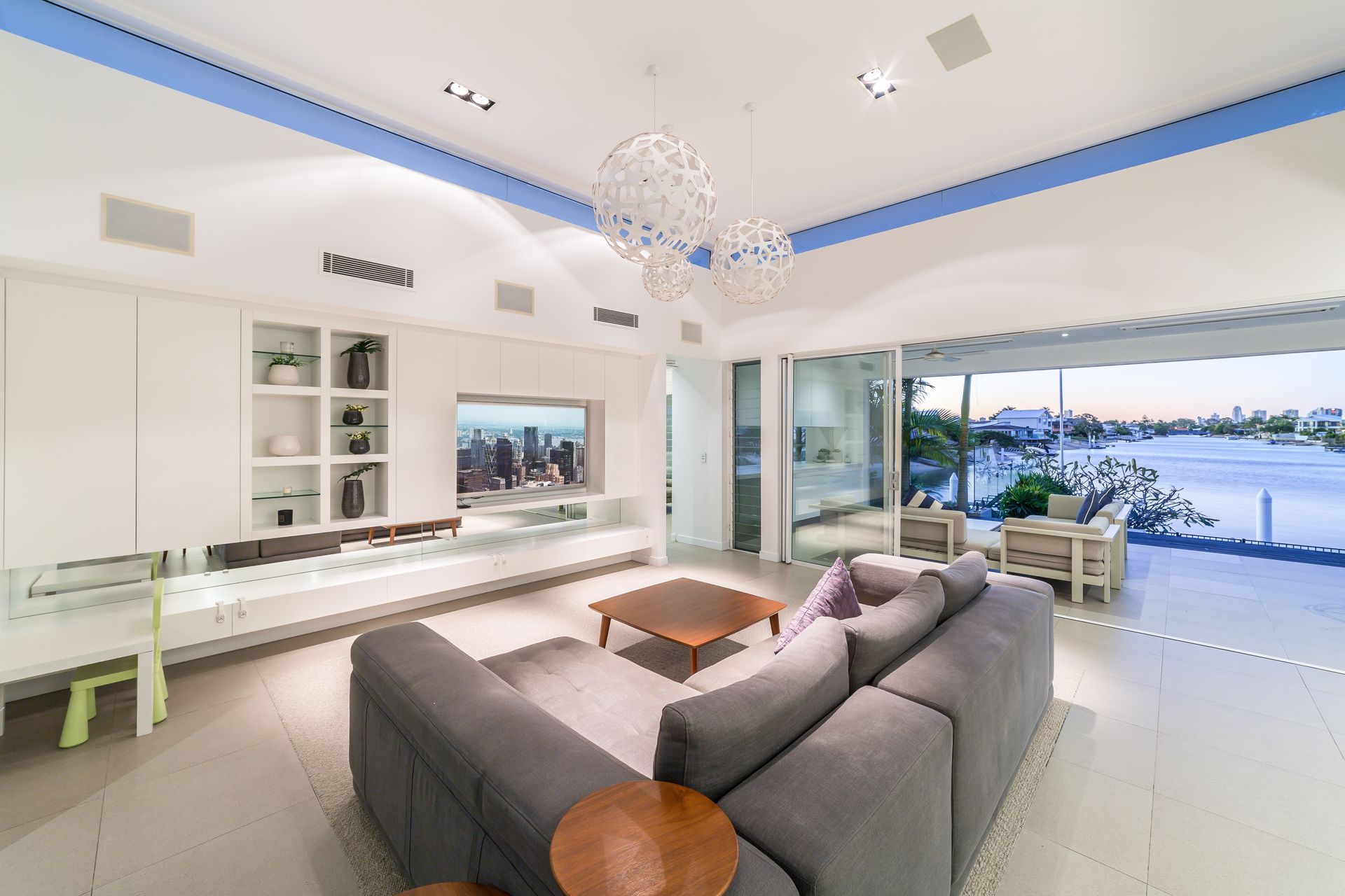 • North to water, single level, luxury waterfront haven with three bedrooms, three bathrooms • Sun-infused living spaces, showcased by an internal atrium, glimpses of greenery and crisp white interiors • Perched at the end of a wide expanse of water which stretches down the mouth of the canal • Kitchen perfection awaits, with stainless steel double ovens, induction cooktop and an integrated Miele dishwasher • A supersized island bench, able to accommodate 12 people, doubles as a dining area • Living room is flanked by custom cabinetry and integrates seamlessly with the alfresco area • All bedrooms with their own alfresco area and serviced by deluxe bathrooms • Master suite with water views, electronic exterior louvres, walk-in robe and ensuite with rain shower • Alfresco area with views of the Gold Coast skyline, kitchen with gas BBQ and fridge drawer, in-roof heaters and Bose speakers • Manicured, low maintenance gardens, fringed by fragrant frangipanis and mature palms • Heated plunge pool plus a 18m private sandy beach and a large floating pontoon • Double garage, multiple storage rooms, ducted and zoned air-conditioning, Crimsafe screens • Video intercom, security system and ceilings which range from approx. 9ft to 12ft • Less than 5 minutes from vibrant Broadbeach, Pacific Fair and Star Casino