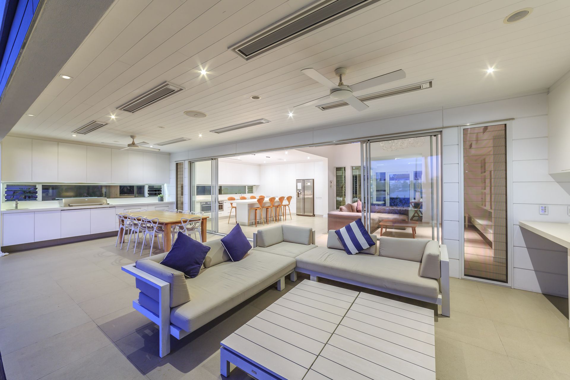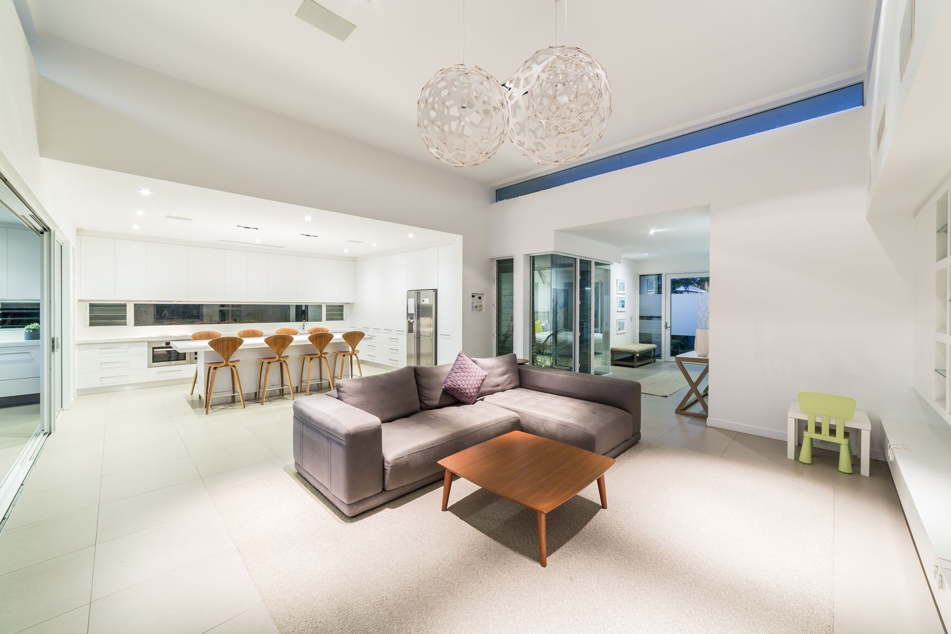 A gentle glow of natural light filters through the house from every angle. The soaring atrium, the high ceilings, and the wall of stackable glass doors which link with the outdoors all flood the home with sunshine, along with the on-trend white colour palette which dominates the styling. You'll be instantly drawn to the open plan living and dining area which shares space with what can only be described as pure kitchen perfection. Accented by stainless steel double ovens, induction cooktop and an integrated dishwasher, there is also a supersized and streamlined island bench, able to comfortably accommodate 12 people and double as a dining area. The living room is flanked by custom cabinetry and together these areas combine to be a social hub, where you feel embraced by its warmth and welcoming space to gather together.