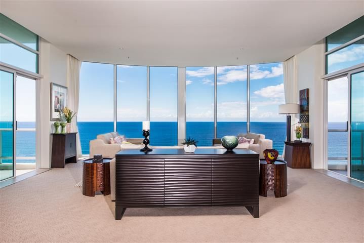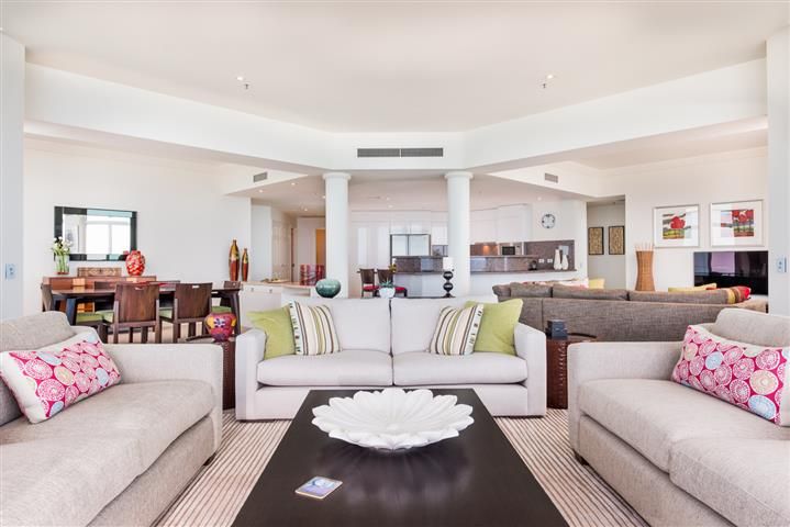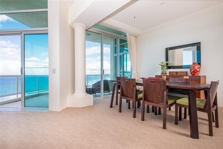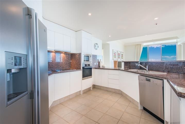 The iconic Carmel by the Sea' tower offers all the spacious luxury and recreation facilities of a 5-star resort, ideally located just one city block from the cosmopolitan heart of Broadbeach. Overlooking broad golden sands and endless blue ocean, centre apartment on the 23rd level is a quiet haven of privileged living ideal as either a permanent or seasonal home. The unique "H"style floor plan with an area of almost 27 squares provides house-sized living space, with al fresco entertaining balconies on both the north-east and south-east aspects. Floor to ceiling windows in living, dining and the TV lounge showcase sensational ocean views, with a grand sweep of coastal beaches stretching all the way to Coolangatta. Tasteful refurbishment has ensured an elegant atmosphere throughout, enhanced by ultra-high ceilings and neutral decor in the restful tones of nature. High quality furniture and accessories present the opportunity to acquire a ready-made holiday or permanent home of designer standard, with ducted air conditioning to ensure comfort in any season. Formal areas are defined by majestic columns and recessed ceilings, with a marble-topped credenza serving the dining room. Central to living areas is the large granite kitchen equipped with stainless steel European appliances and abundant lacquer-finish storage. Three bedrooms include the master suite in its own private wing, with a large walk- in robe and ensuite featuring a spa with a magnificent ocean outlook. The guest or family wing of two large bedrooms plus bathroom enjoys north views over the city and ocean.
