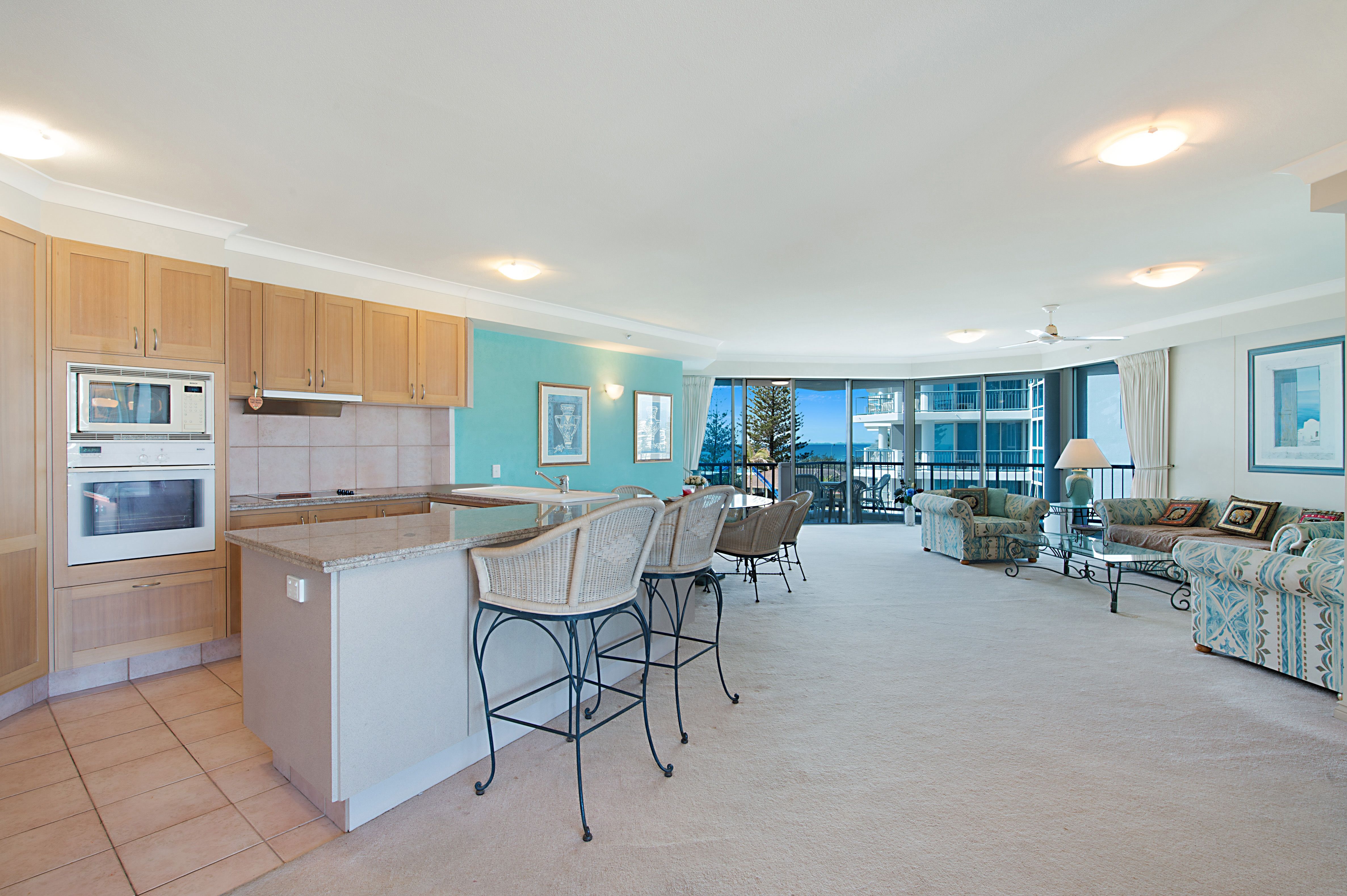 This spacious 164 square metre, 2 bedroom apartment with third bedroom or study offers generous open plan living on the comfortable 5th level. Relax and unwind on the large balcony and enjoy the beautiful ocean views all the way down to the Coolangatta coastline plus spectacular sunsets over the hinterland of an evening.