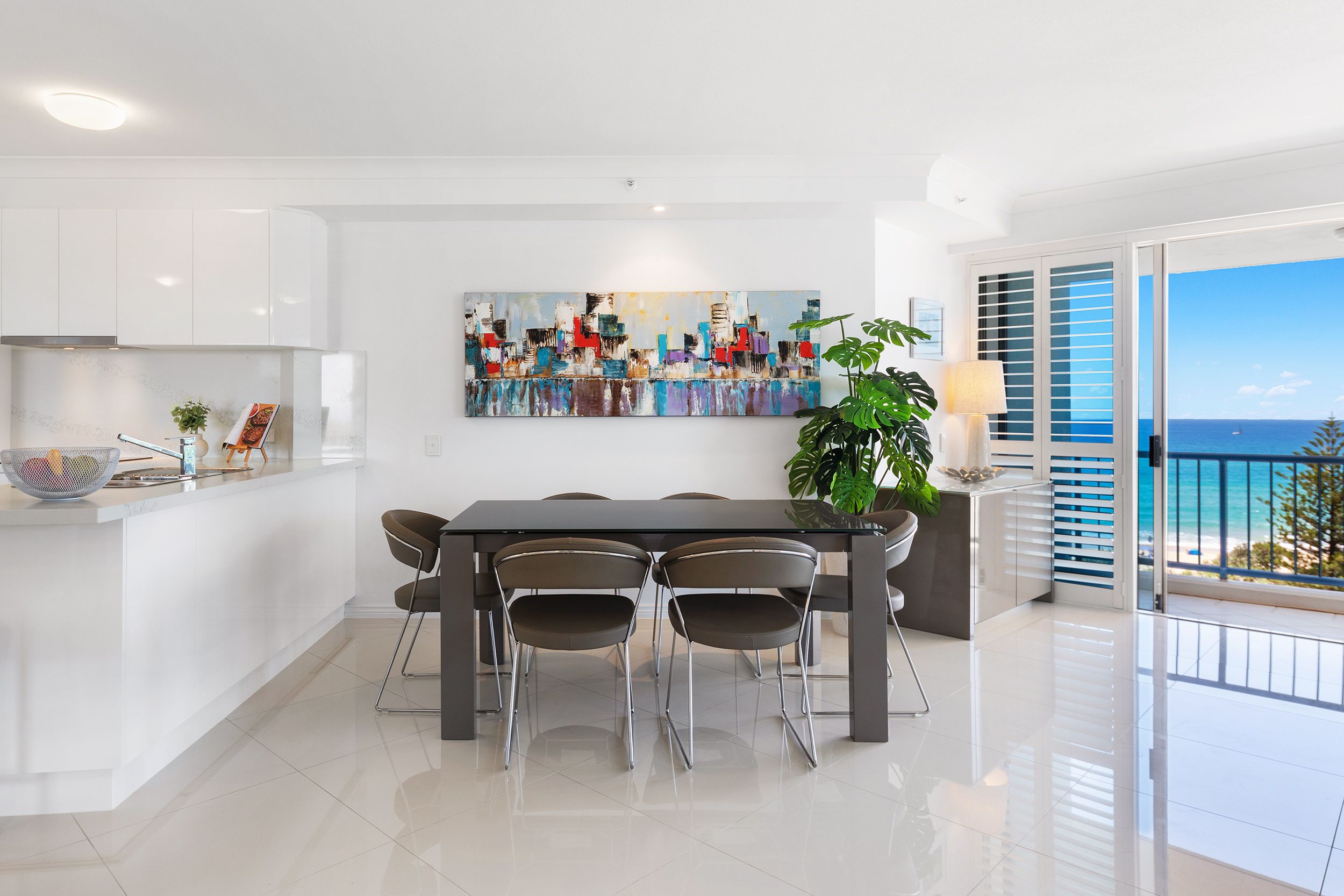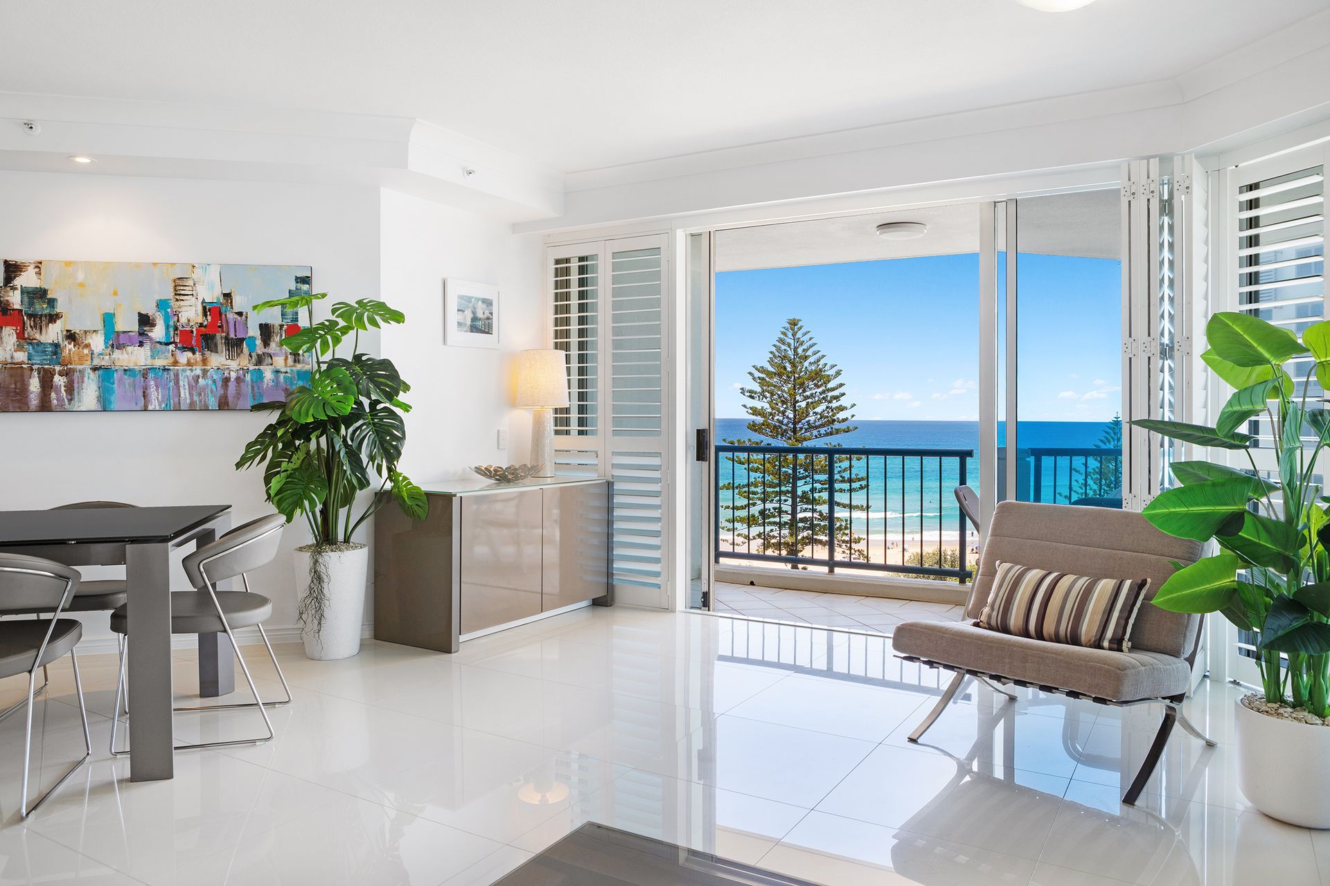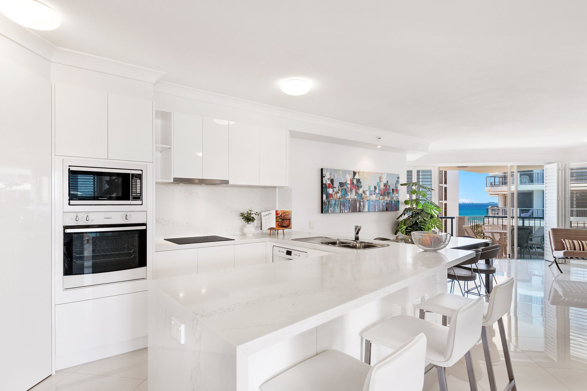 Discover the pinnacle of luxury coastal living in this impeccably renovated 2-bedroom apartment. As you enter the open-plan living and dining areas, you'll be greeted by floor-to-ceiling glass windows and tasteful white plantation shutters. From the elevated 8th floor, immerse yourself in panoramic views of the ocean and hinterland. With a spacious floor area , this apartment showcases two expansive bedrooms, an open-plan layout, and the flexibility of a second living area or study. The master suite, featuring an en-suite bathroom, walk-in wardrobe and balcony with stunning ocean views