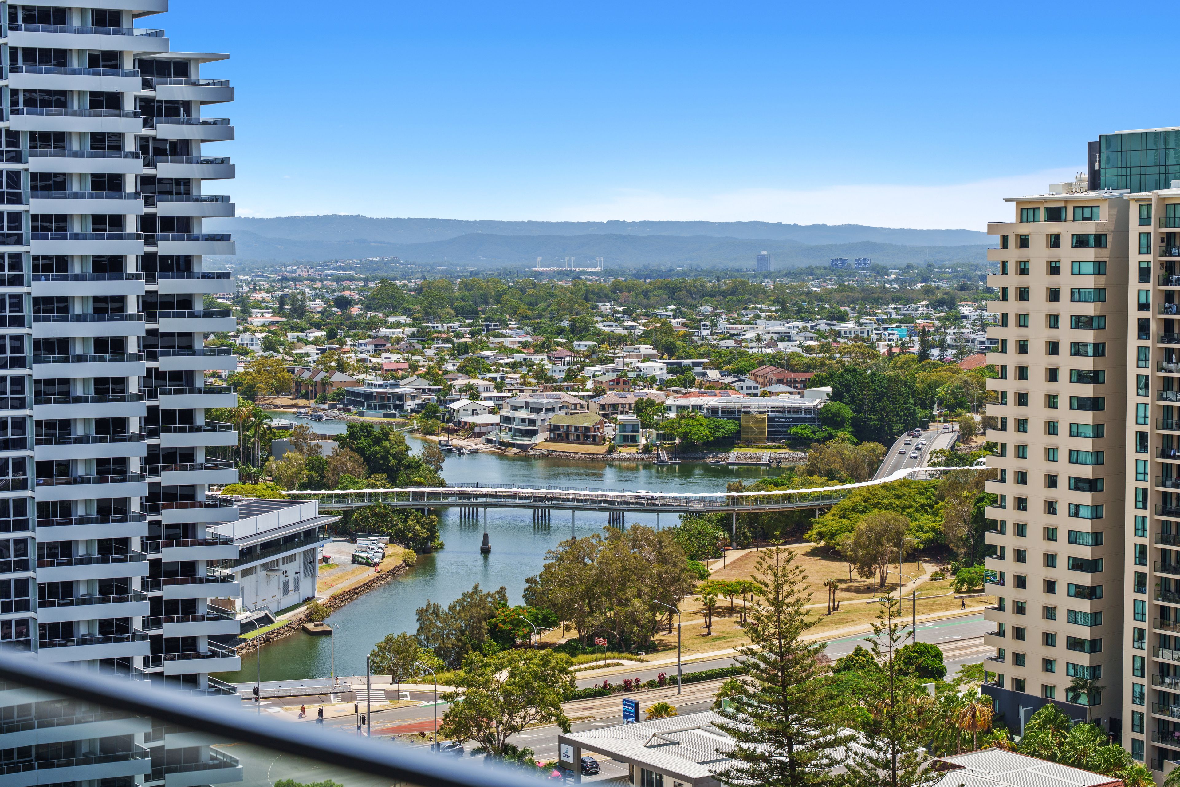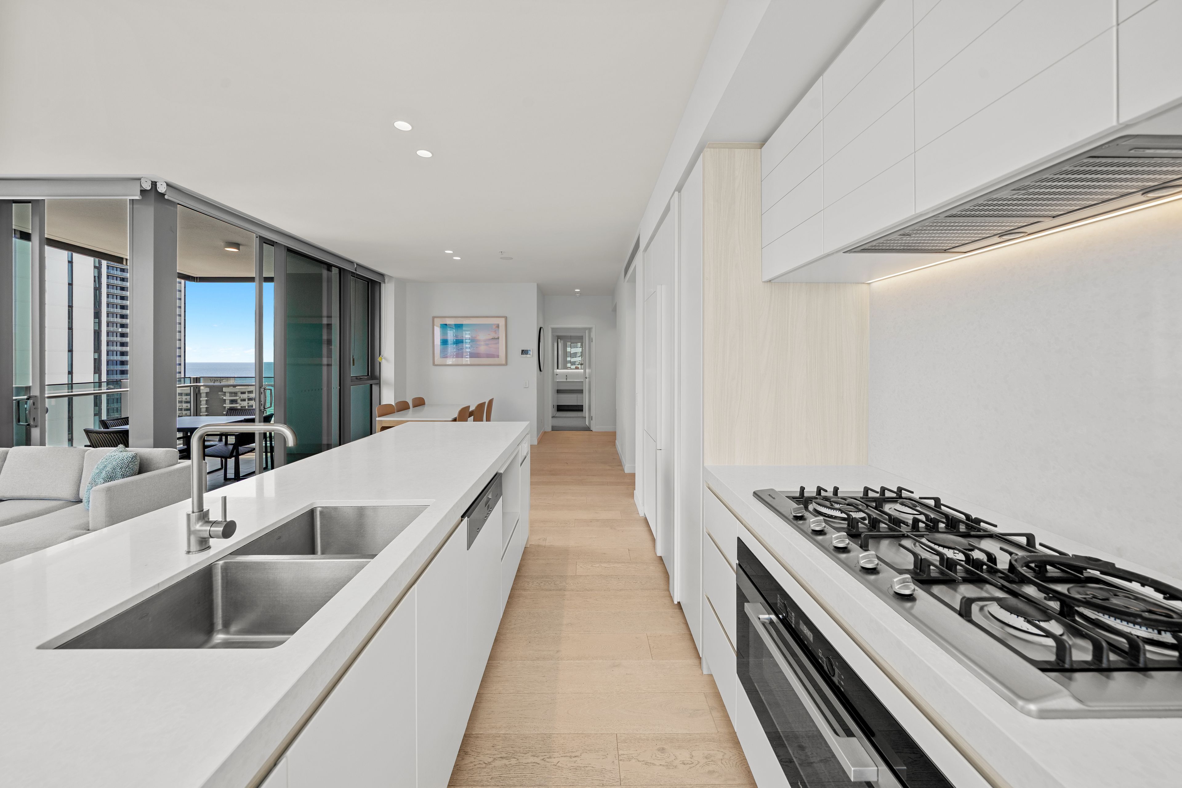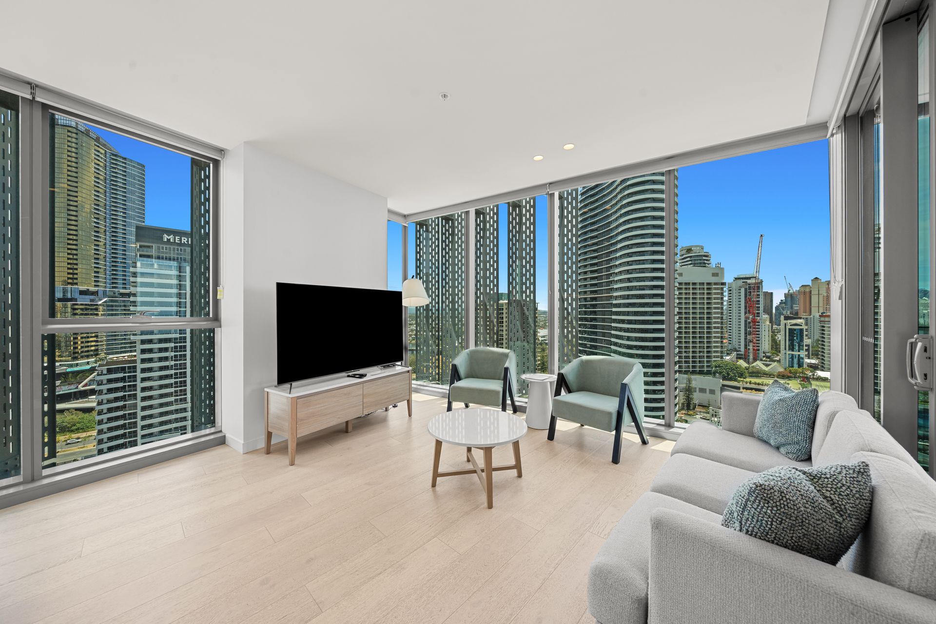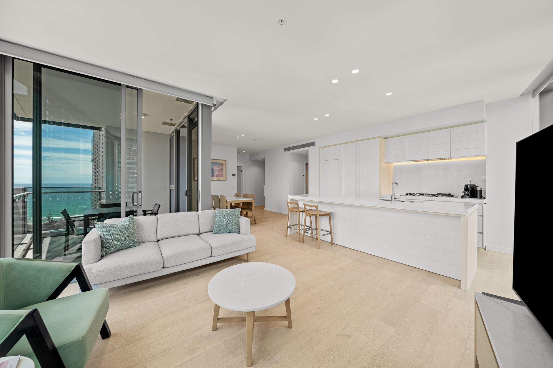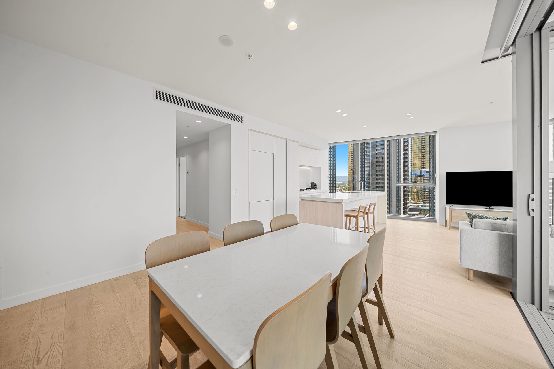 Apartment Features • Level 17 position with ocean, city skyline, river and hinterland • North-facing with Floor-to-ceiling windows • Complete turn-key furniture package included • Attractive returns on both long & short term letting options • Ducted airconditioning, roller blinds & bedroom curtains • Secure Carpark with additonal storage cage • Sleek, modern interior with engineered oak timber flooring and upgraded carpet • Oversized kitchen with integrated appliances and generous breakfast bar • Master bedroom with stunning views and built-in robes & ensuite • Two additional generously sized bedrooms, both with city views • Separate laundry with ample storage throughout