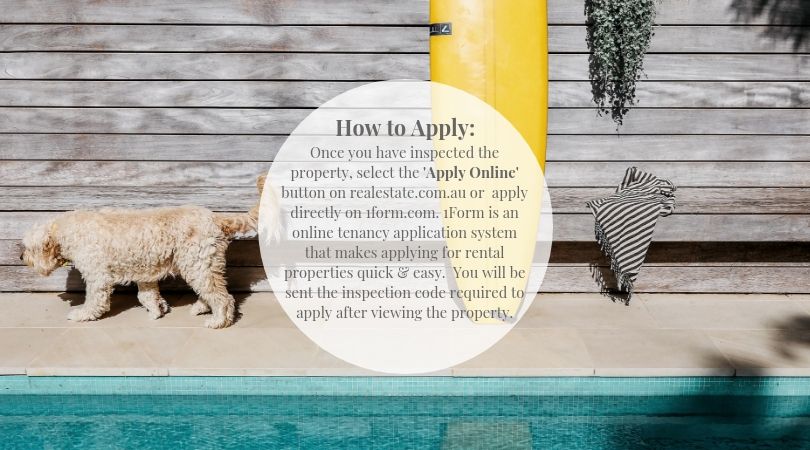 HOW TO APPLY: Once you have inspected the property, select the "Apply Online' button on Realestate.com.au or apply directly on 1form.com. 1Form is an online tenancy application system that makes applying for rental properties quick and easy. You will be sent the inspection code required to apply after viewing the property.