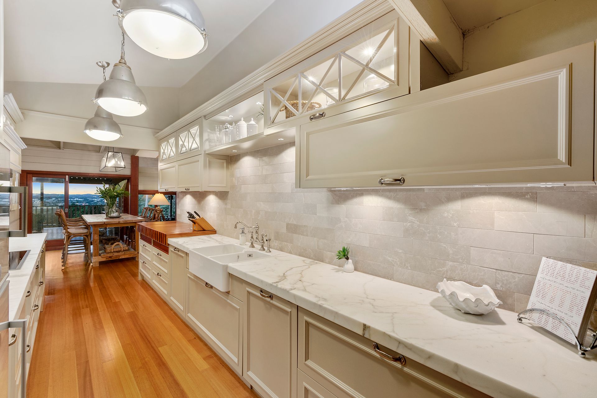 Elevated above both living areas is the chef's paradise you have been waiting for; complete with high tech Gaggenau appliances and gorgeous touches including shaker cabinetry, an abundance of storage space, six foot Tasmanian oak butchers block, Queensland cedar veneer range hood, Carrara marble bench tops bestowing themselves throughout plus separate butlers pantry finished with two fridges and wall to wall shelving all designed by award winning interior designer Darren James.