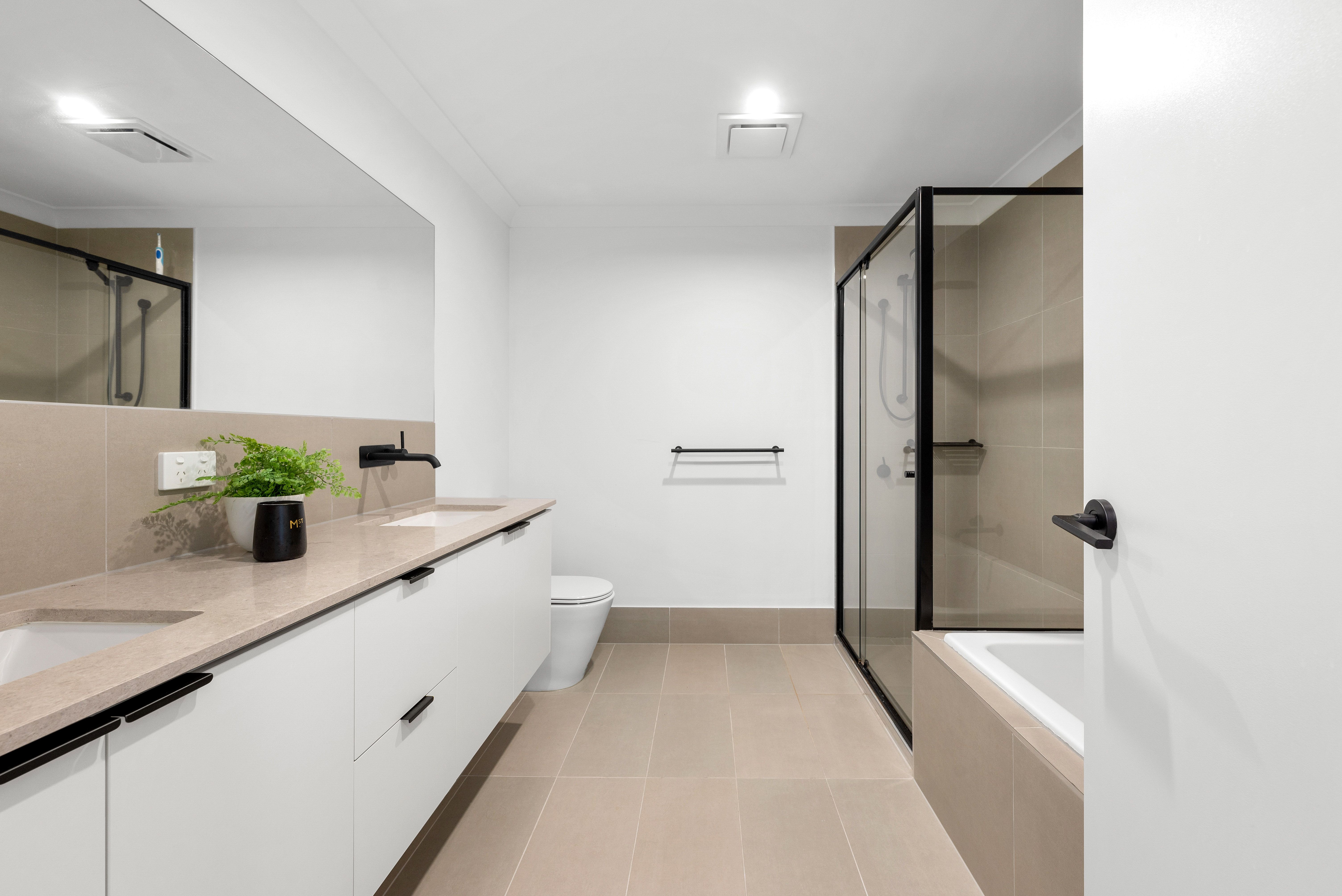 Featuring zoned ducted air-conditioning throughout, the other two bedrooms are positioned away from the Master wing and each boast the added comfort of ceiling fans and easy access to the central bathroom which is complete with a separate bathtub and shower with dual vanities, matt black tapware and floor-to-ceiling designer tiling.