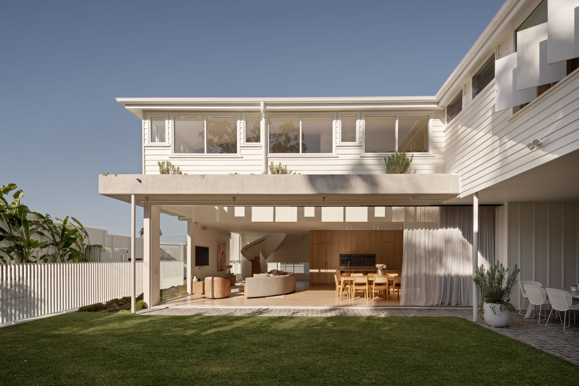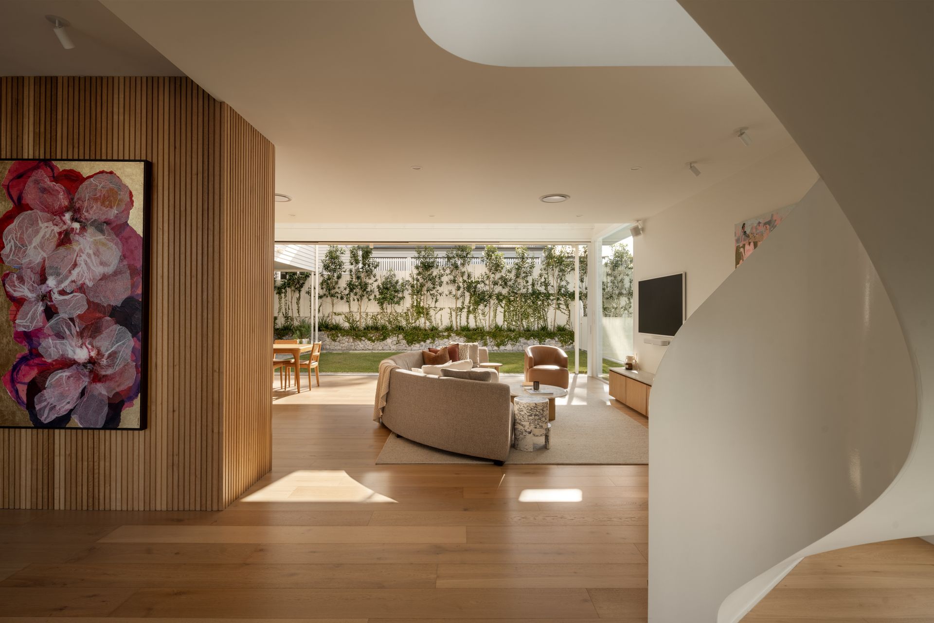 A sculptural arched ceiling carries through the hallway, while a striking pivot door and 10-metre cavity sliding wall set the tone for volume and scale.