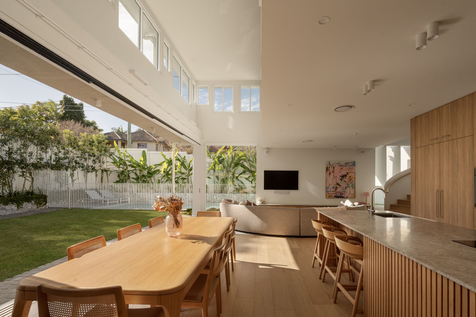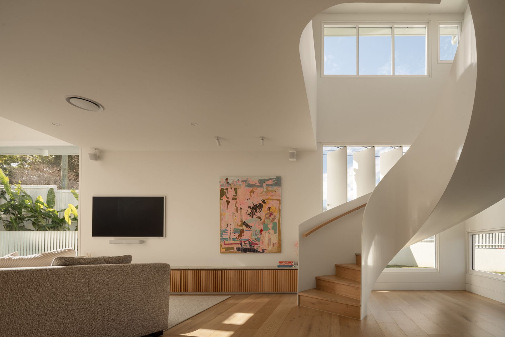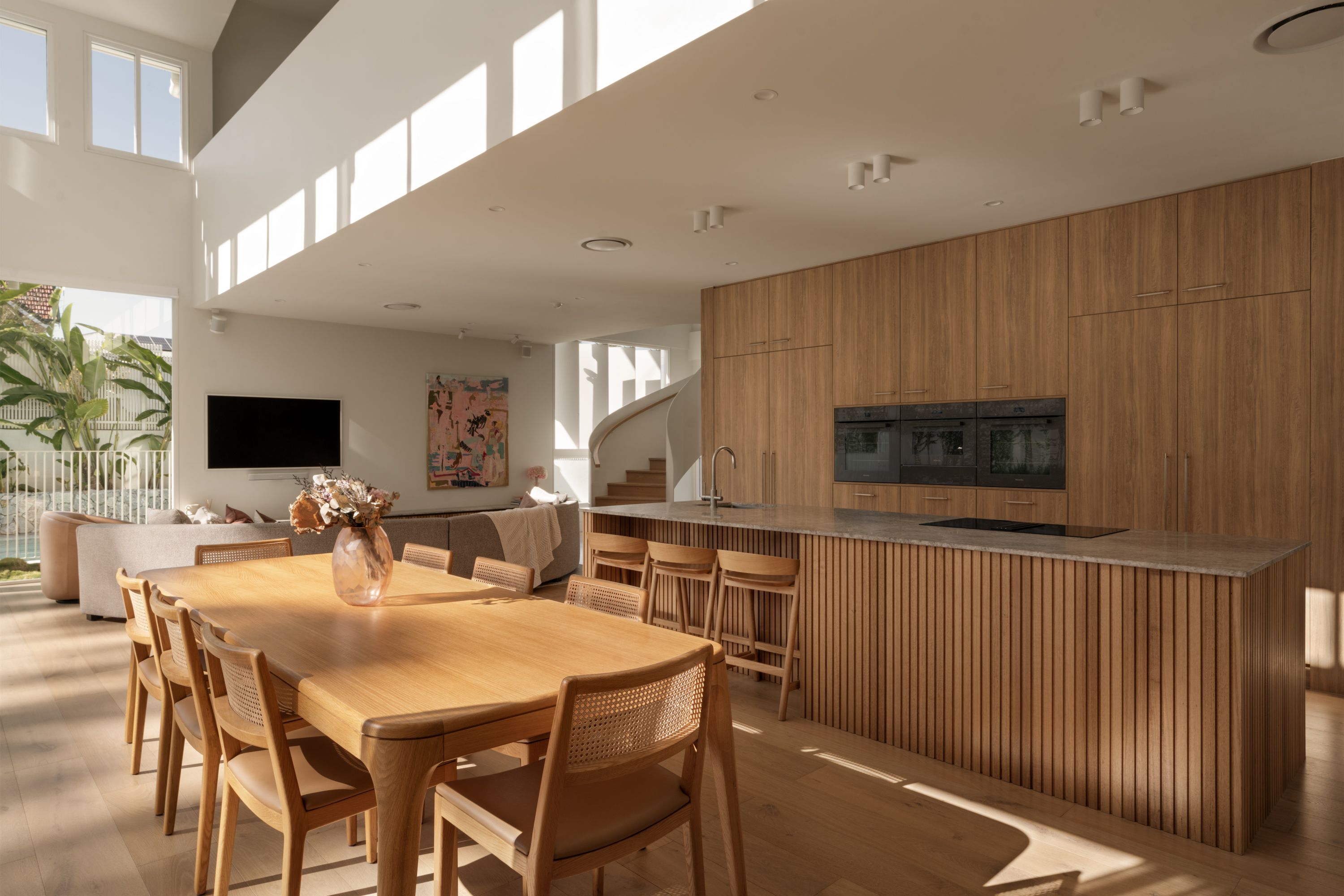 The open-plan living and dining area enjoys a light-filled North-East aspect and is grounded by thoughtful architectural detail. Soaring six-metre ceilings over the dining area add drama and grandeur, while a curved steel staircase provides a sculptural centrepiece. Full-height timber-framed doors connect the indoors to the outdoors seamlessly.