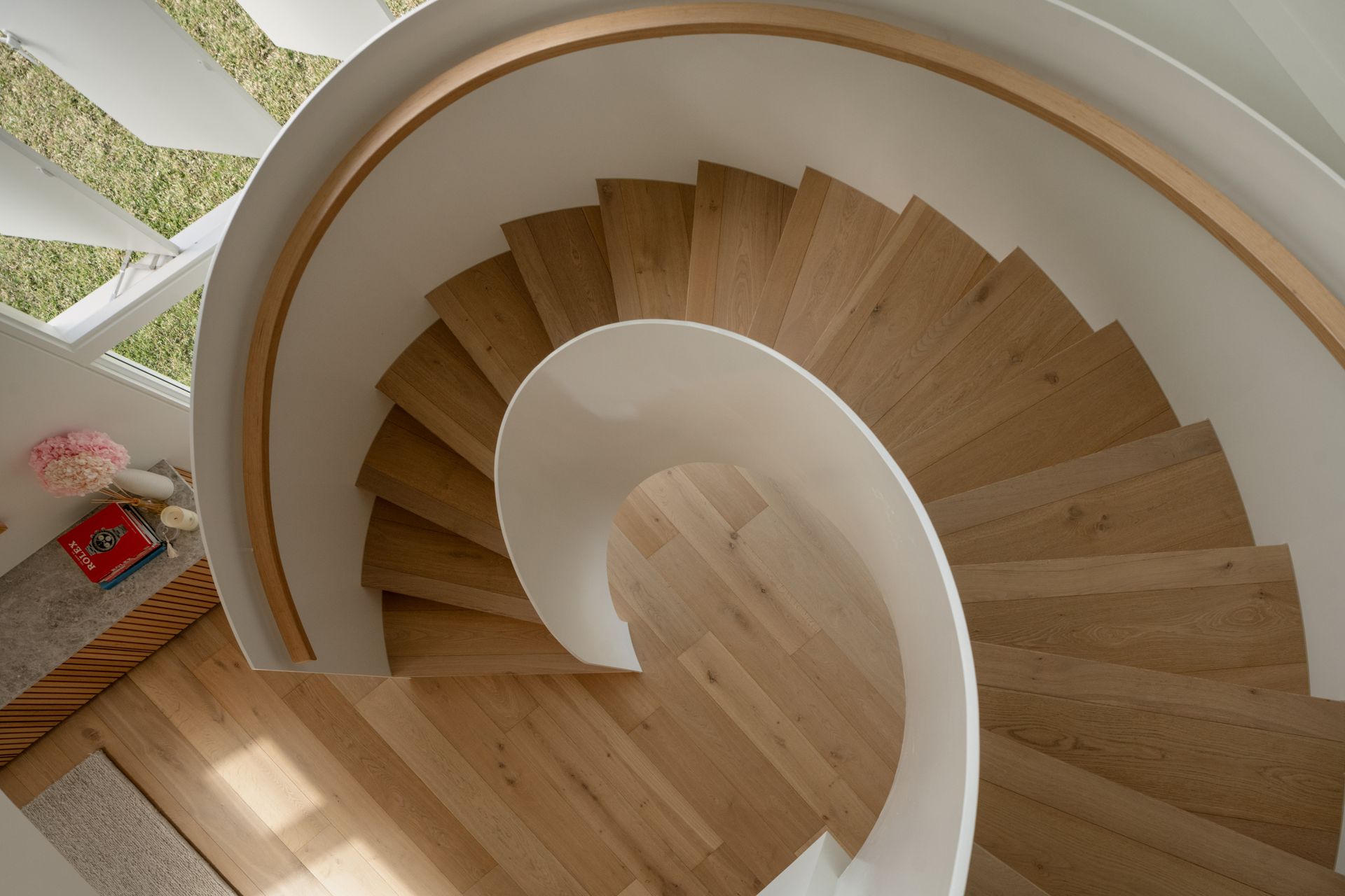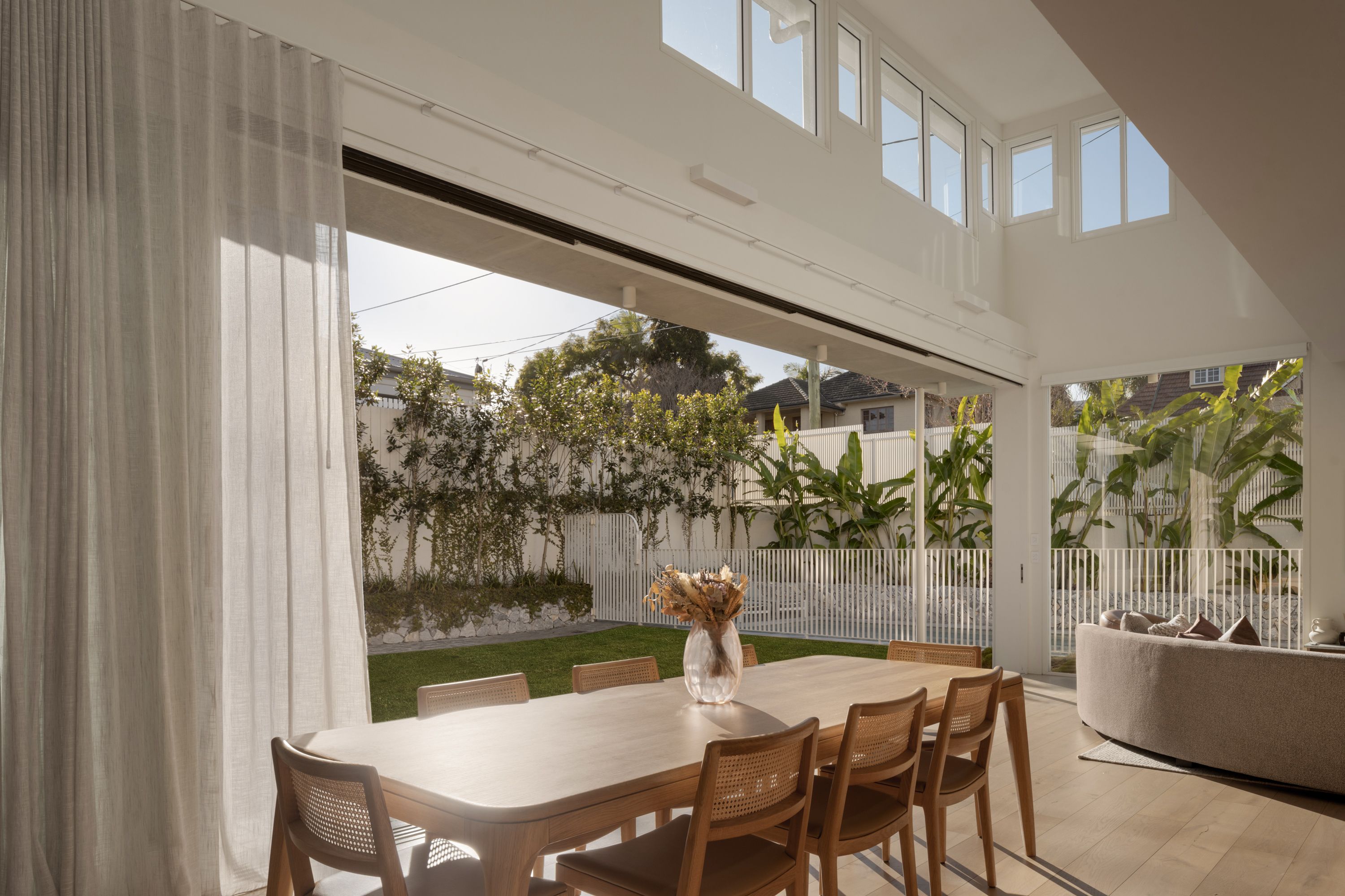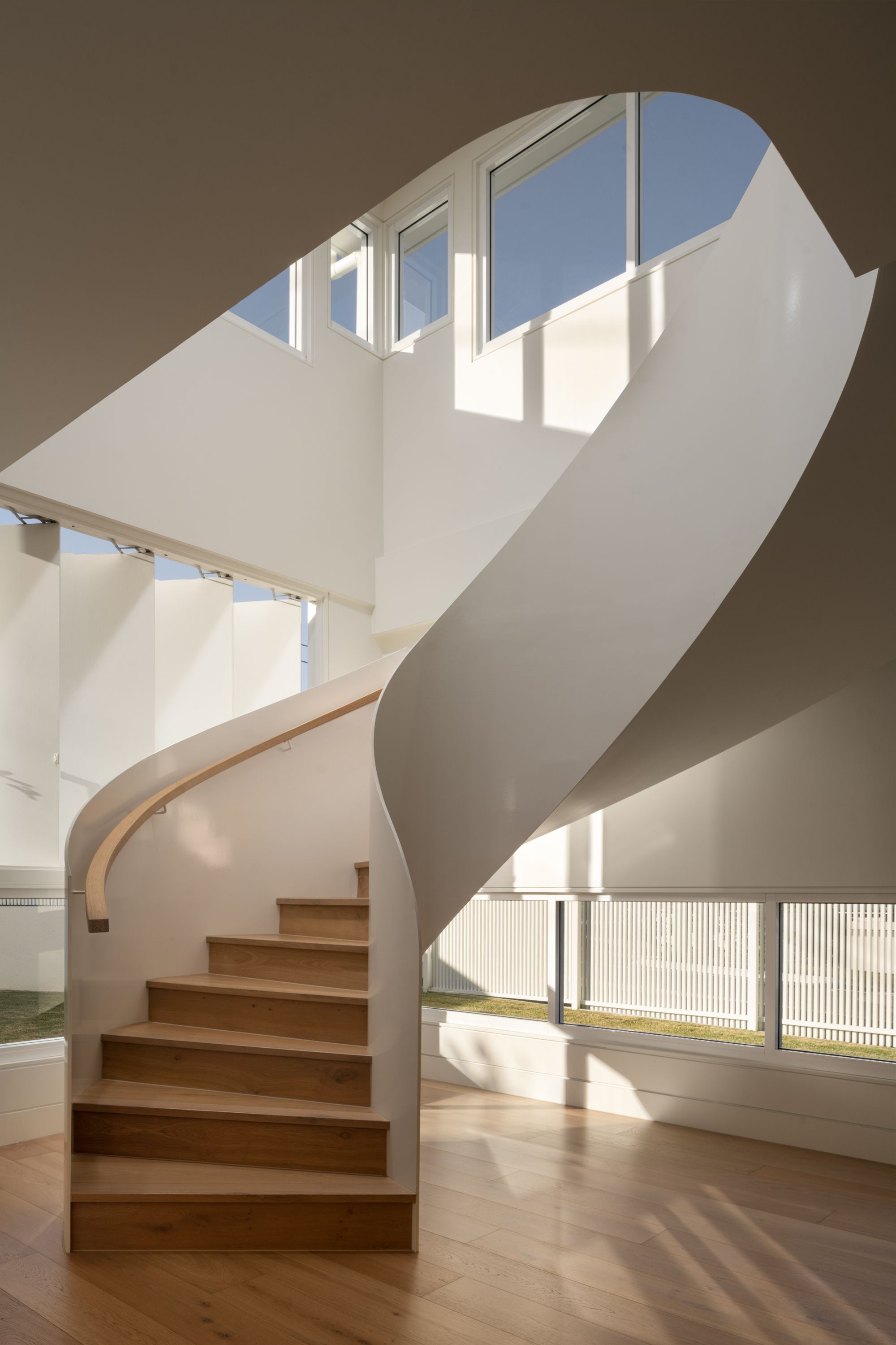 The open-plan living and dining area enjoys a light-filled North-East aspect and is grounded by thoughtful architectural detail. Soaring six-metre ceilings over the dining area add drama and grandeur, while a curved steel staircase provides a sculptural centrepiece. Full-height timber-framed doors connect the indoors to the outdoors seamlessly.