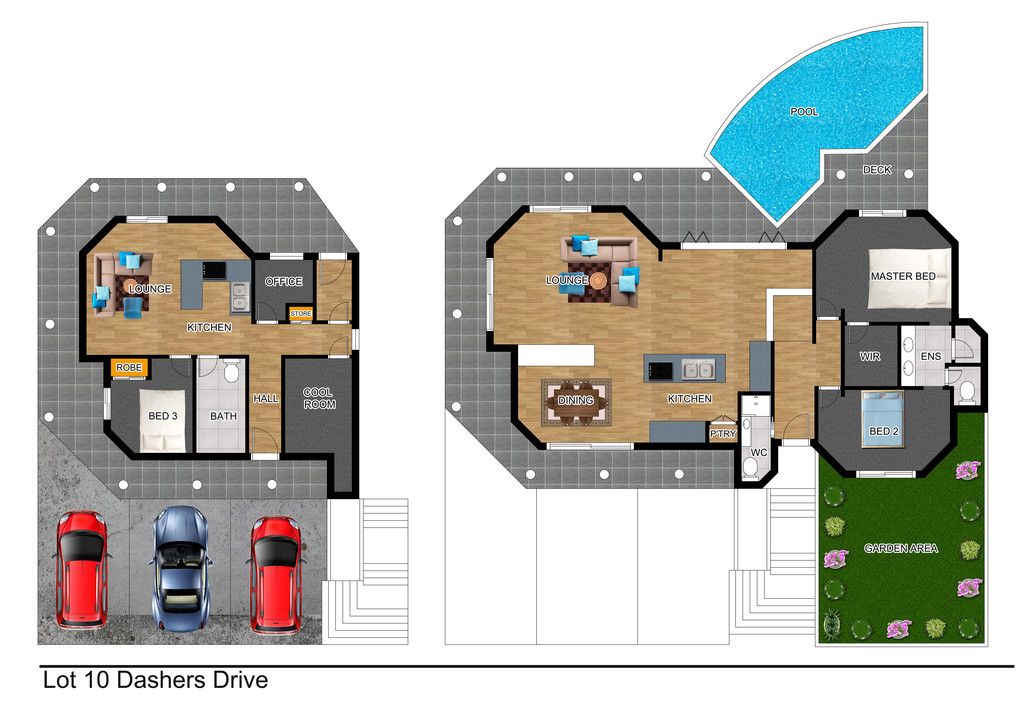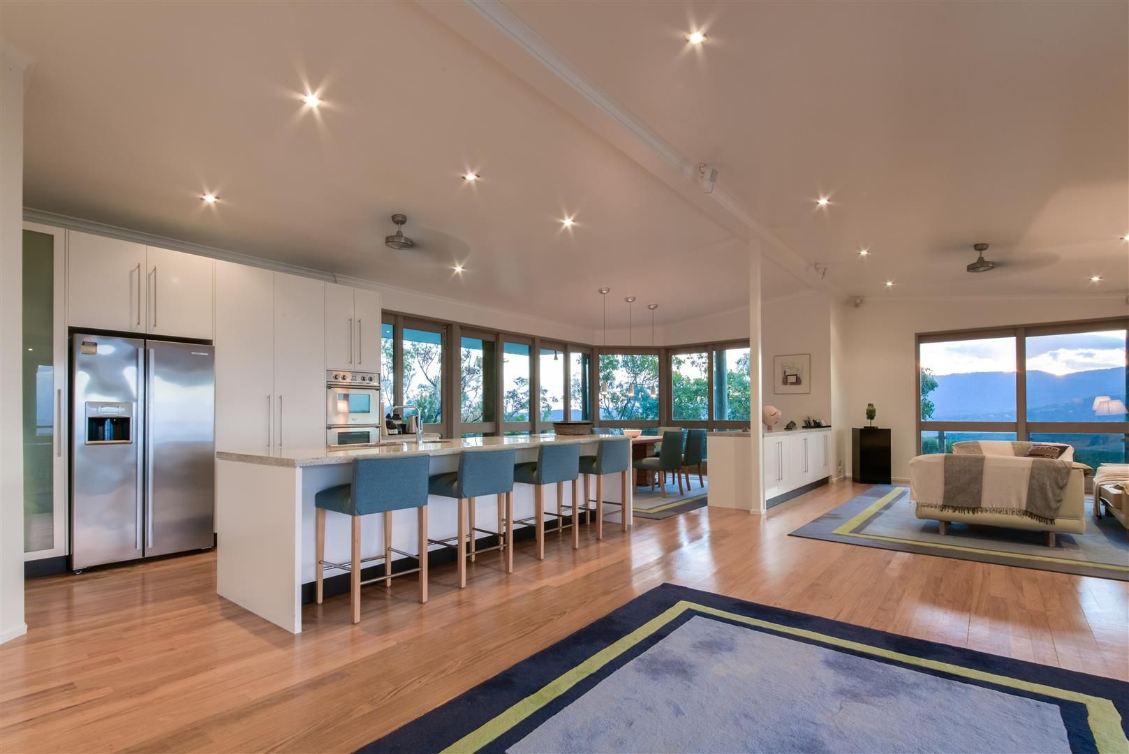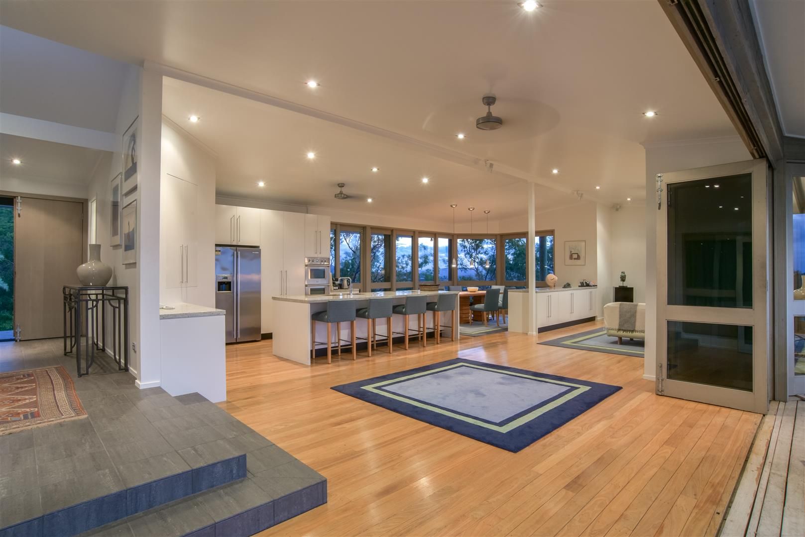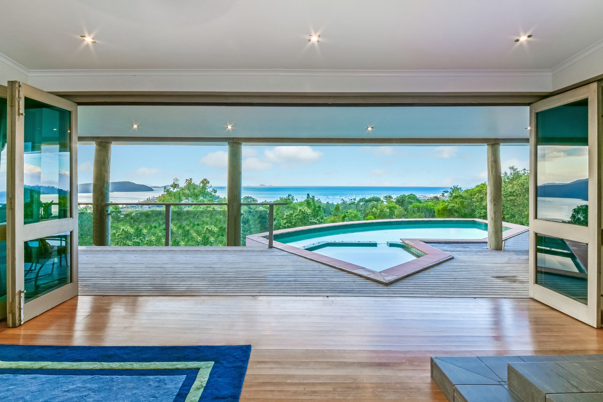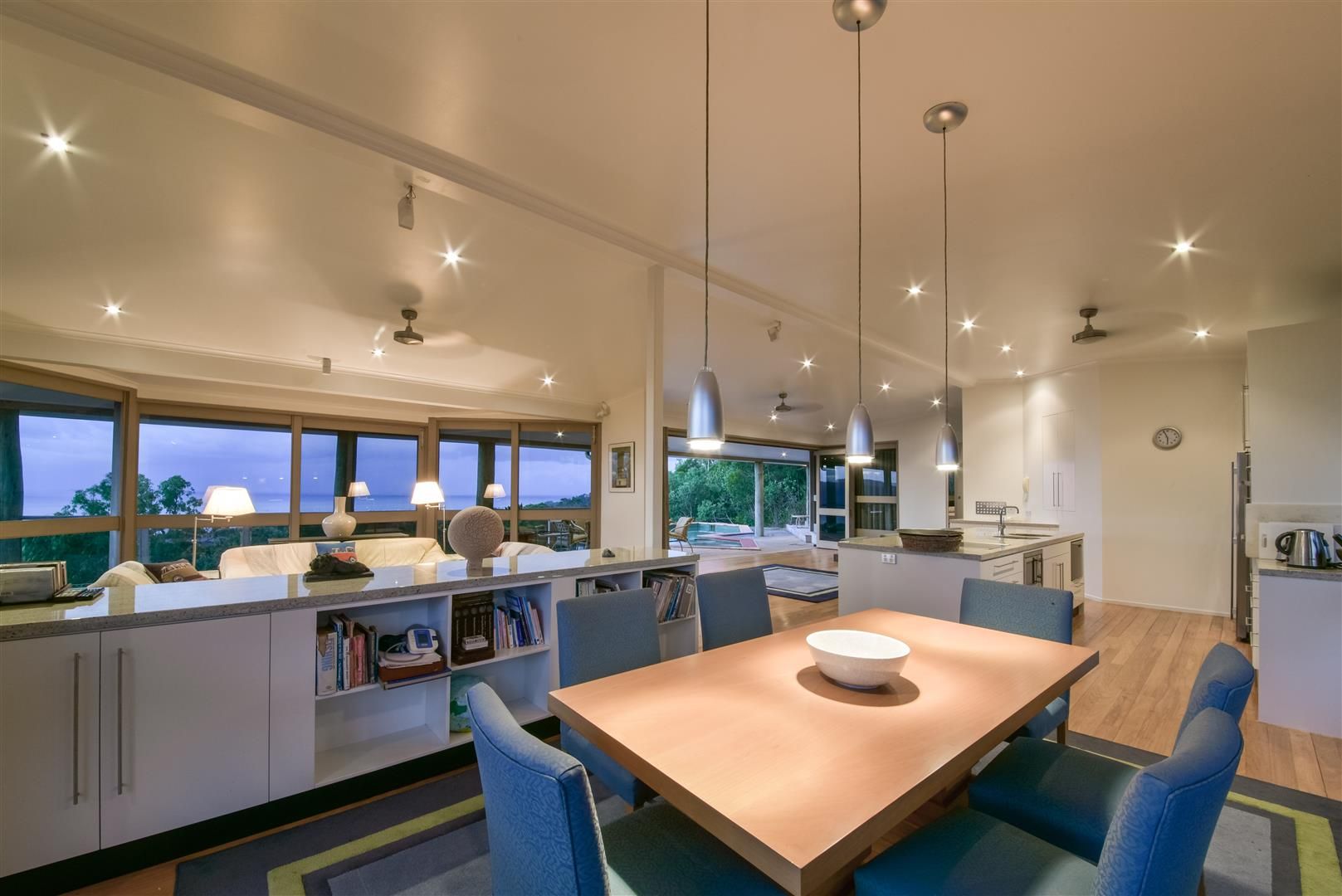 Views and natural light cascade through the glass doors on all sides of the living areas with more stunning views from the master bedroom.The triple stack bi-fold silky oak timber doors open out to the deck, pool and spa. The lower level is a self contained living area including kitchenette, office and bedroom - with space to add more bedrooms.