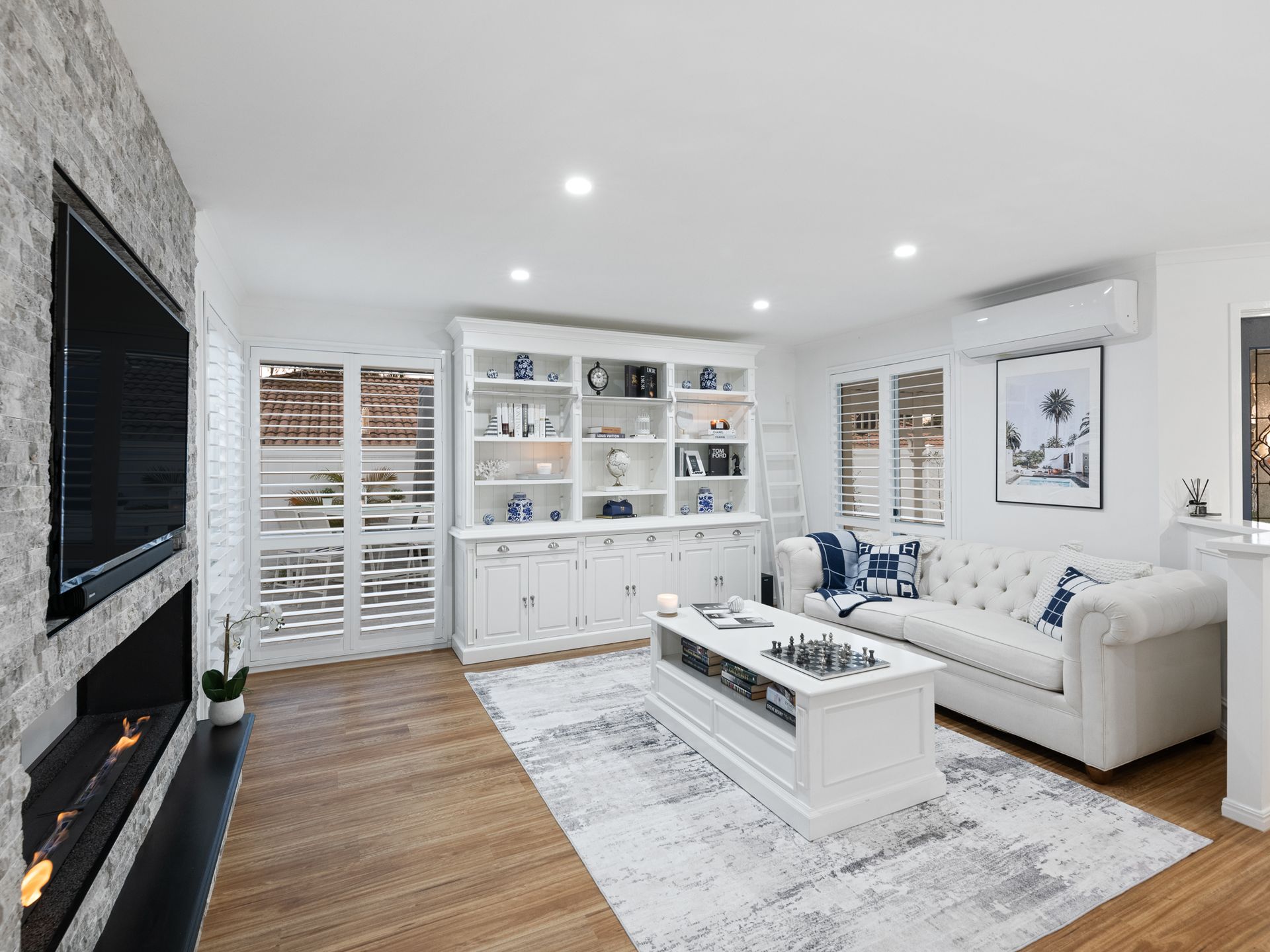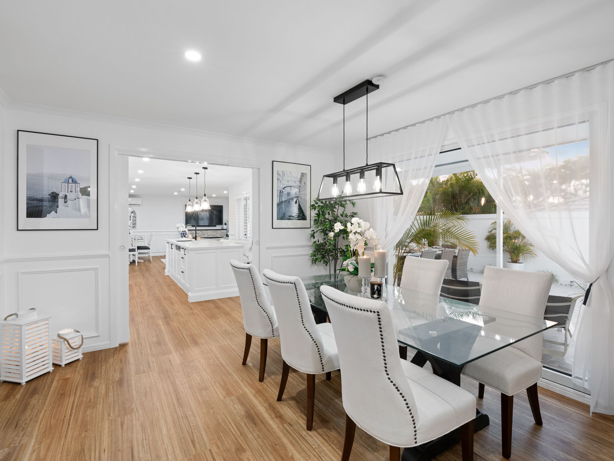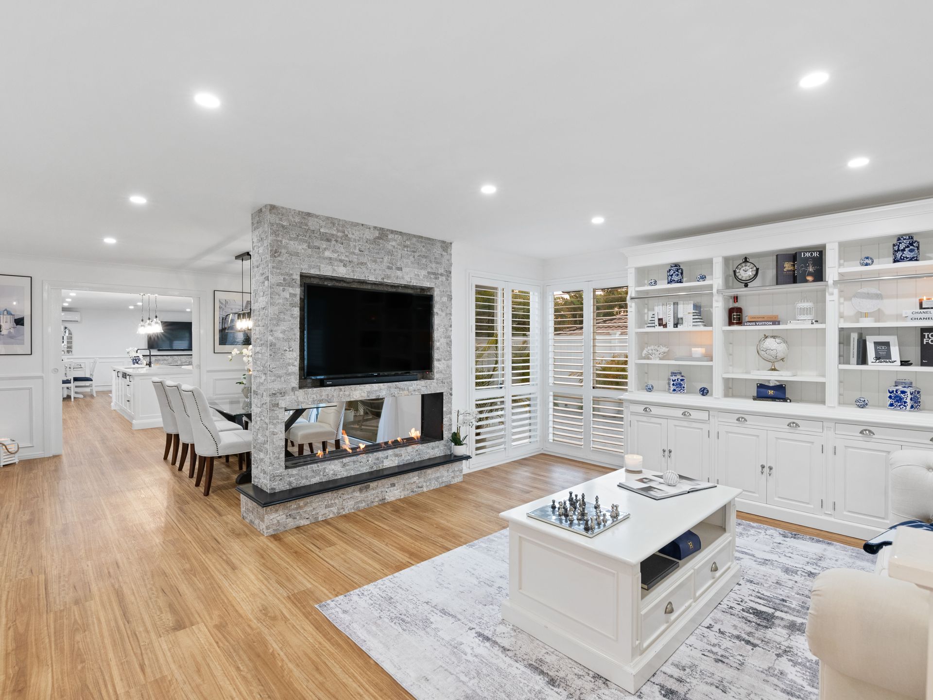 Step into a world where everyday life feels like a retreat in this beautifully reimagined 4-bedroom, 2-bathroom Hamptons-inspired home. The journey begins as you approach the stunning façade, adorned with silver Travertine pavers, imported from Turkey and laid in an elegant French pattern. This eye-catching detail sets the stage for the refined lifestyle that unfolds within.