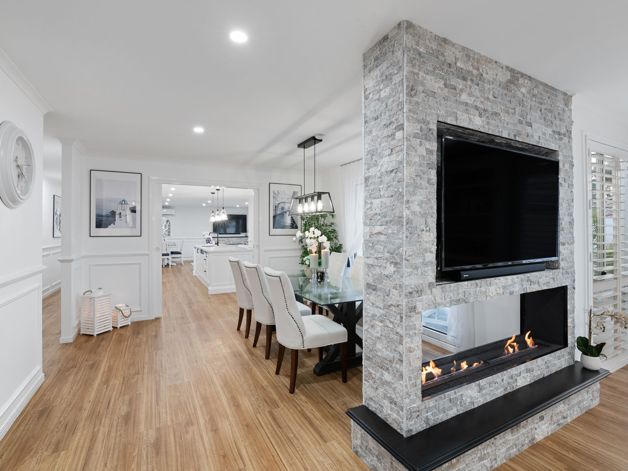 Inside, the home invites you to relax and unwind in an open-plan lounge and dining area, where a stone feature inset fireplace creates a cozy ambiance perfect for both quiet evenings and lively gatherings. The space naturally extends to a sprawling outdoor entertainment area under a sleek flyover roof, making indoor-outdoor living seamless and effortless.