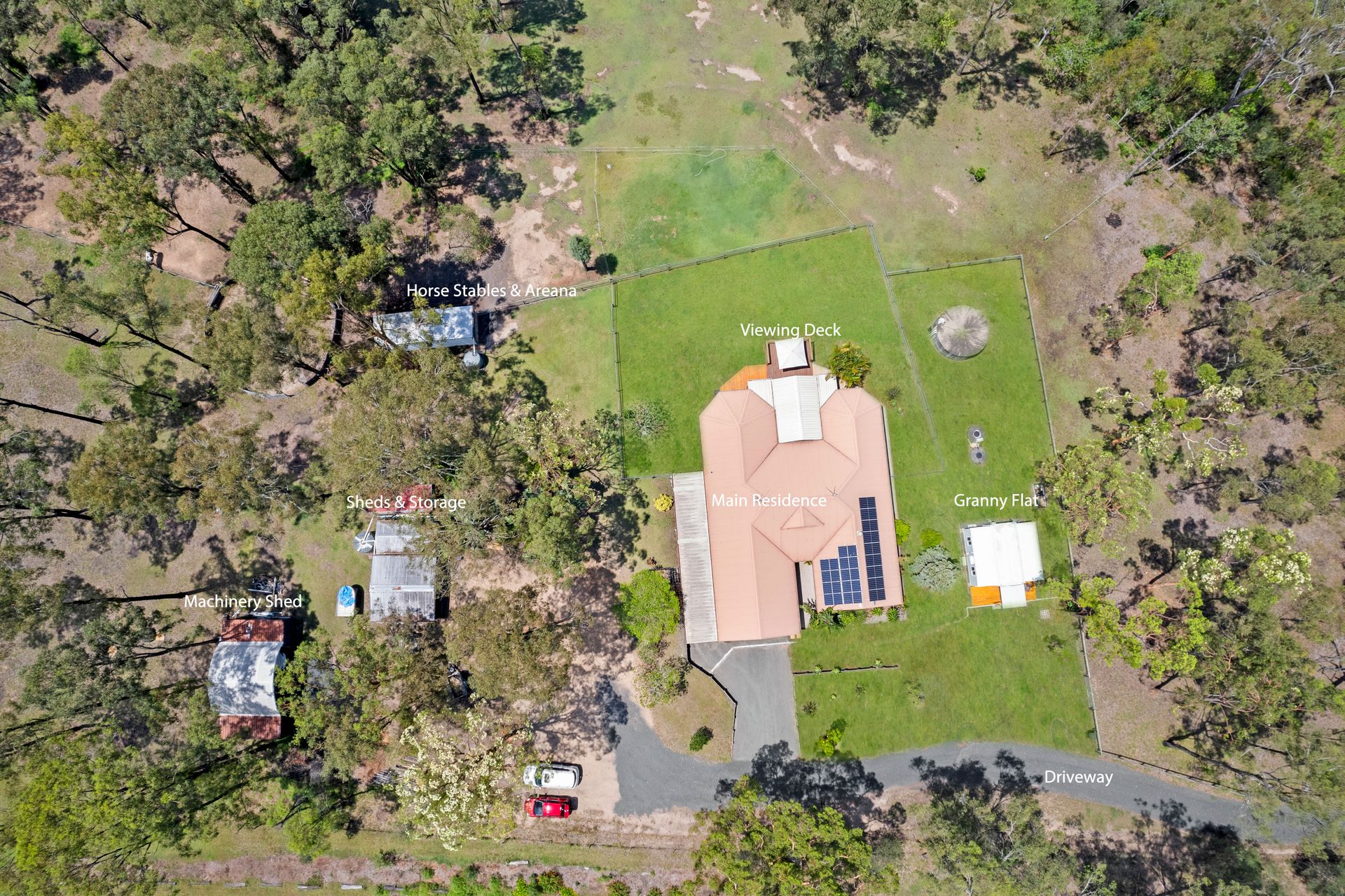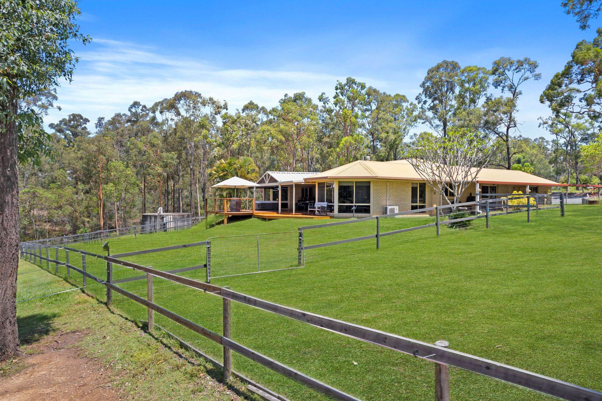 Outside - | Privacy as soon as you enter the driveway | Timber Decked entertainment area overlooking the horse paddocks and bushland backdrop | Spa | Double Tandem Carport | Double Carport | 2 x shipping containers complete with dome roof | Dog proof fencing | Solar Panels for reduced electricity