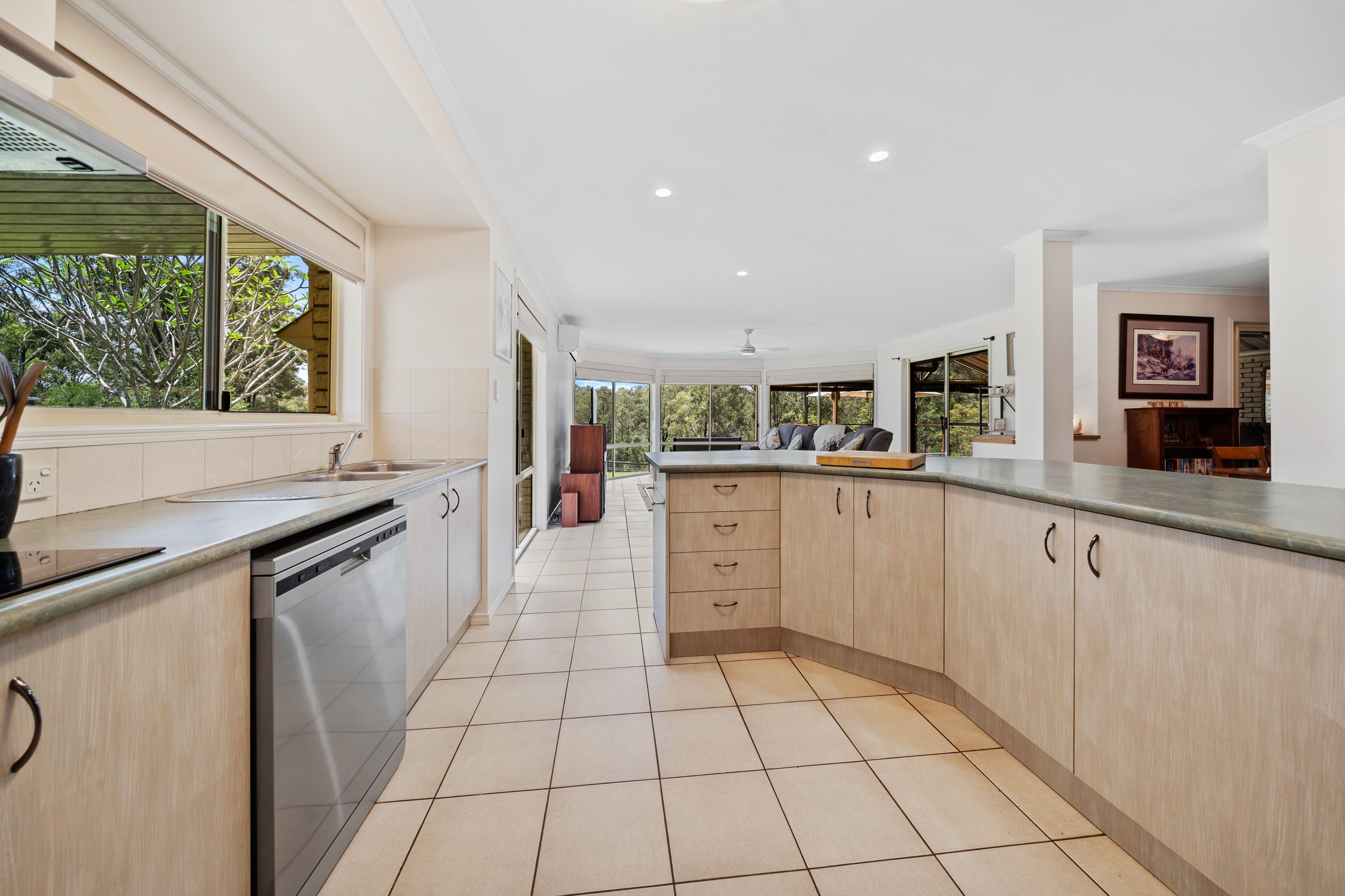Inside, multiple living areas are thoughtfully designed to provide privacy and comfort. The open-plan layout includes a bright, contemporary kitchen equipped with ample storage, and a large island bench. The main living area flows seamlessly to the private outdoor entertaining space, perfect for alfresco dining or relaxing while taking in the tranquil bush views.