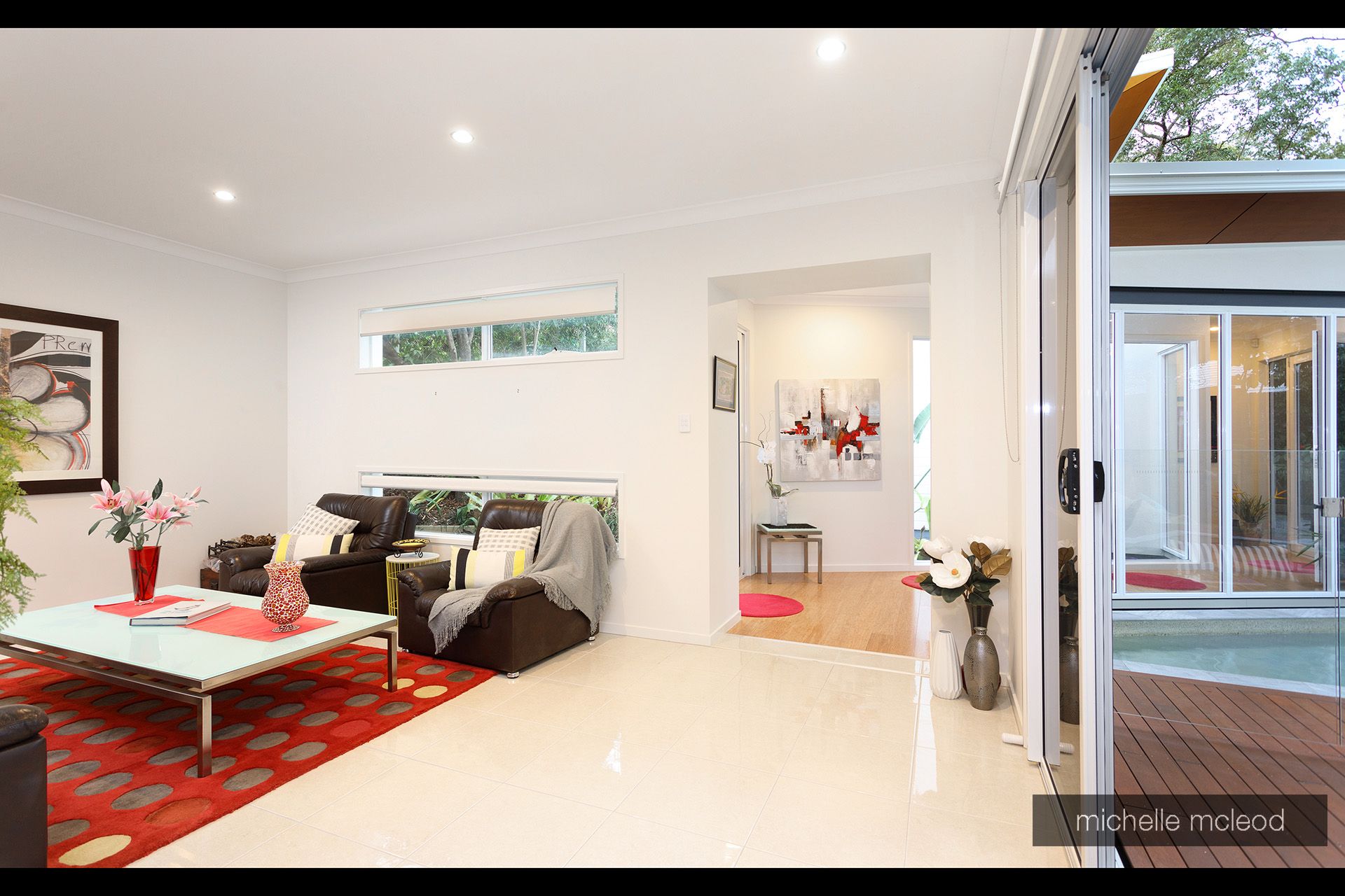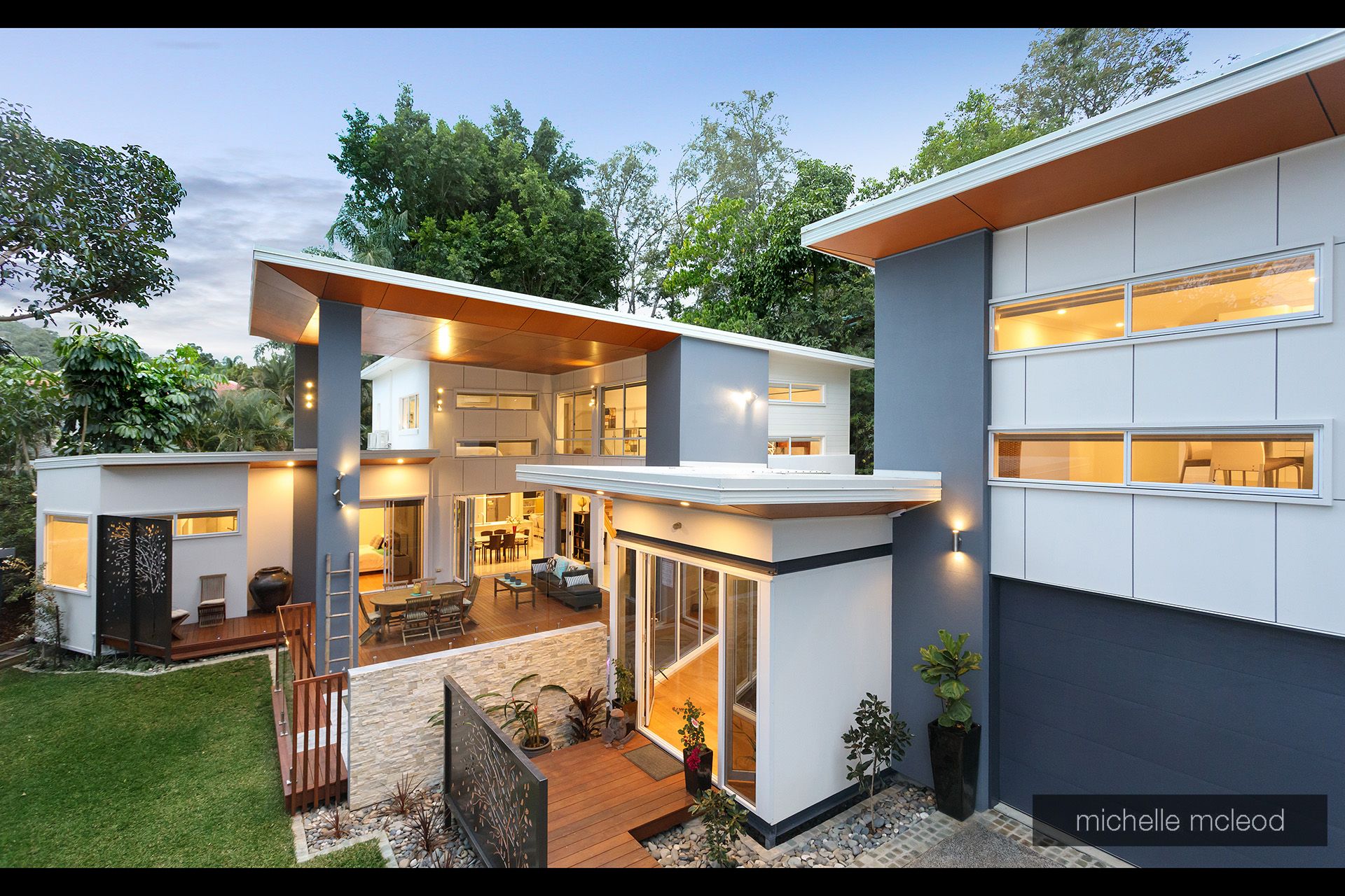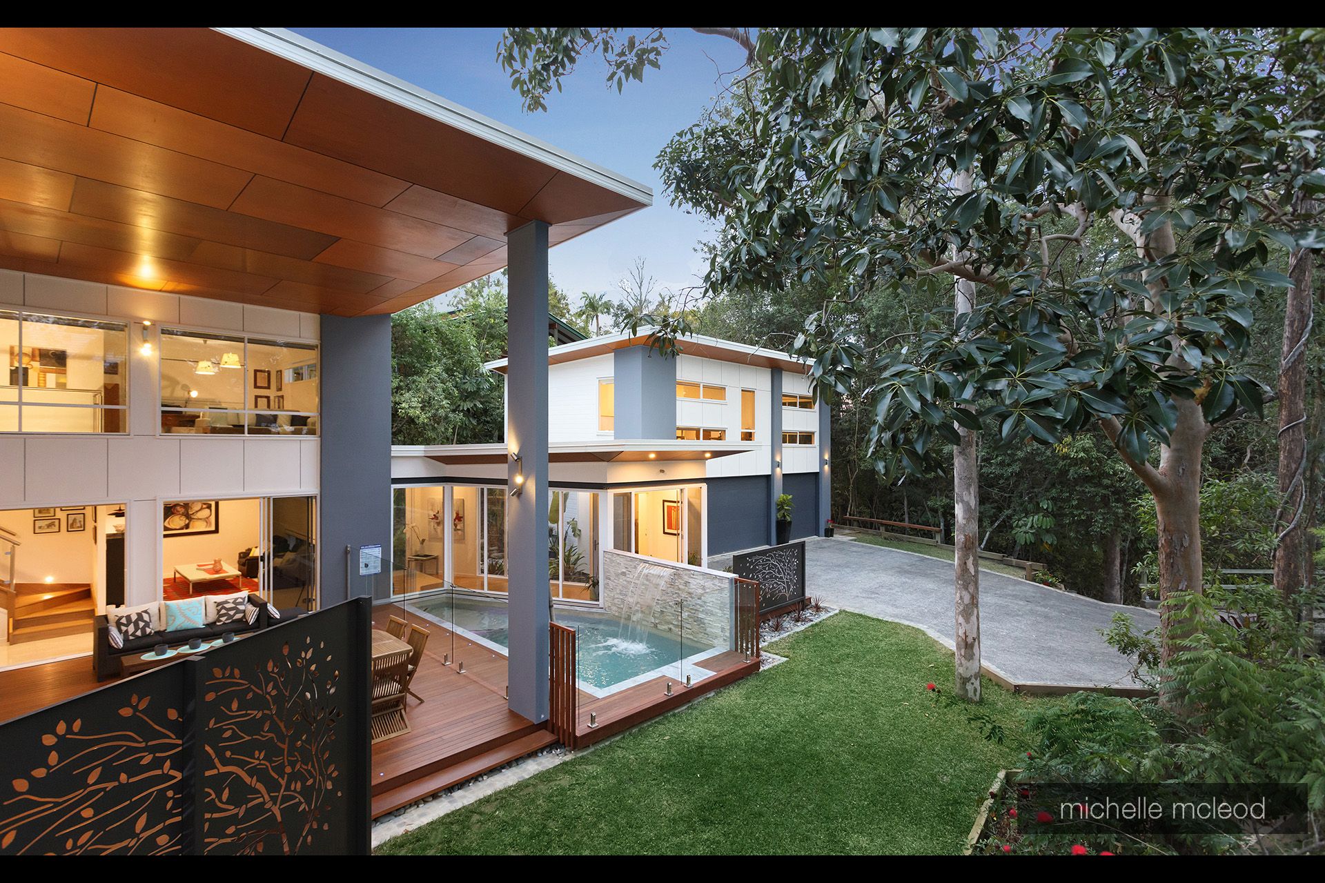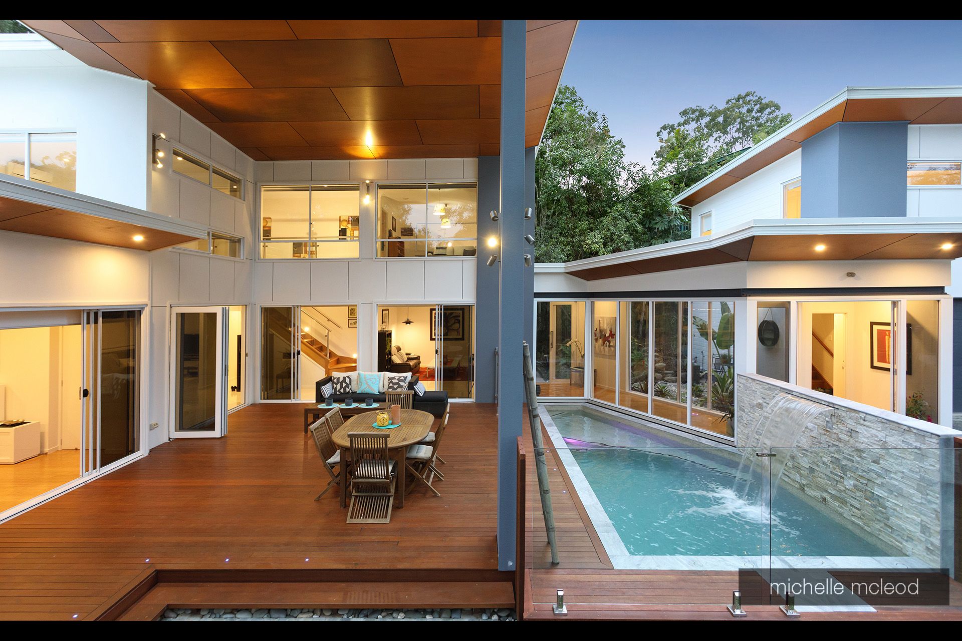As you cross your own private bridge you are surrounded by lush green bush and established gardens which keep the environment cool. The striking design immediately captures your attention with the walls of glass and soaring ceilings on the showpiece deck by the side of the sparkling plunge pool.