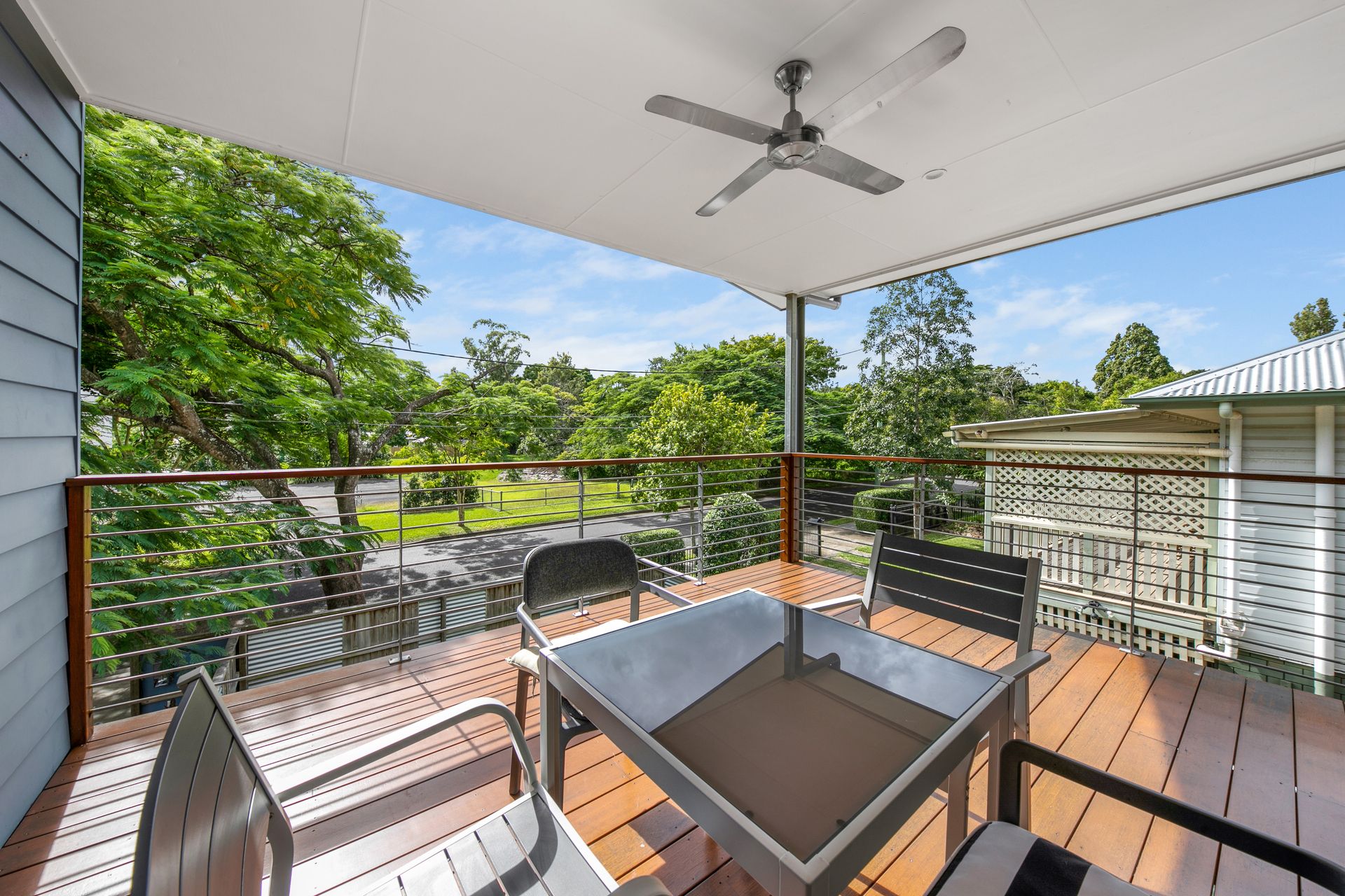 Stepping out to your North facing balcony, residents can enjoy alfresco dinners here or drinks with friends while supervising kids in the front yard and admiring the tree-lined views.