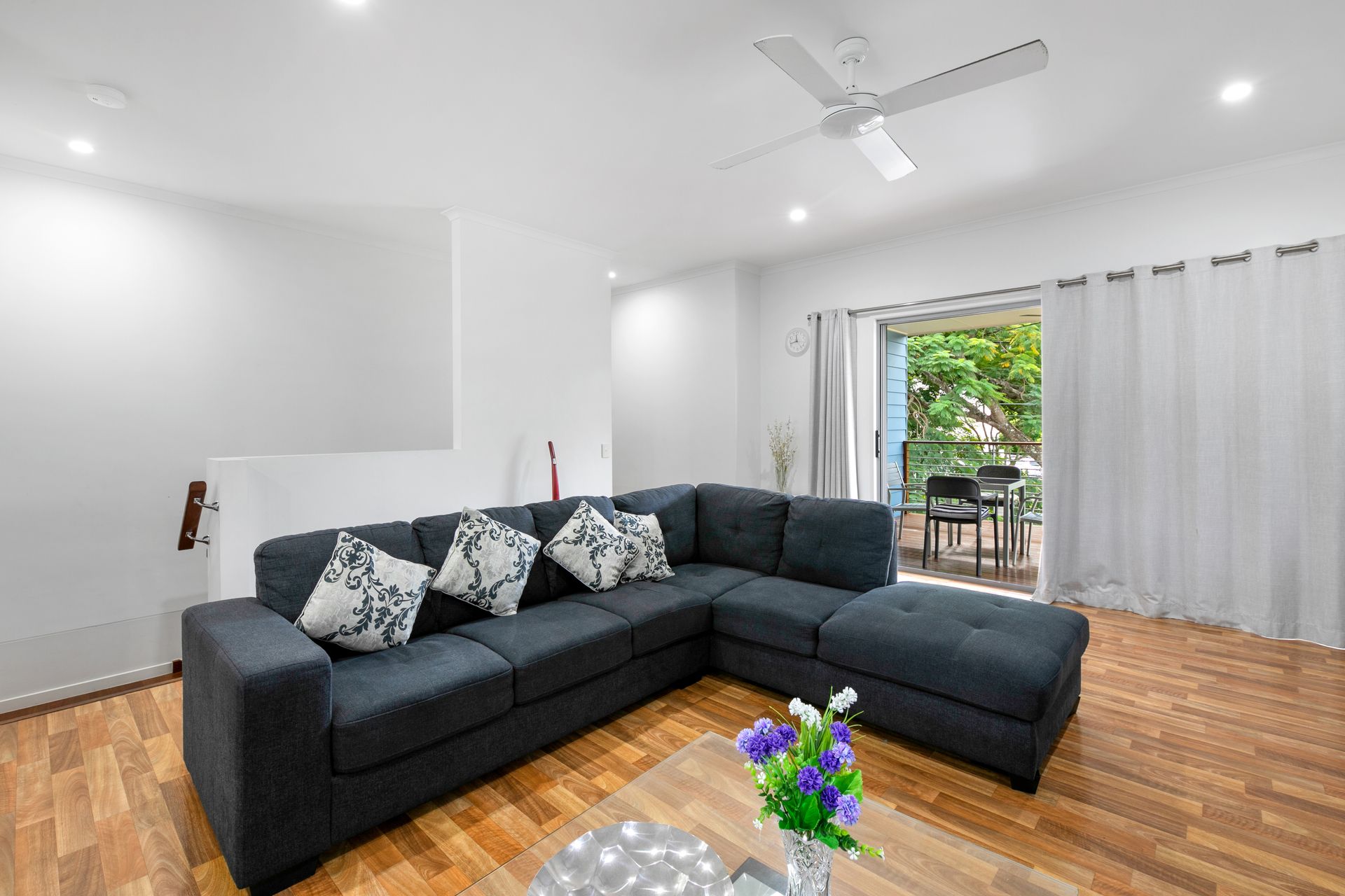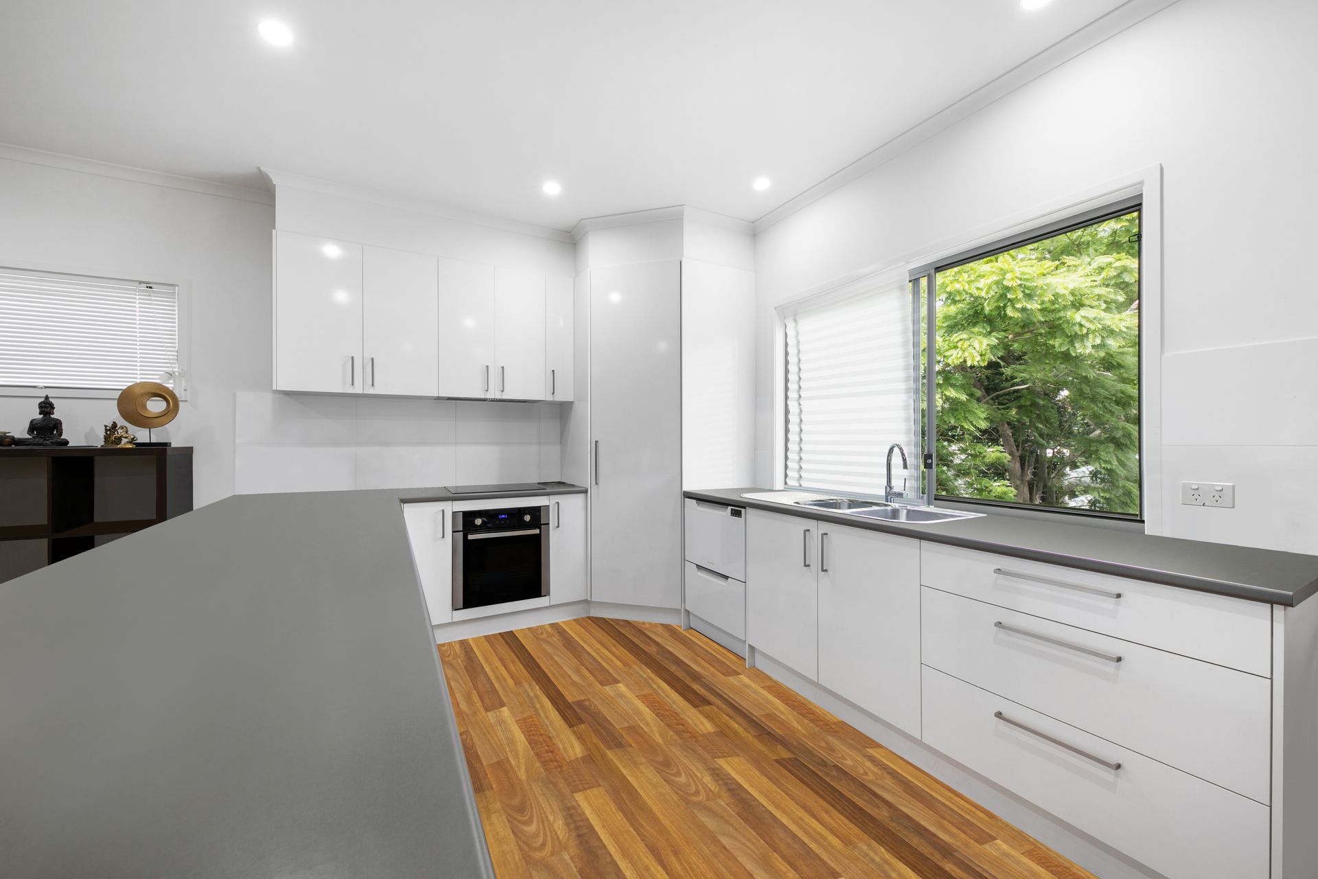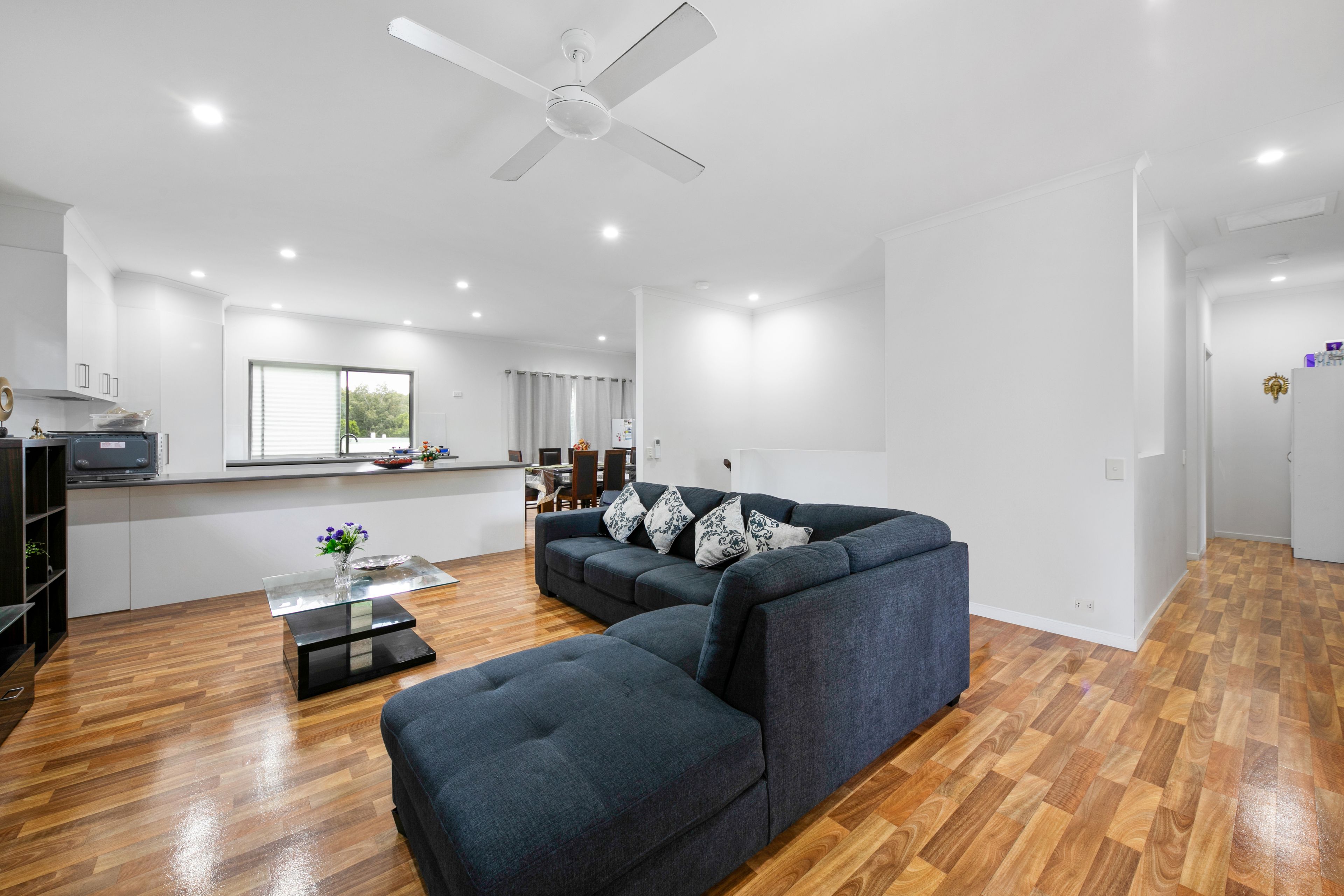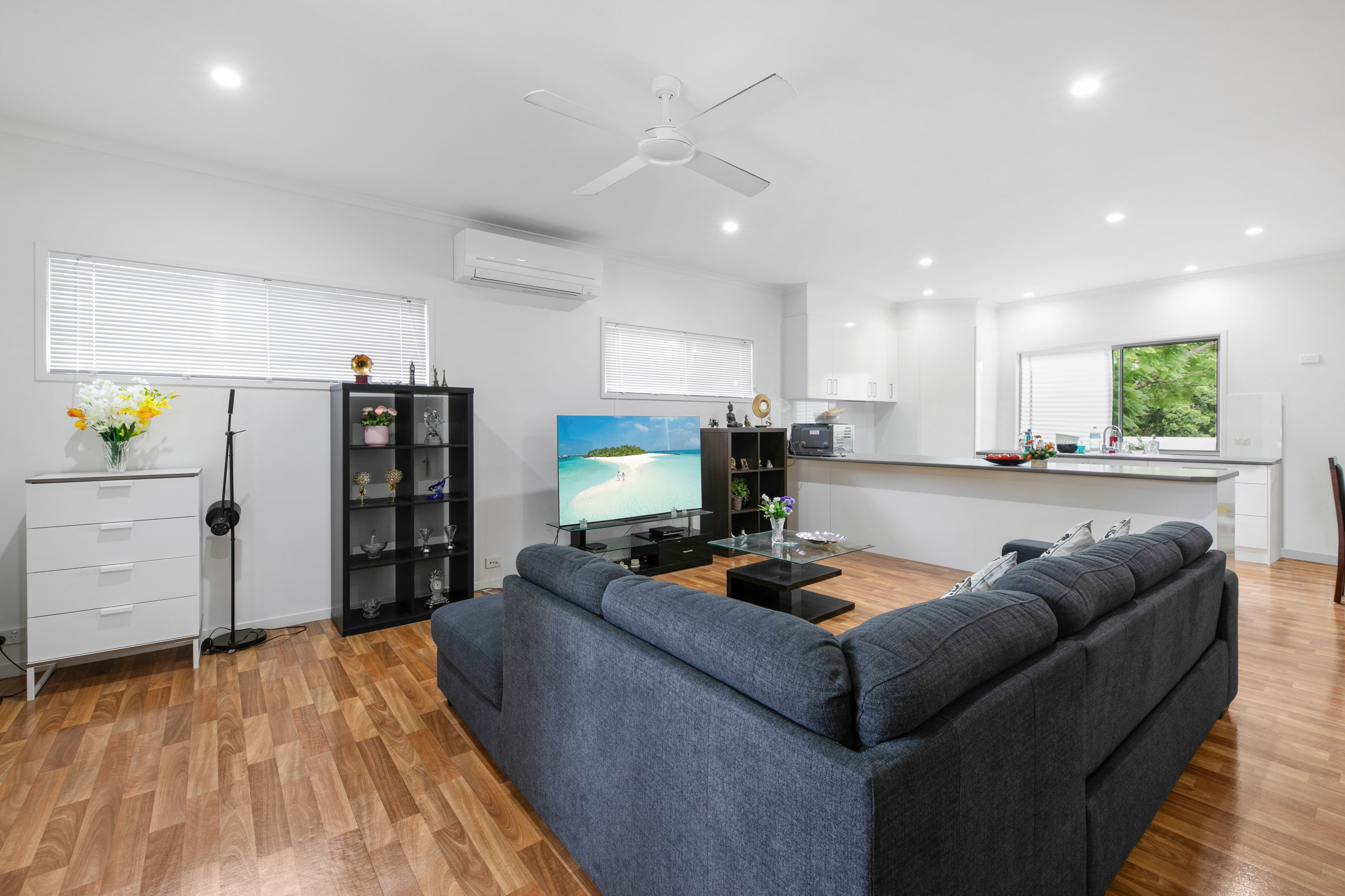 Adjoining the living space is the bright and airy kitchen appointed with large benchtops, sleek cabinetry and stainless steel appliances.