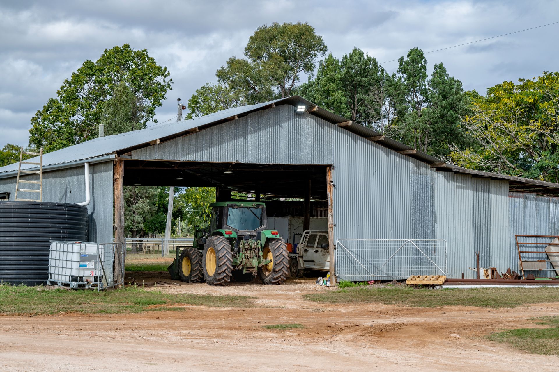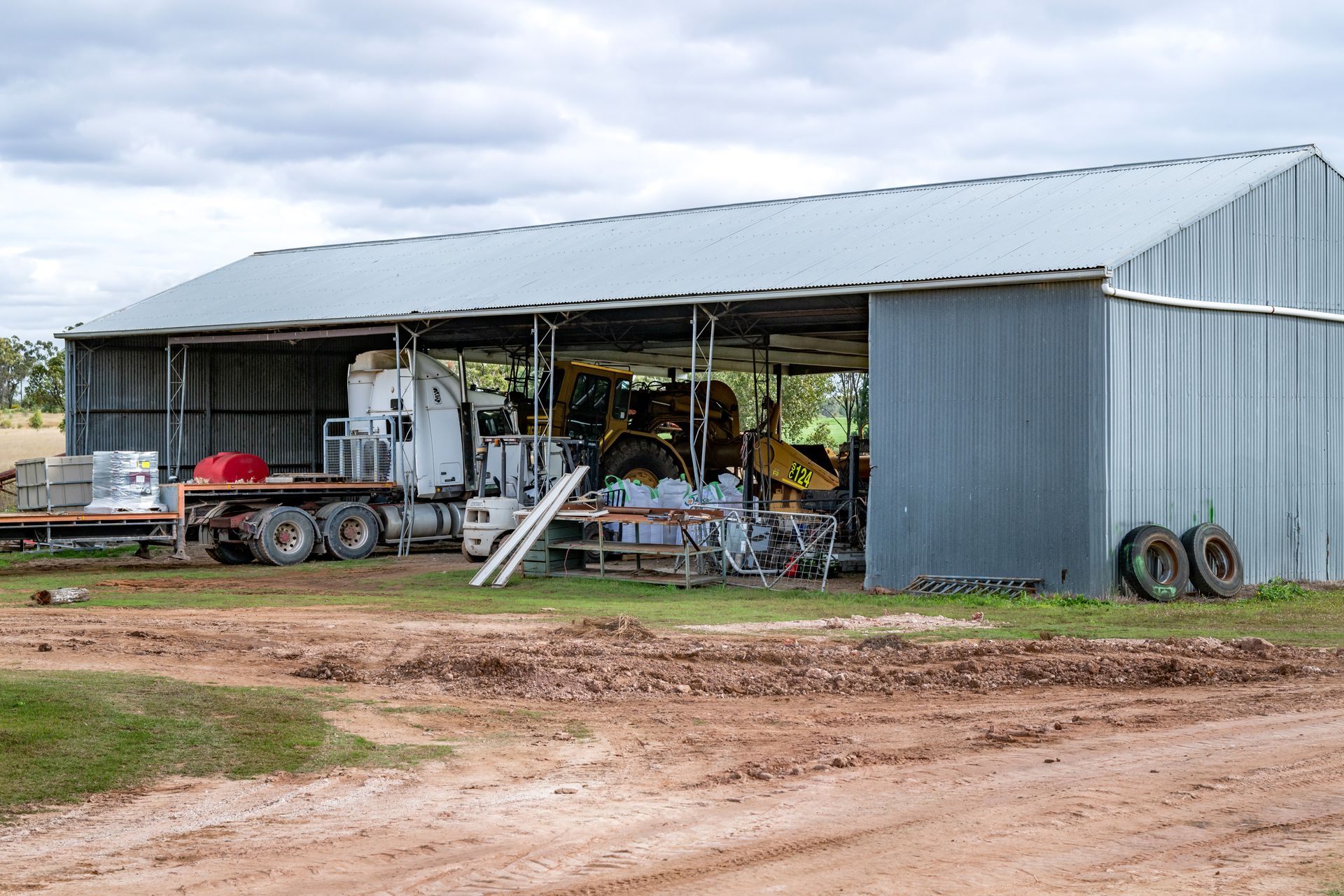 Machinery shed / workshop 1: • 27.5 m x 9 m x 5m, steel and timber frame, enclosed 2 sides with CGI gable roof, car hoist, gravel base,15amp power and L.E.D. lights. • 5,000 gallon concrete rainwater tank connected. Attached skillion: • 19m x 8m steel and timber frame, Colorbond roof.