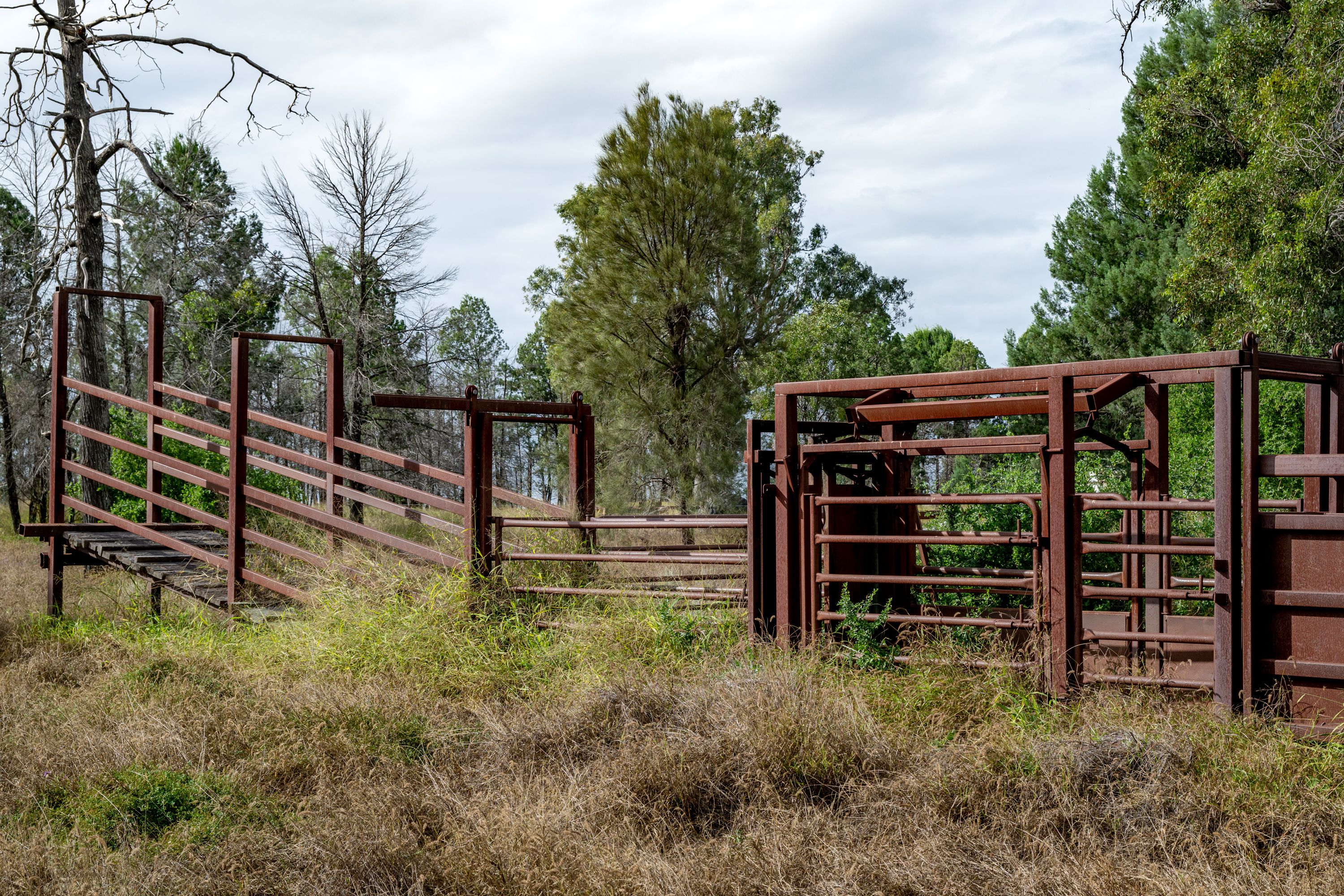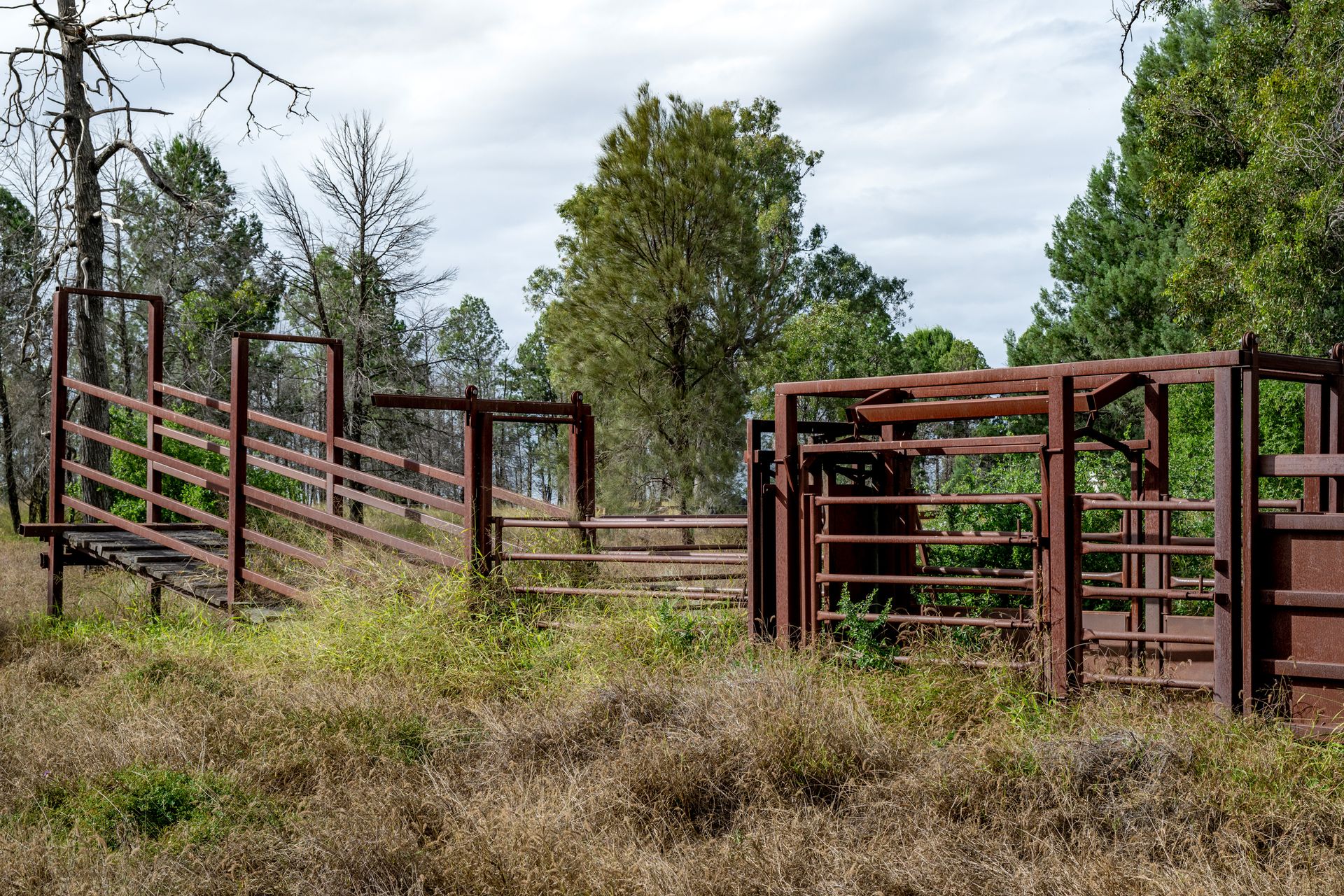 Livestock Handling: Set of steel cattle yards with vet crush, scales, drafting pound, race and loading ramp, calf branding cradle.