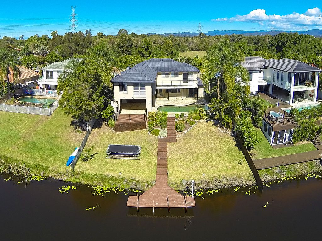 Additional features include; laundry, study nook, ducted and zoned air-conditioning, soaring entry foyer, intercom, front and back lawn, tropical gardens, built-in speakers and BBQ, timber floors and shutters, front gating, secure remote garaging for two cars, Nerang River access, and excess storage space throughout.