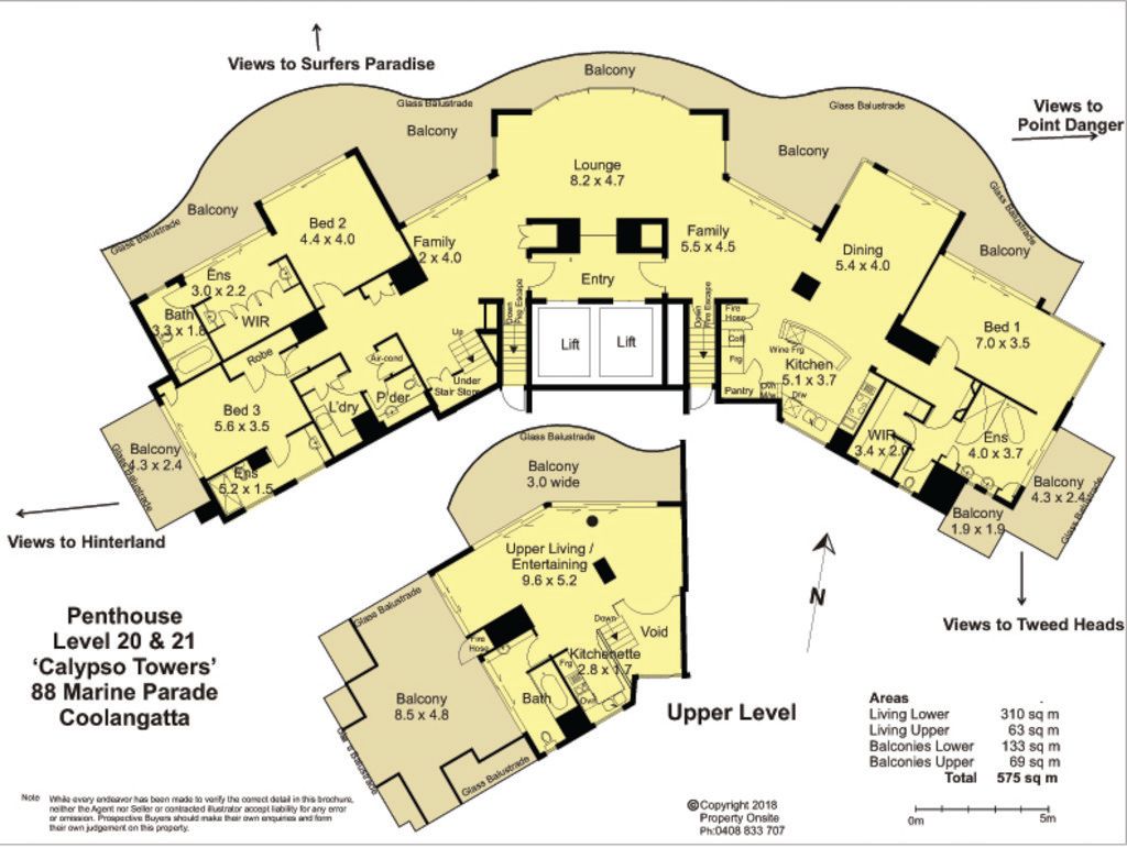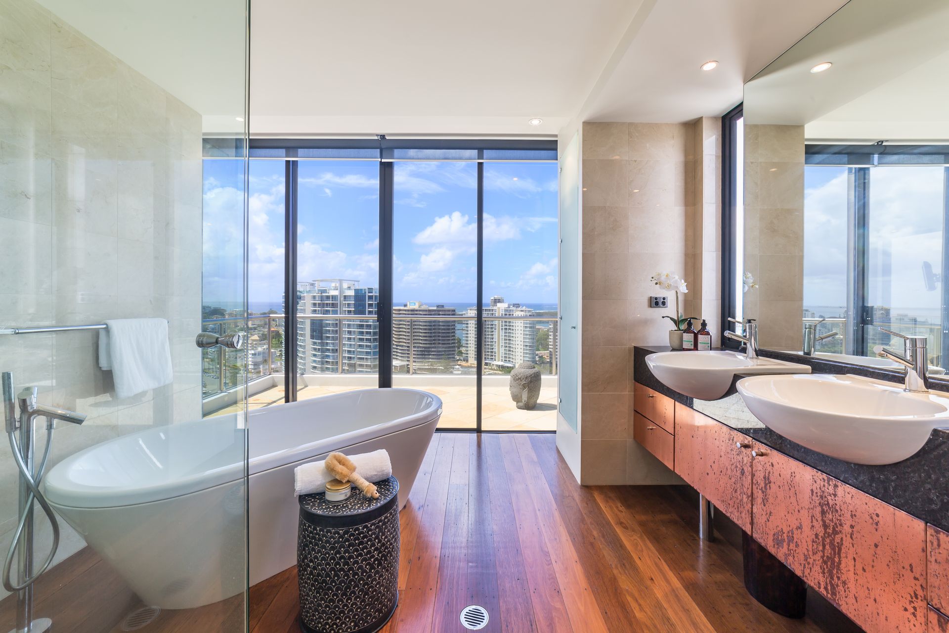 • Spacious penthouse nestled on the 20th and 21st floors of the renowned Mantra Coolangatta • No expense has been spared in the architectural design of this sophisticated 632sqm sky-home. Skyhome with bespoke, customised finishes including imported antique wooden doors, 200-year-old reclaimed polished hardwood floors and upscale marble, granite and stainless-steel accents • Sweeping ocean, hinterland and city skyline views from every room, can never be built out • Expansive north facing wrap around balcony • Gourmet kitchen with Gaggenau and Miele appliances, including built-in oven, plate warmer and coffee machine • Light filled lounge room with 11.8ft ceilings, framed by floor to ceiling glass • Entry vestibule flanked by 100-year-old wrought iron ornate pivot gates • Master suite with full length glass windows, sweeping views, 2 balconies, ensuite fused with copper, granite and marble tones plus a bespoke dressing room • Bed 2 & 3 with ensuites, balconies and distinctive robes • One-of-a-kind unique stainless-steel staircase which leads to top floor entertaining retreat • 2 x top floor sundrenched terraces + kitchen, bathroom and dining/entertaining area • Powder room, ample storage, laundry, ducted air • Three dedicated car spaces next to large lock up storage • Access to Mantra Coolangatta facilities including tennis court, pool and spa, sauna, gym & BBQ facilities • Prime central location, opposite beach and easy stroll to local cafes, shops, restaurants and more