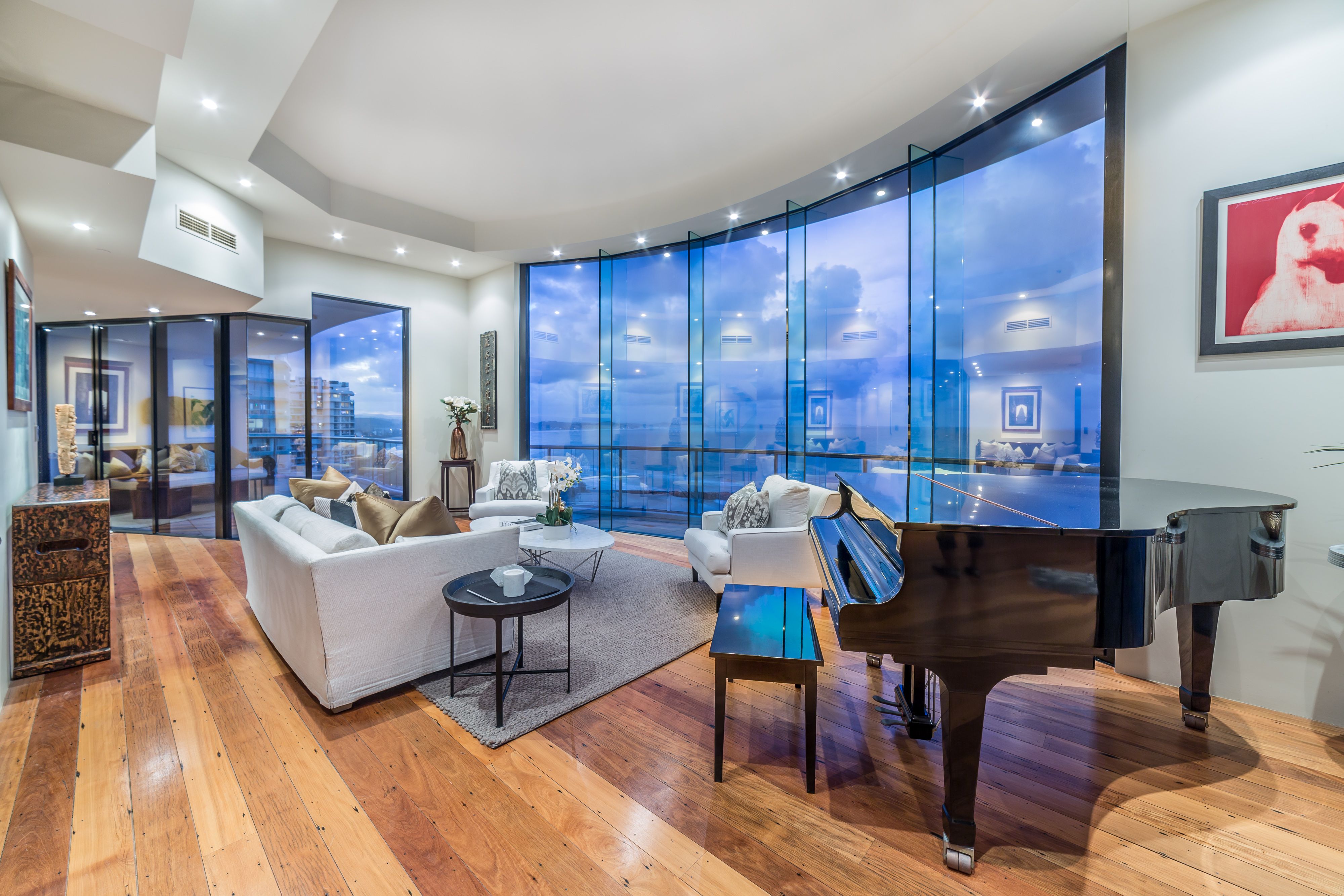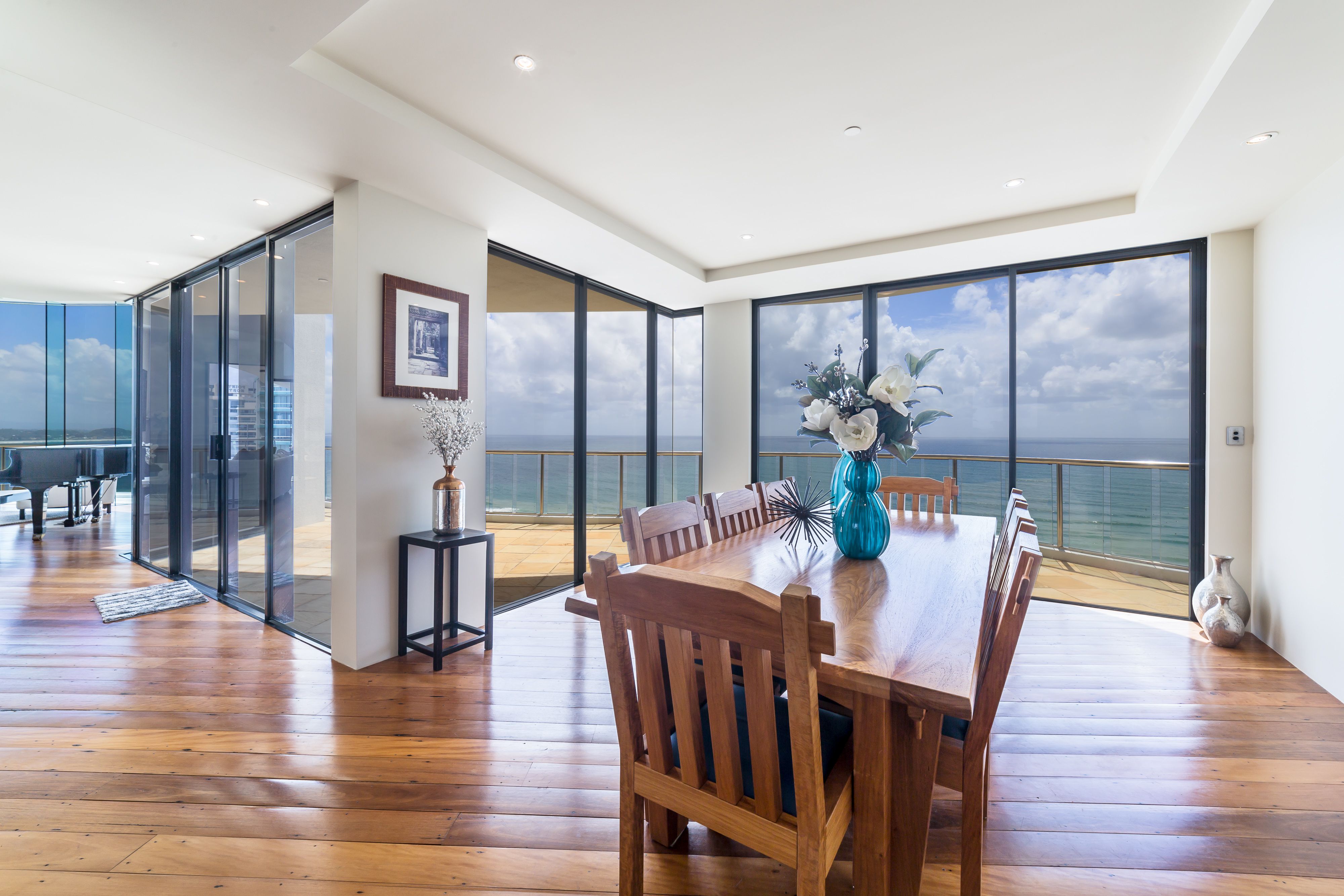 Boasting picture-perfect panoramic vistas which encompass the iconic Gold Coast skyline, hinterland and azure Pacific Ocean and stretch as far north and south as the eye can see, these superb views are framed by floor to ceiling windows and doors and can never be built out. You'll linger a while in the ambient lounge room with 11.8ft ceilings, mesmerized by the rolling waves and white stretches of sand below, or enjoy cooking up a feast in the gourmet kitchen. An intriguing mix of angles and soft curves, it features acclaimed Gaggenau and Miele appliances, and flows to the dining room and terrace beyond. You'll also be spoilt for choice whether to host family and friends here or on the top floor entertaining area. Situated as you ascend the one-of-a-kind stainless-steel staircase, it comes complete with full kitchen and bathroom facilities, two spacious, sundrenched terraces and an indoor dining area set against the superb 360-degree backdrop of coastal, hinterland and skyline views.