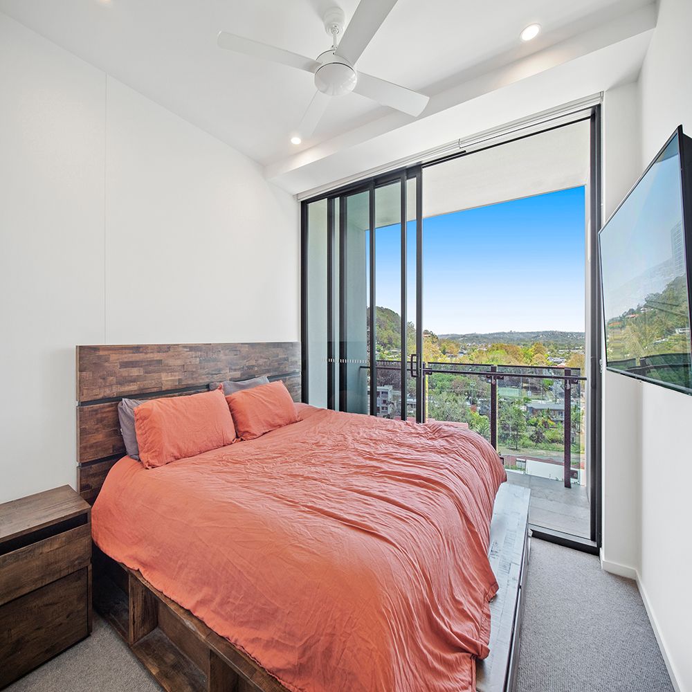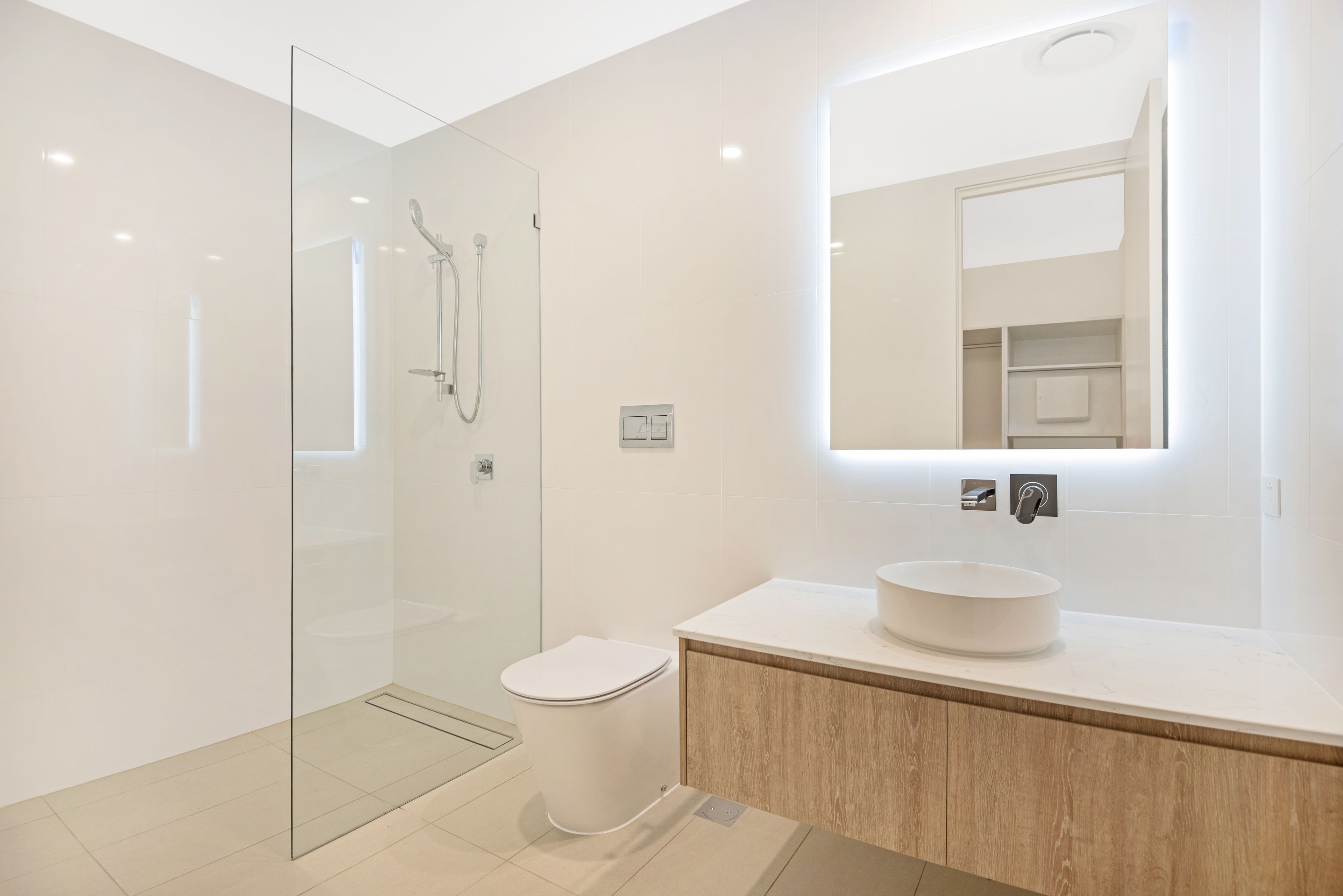 The layout boasts 104sqm of living space including an open-plan kitchen, dining and lounge with walls of glass and direct access out to the balcony. The kitchen is sleek and stylish, showcasing an island, high-end appliances and ample storage.