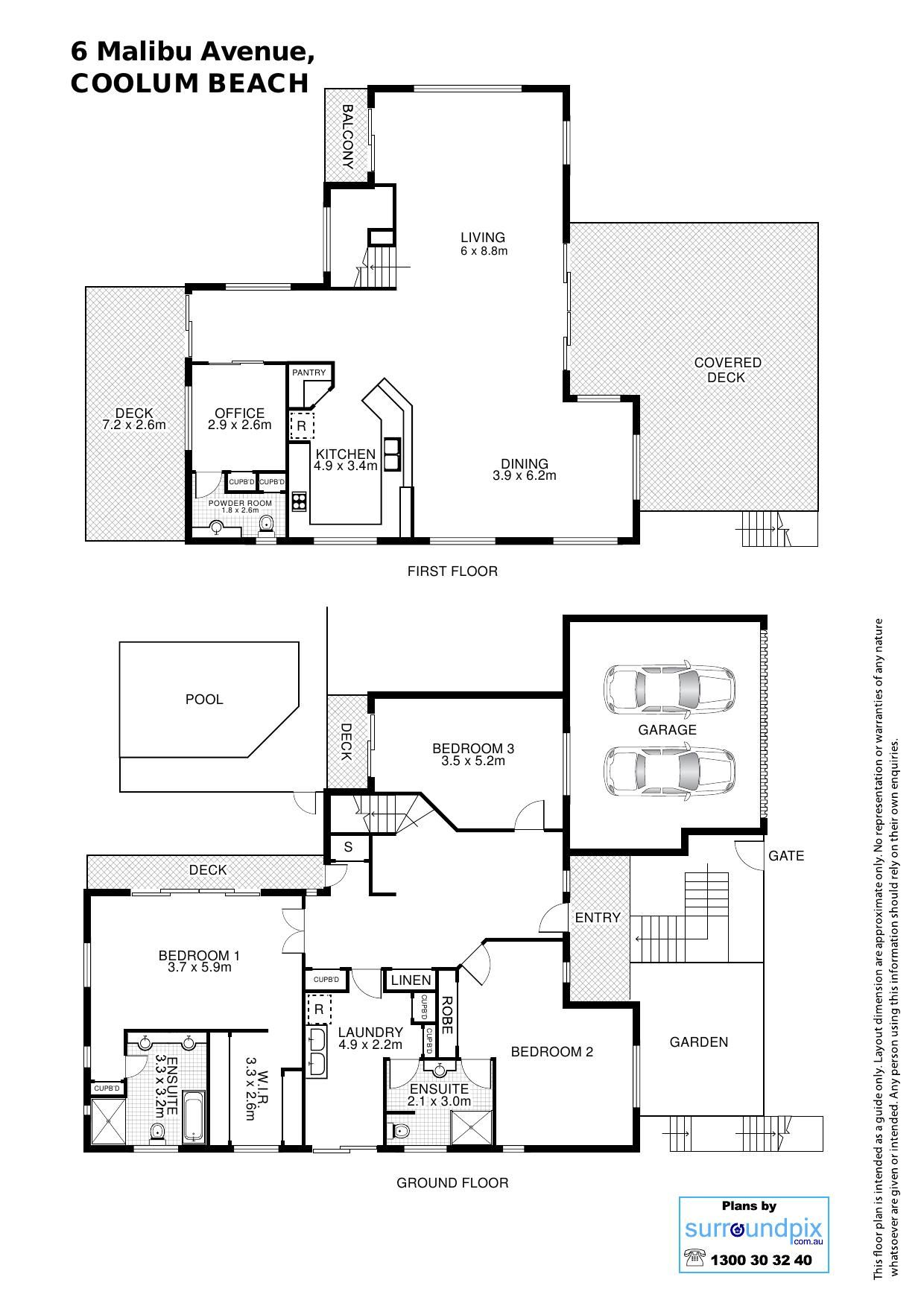 + 3 bedrooms + Study + Double story + Extensive cupboard spaces (6 incl. linen) and W.I. robe areas to bed 1 & 2. All cupboards & robes are Melamine lined. + 90 mil timber, (treated) framing with fibro clapping. + Plywood bracing/ cladding to all external walls + Aluminum foil insulation and batt insulation to all external walls and roof + roof space. + Separate garage, covered carport and external parking/ storage + 2 x 2,500 l rainwater thanks, with individual pumps for hose access. + 50 year termite foil protection, with added protection from design features + New electric, water, telephone, sewage and storewater connections to mains. + Ceiling fans throughout and also in 2 x main decks.