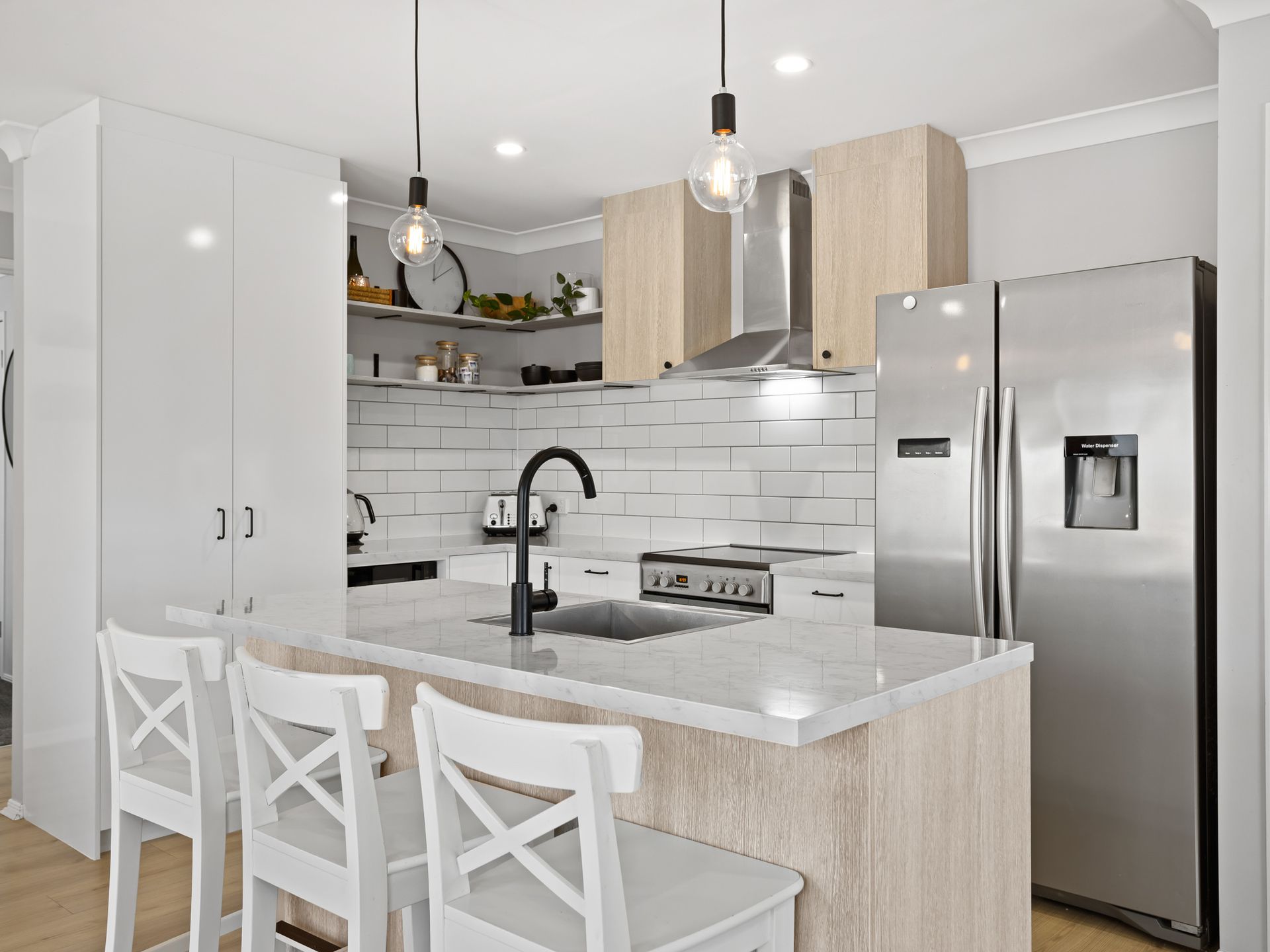 The open plan design allows for seamless flow between the kitchen, dining, and living areas, perfect for hosting family and friends. The large island bench, complete with a breakfast bar, is perfect for casual dining or entertaining, creating an inviting space to sit and chat while the chef prepares the meal.