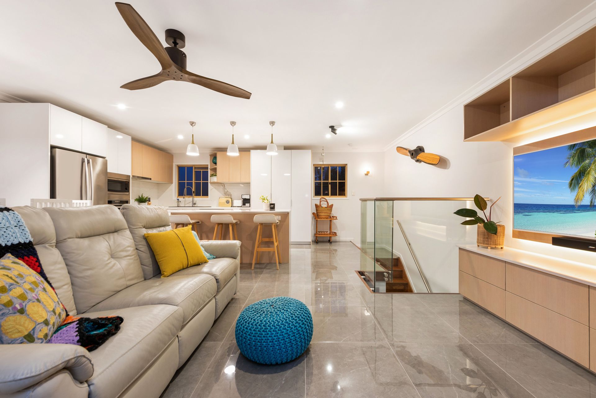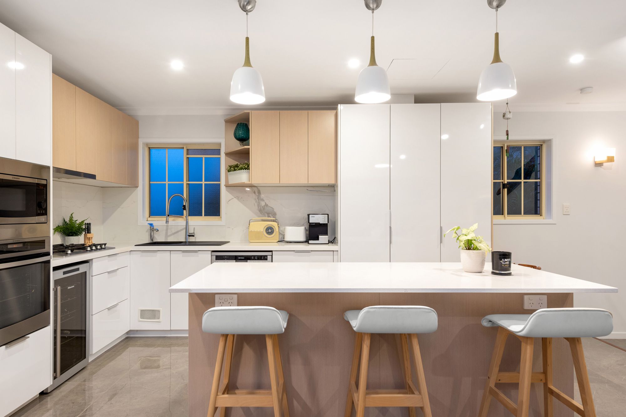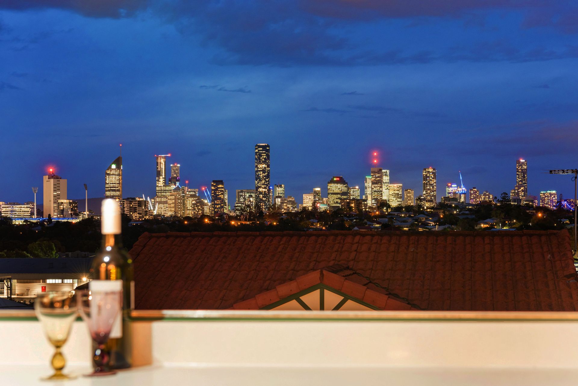 • Refurbished, modern 3 level townhome with panoramic views of the city • Open-plan living, dining and kitchen flowing to a covered alfresco balcony • Two bedrooms opening onto a large terrace; modern bathroom with large shower and black combo shower heads • Stylish modern kitchen with centre island, 5 burner gas cooktop, dishwasher, pantry, wine fridge and wall oven • Glass stairwell balustrading on the top floor with rear window providing exceptional light and cross breezes • Air-conditioning and ceiling fans; glossy large format tiles with neutral palette throughout • Private, grassed courtyard with raised garden beds and storage shed; ground level laundry and pet door • Integrated lock-up garage with an abundance of storage; separate WC plus an additional car space beside the home