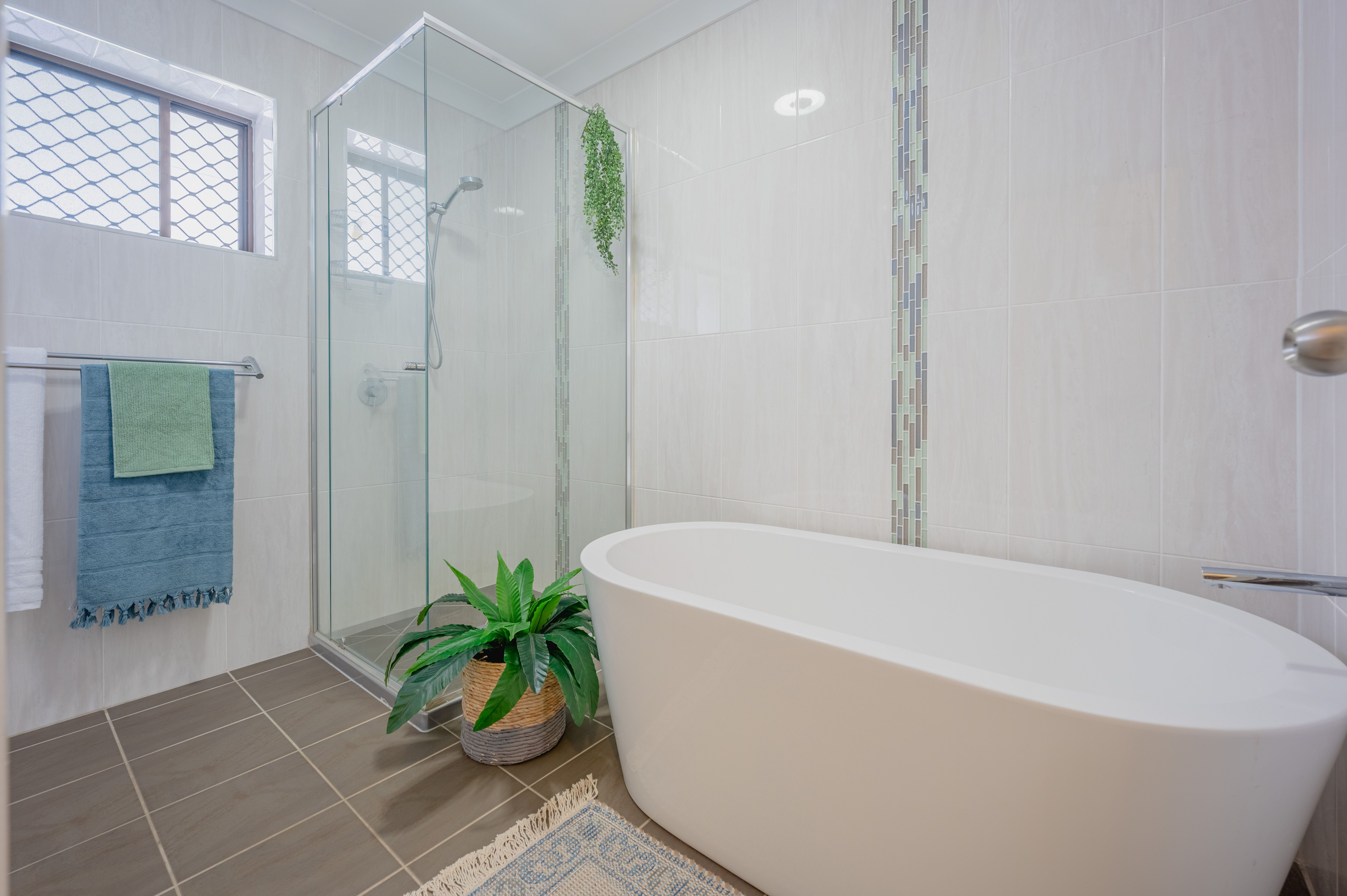 The main bathroom wouldn't look out of place in a modern designer home with this gorgeous free standing bath tub, walk in shower and once again floor to ceiling tiles!