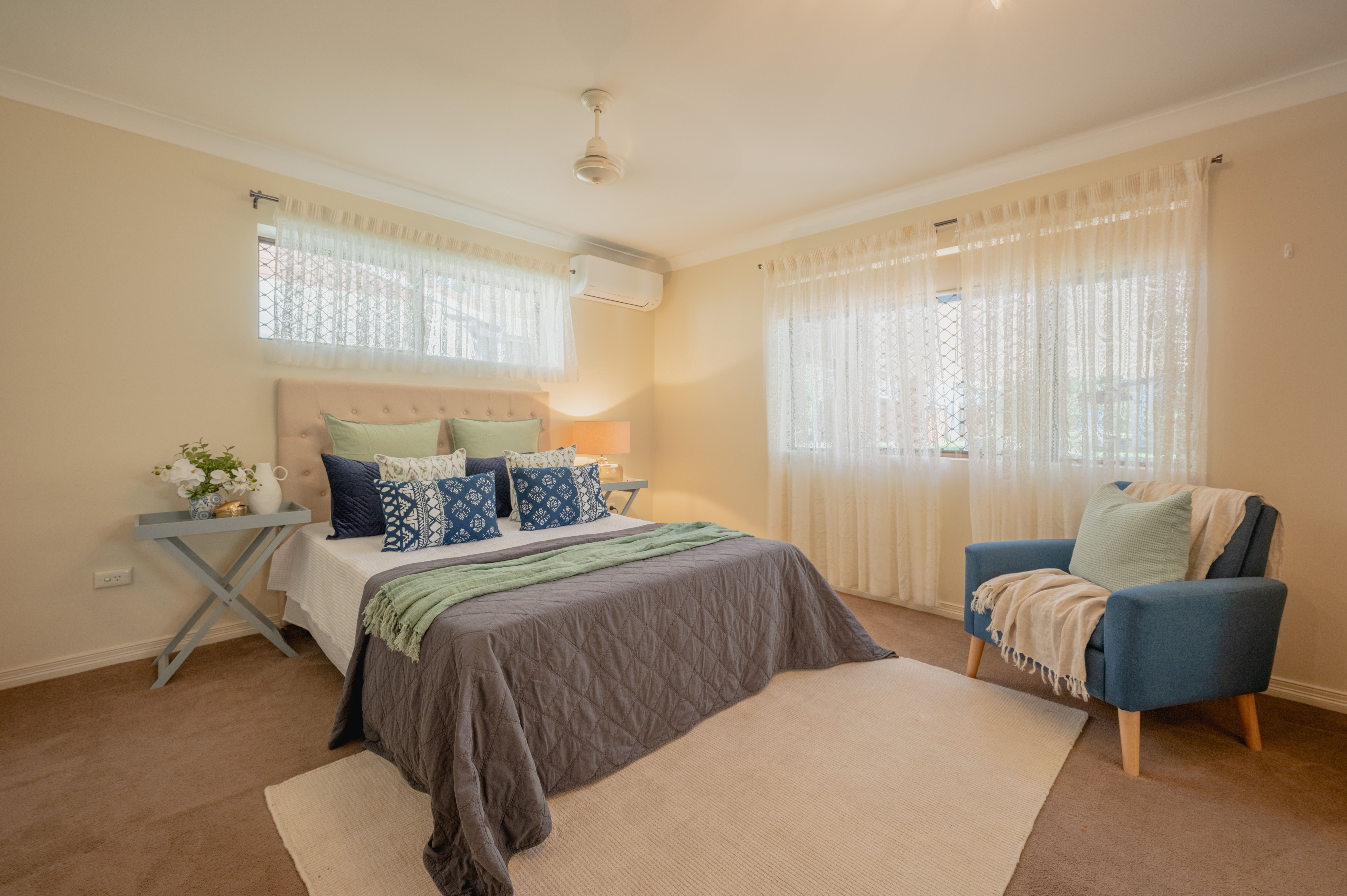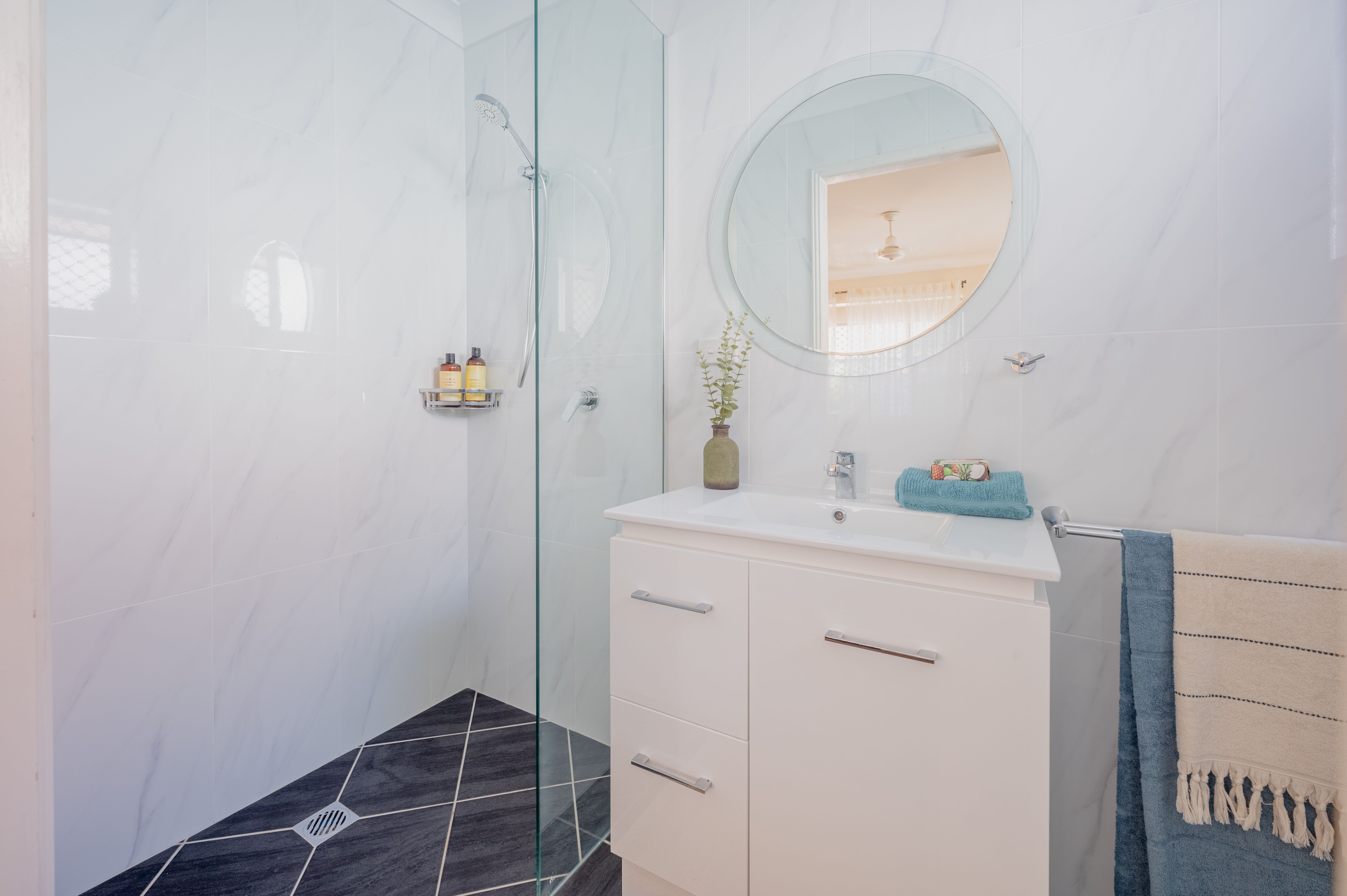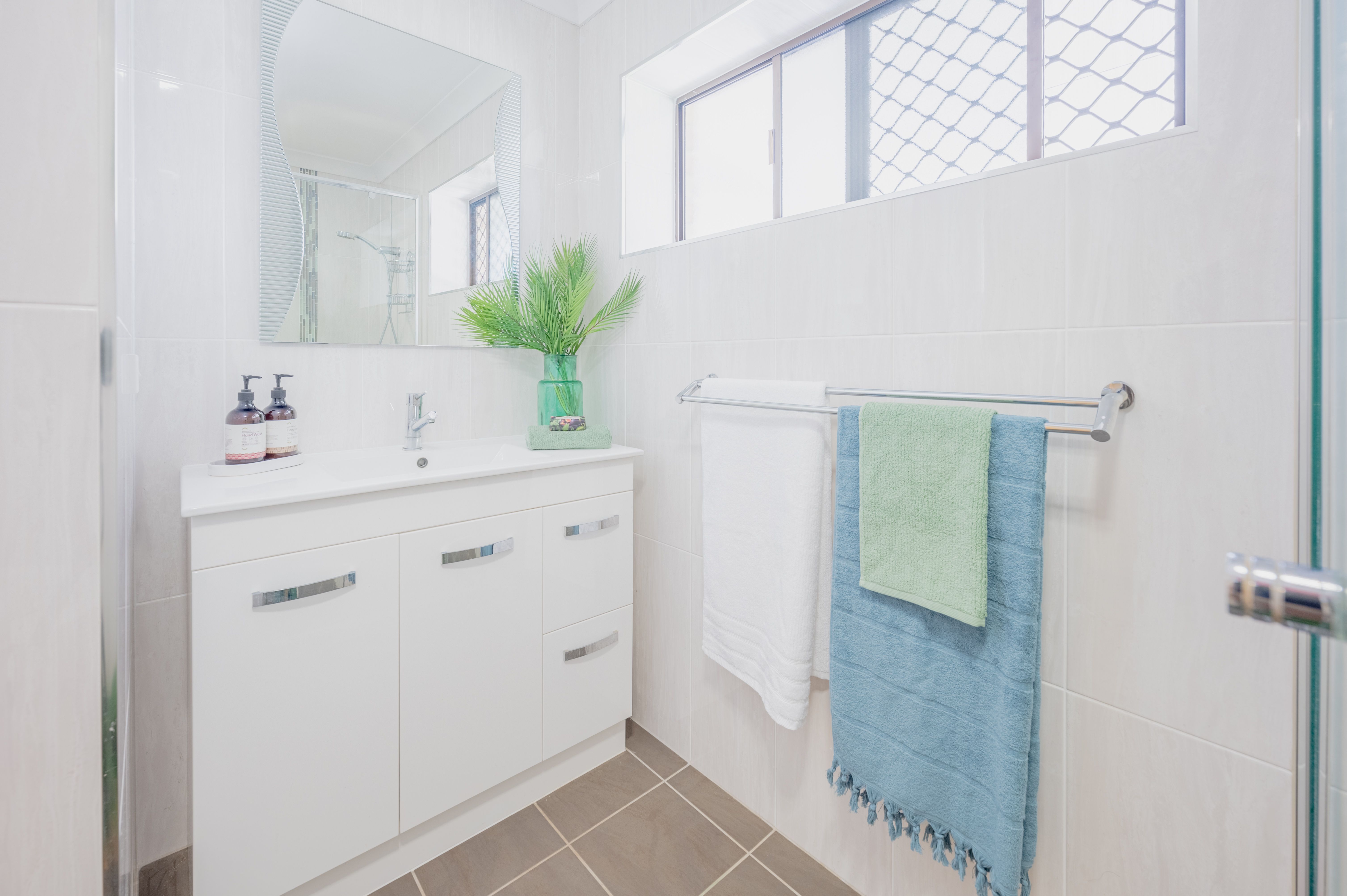 The master bedroom is extra roomy and features wall to wall built in cupboards. It has a split system air conditioner for comfort but the real treat is the modern renovated bathroom with floor to ceiling tiles and new vanity.