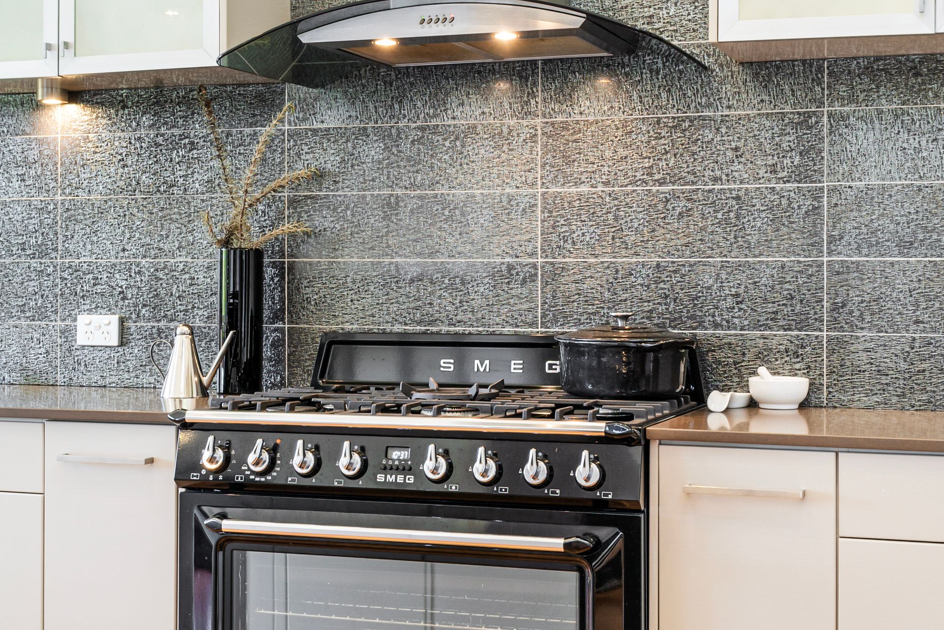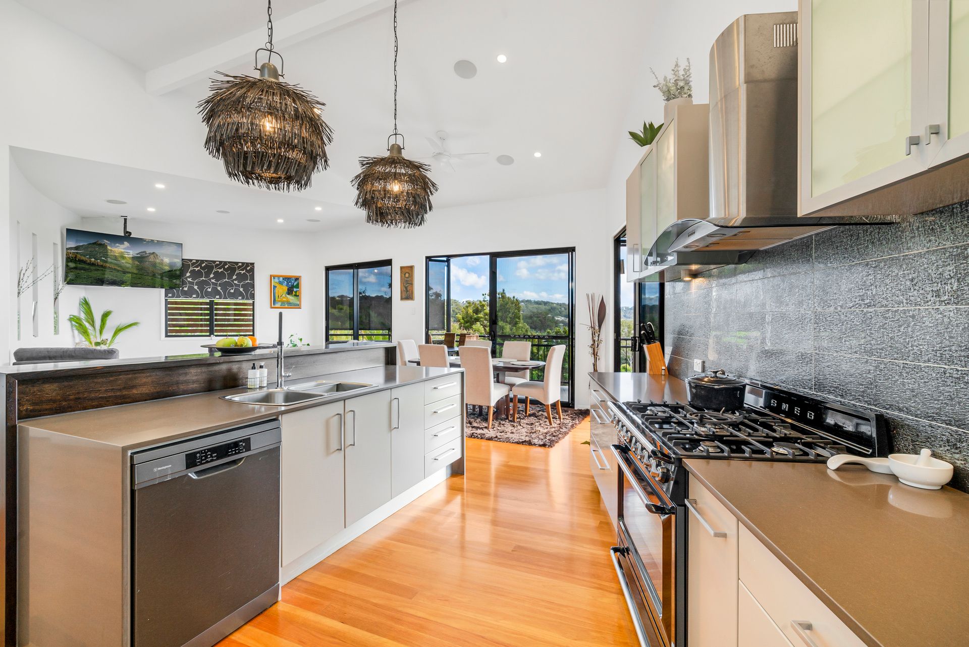 The open plan contemporary kitchen is a standout feature, designed to impress even the most discerning cook. It offers sleek cabinetry, stone benchtops, high-quality appliances, and a walk-in pantry for added convenience.