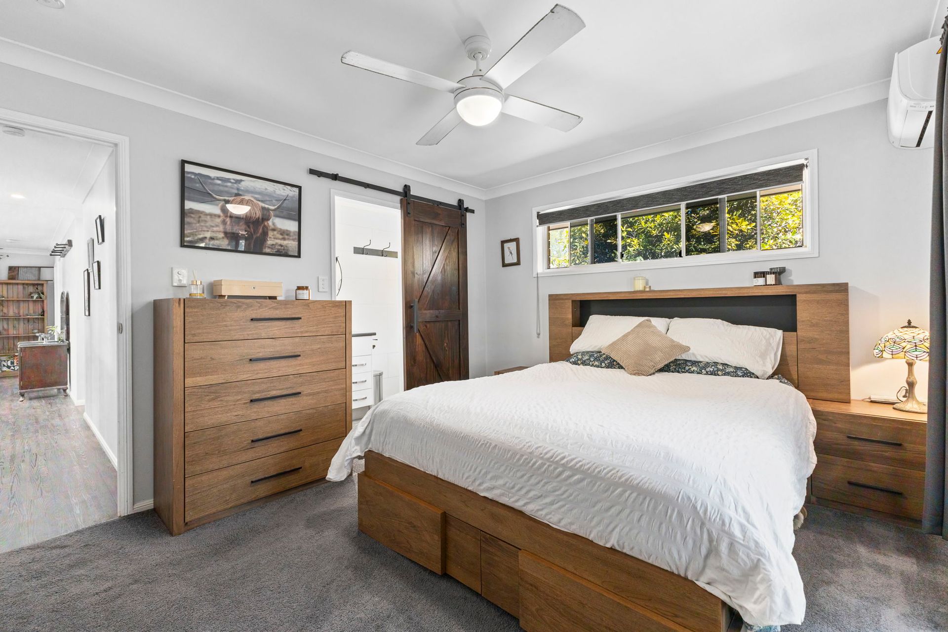 *Master bedroom with ceiling fan and air conditioning