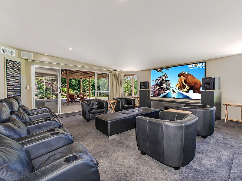 Lower level is a mans cave/guests quarters/teenager retreat with an amazing media room, surround sound, built in wet bar with facilities of keg & glass front refrigerators, ideal party room. Another massive bedroom with ensuite/powder room for the media room. Huge wine cellar for the connoisseur, can hold at least 1,200 bottles. The lower level has sliding doors out to paved patio area where the kids can ride their bikes and go rolling down the gently grassed slope to the cubby house.