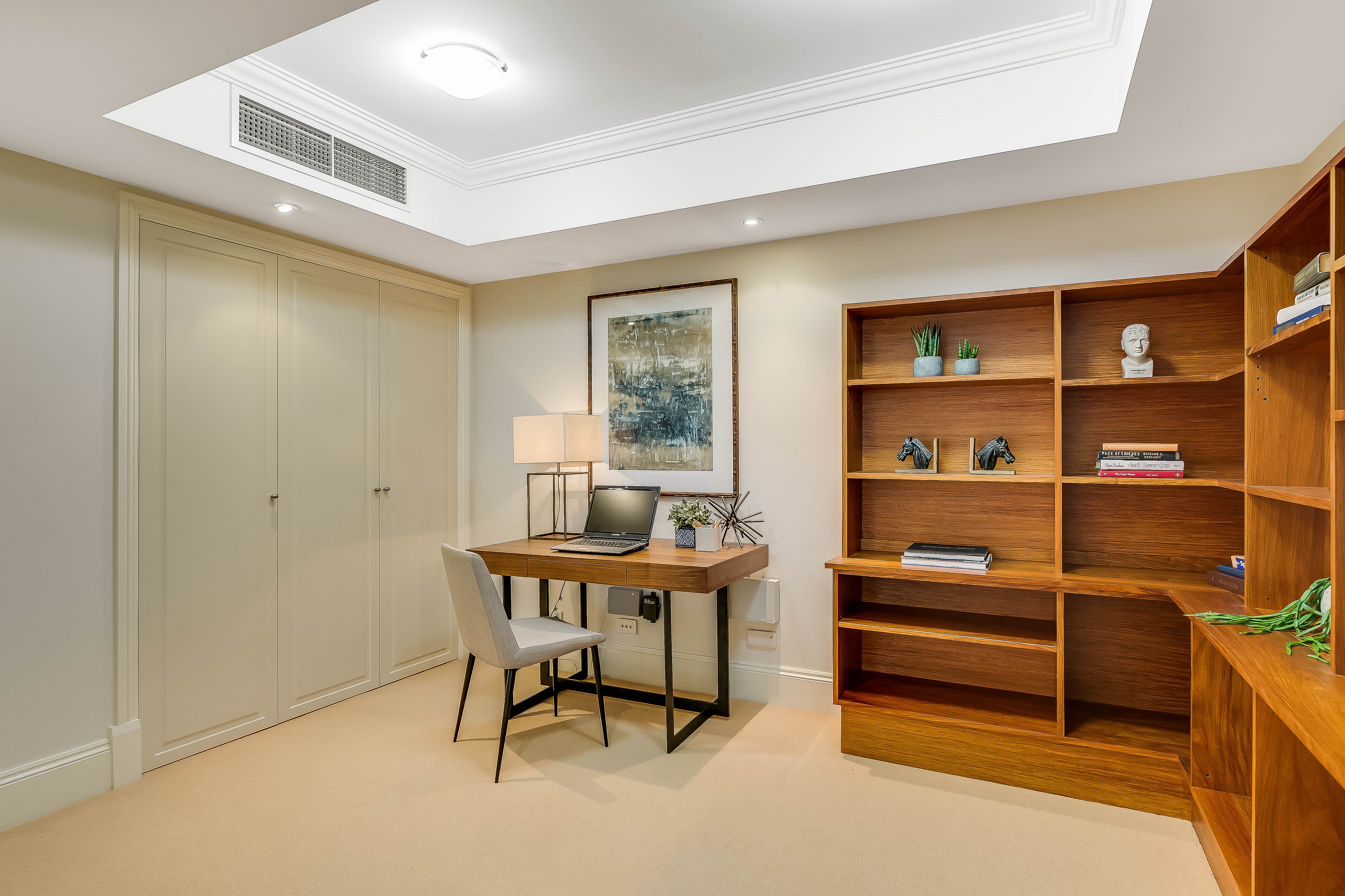 Apartment 102 features two very spacious bedrooms with luxury ensuites and open onto the private courtyard. A generous study includes built in cabinetry and is easily large enough to qualify as a third bedroom.