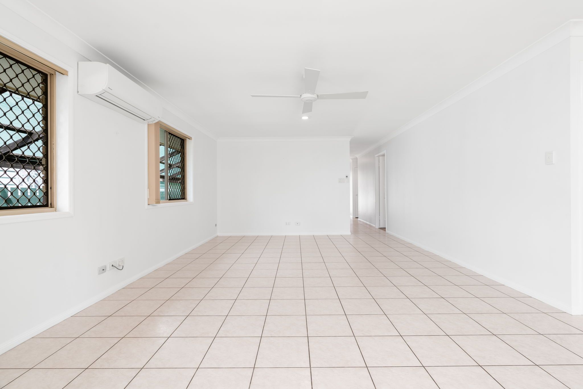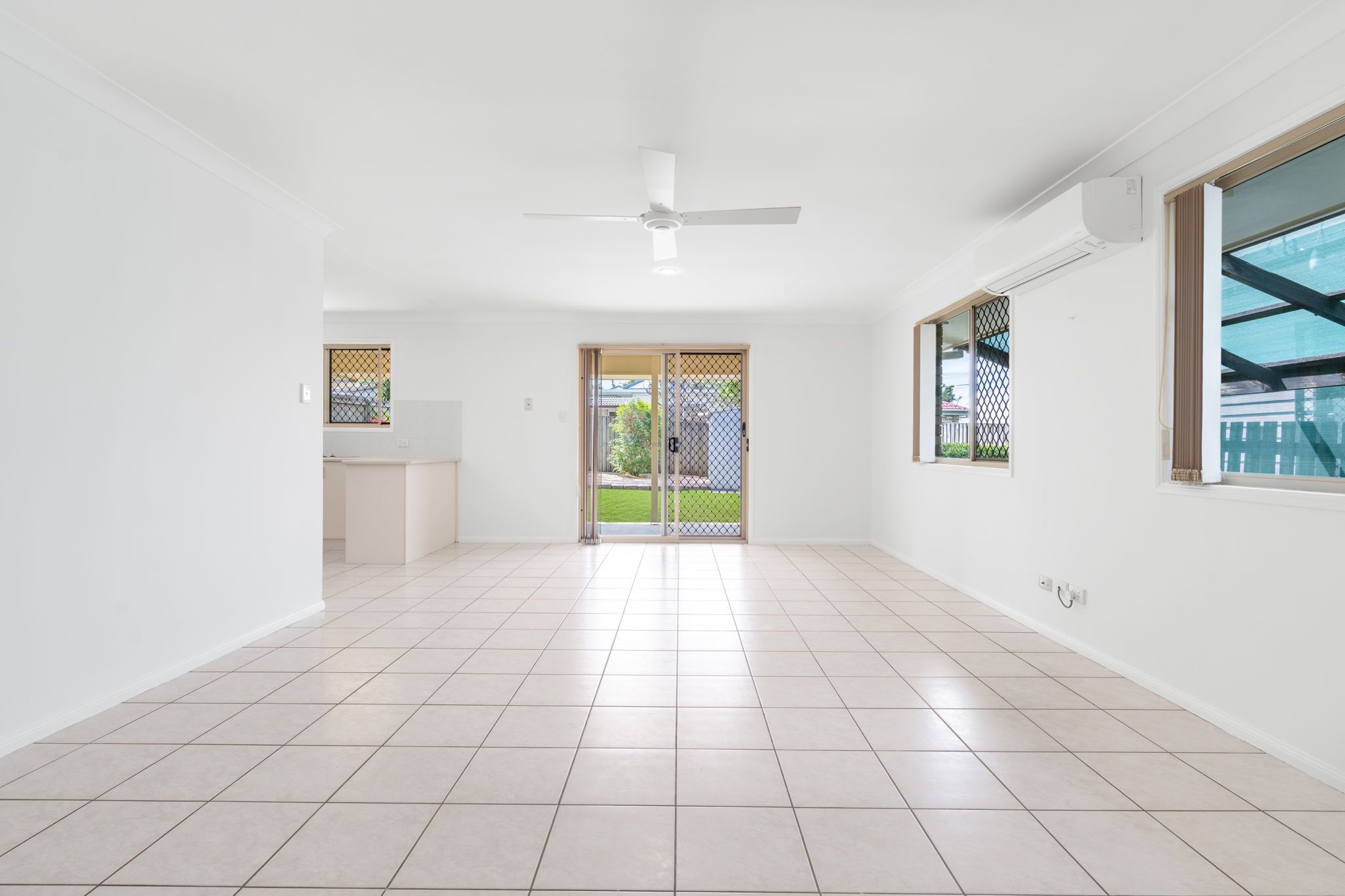 The combined lounge and dining area has a split system air conditioner and ceiling fan and flows effortlessly to the adjacent kitchen.