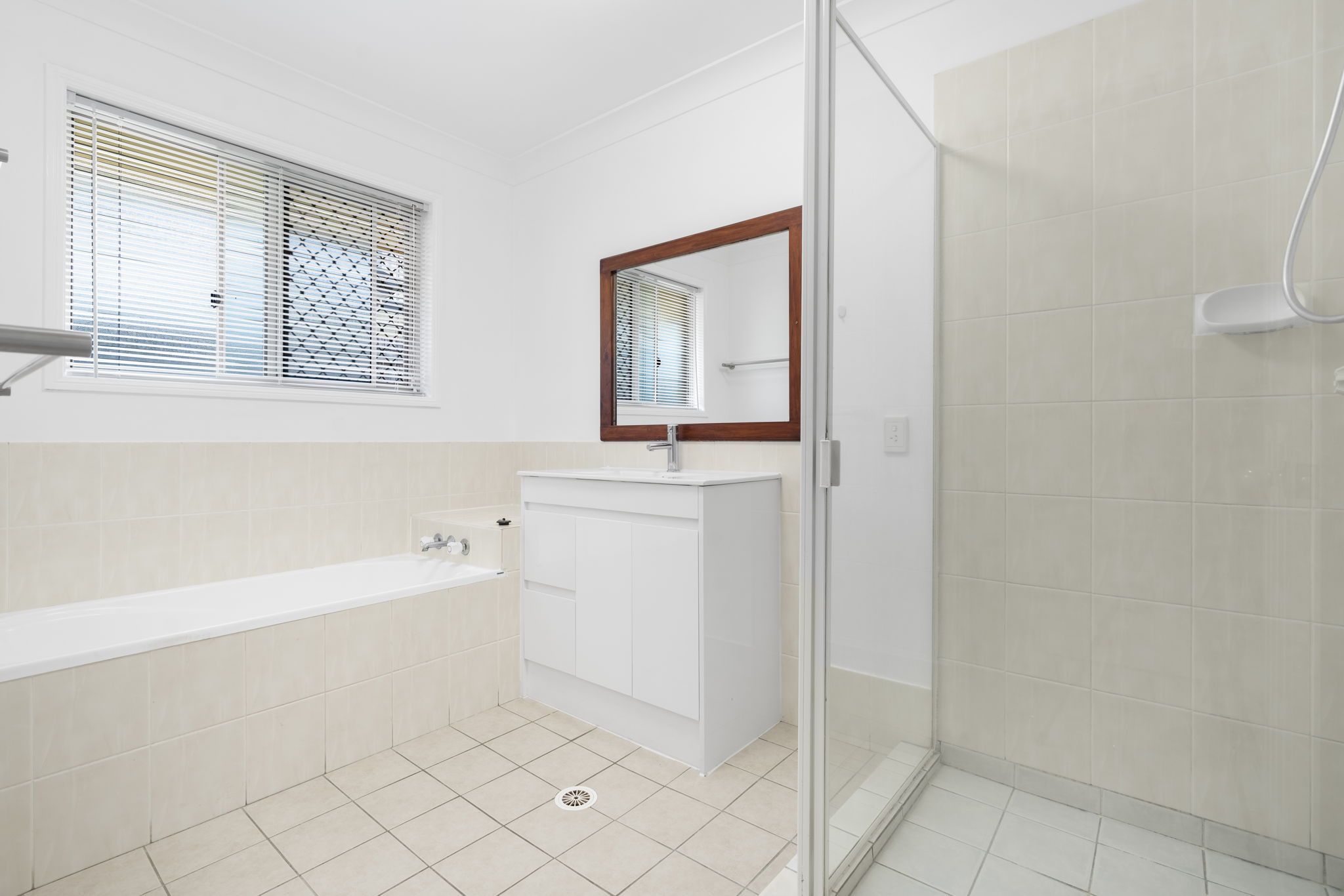 The bathroom is perfect for a young family with separate shower and bath tub with a single vanity.