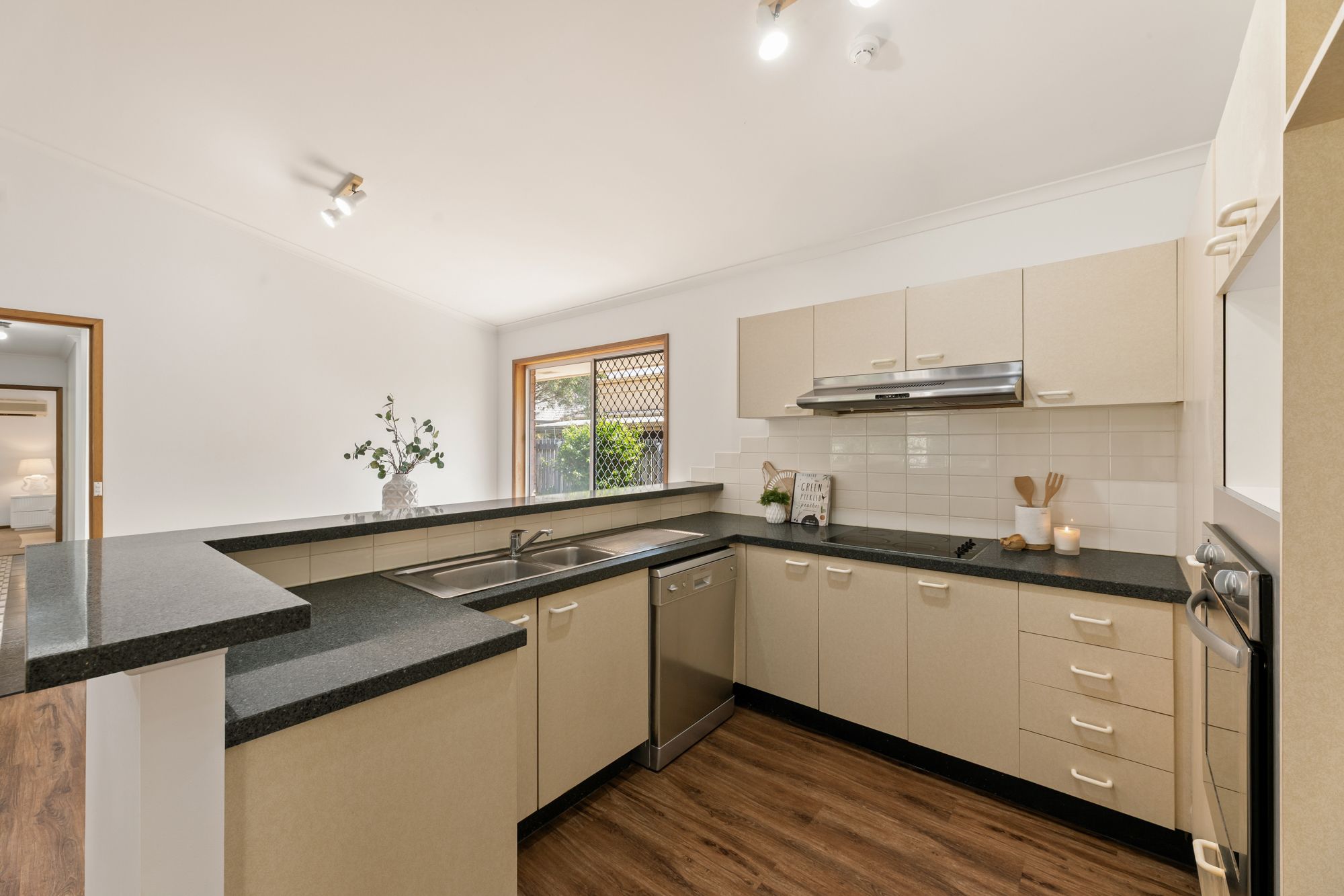 The kitchen has been thoughtfully considered for practicality and ease, featuring wrap-around benches, extensive cabinetry and quality appliances including a wall-mounted oven, electric cooktop and dishwasher. Positioned to overlook the open plan interiors and patio, it ensures a smooth connection with family and guests.