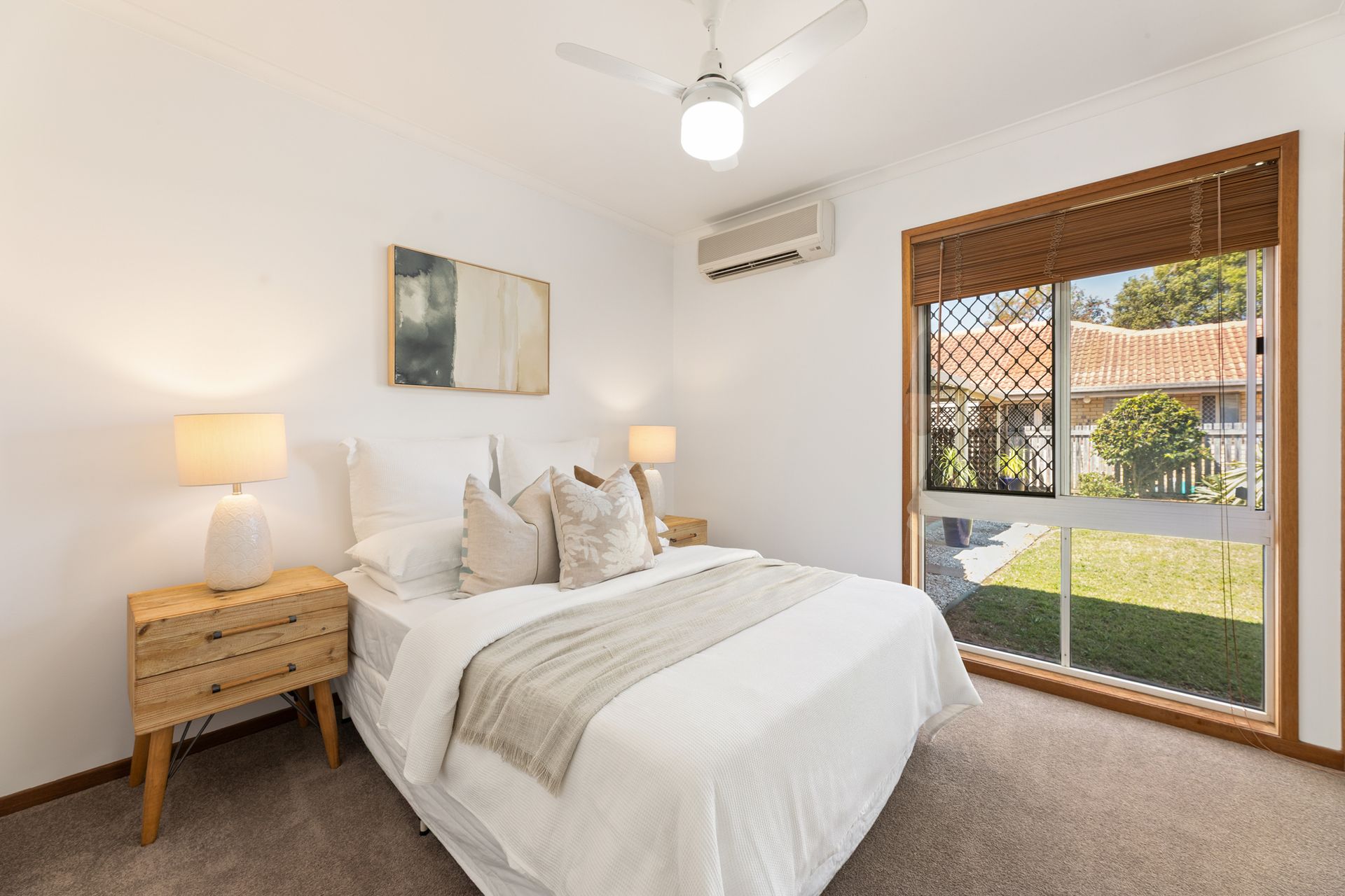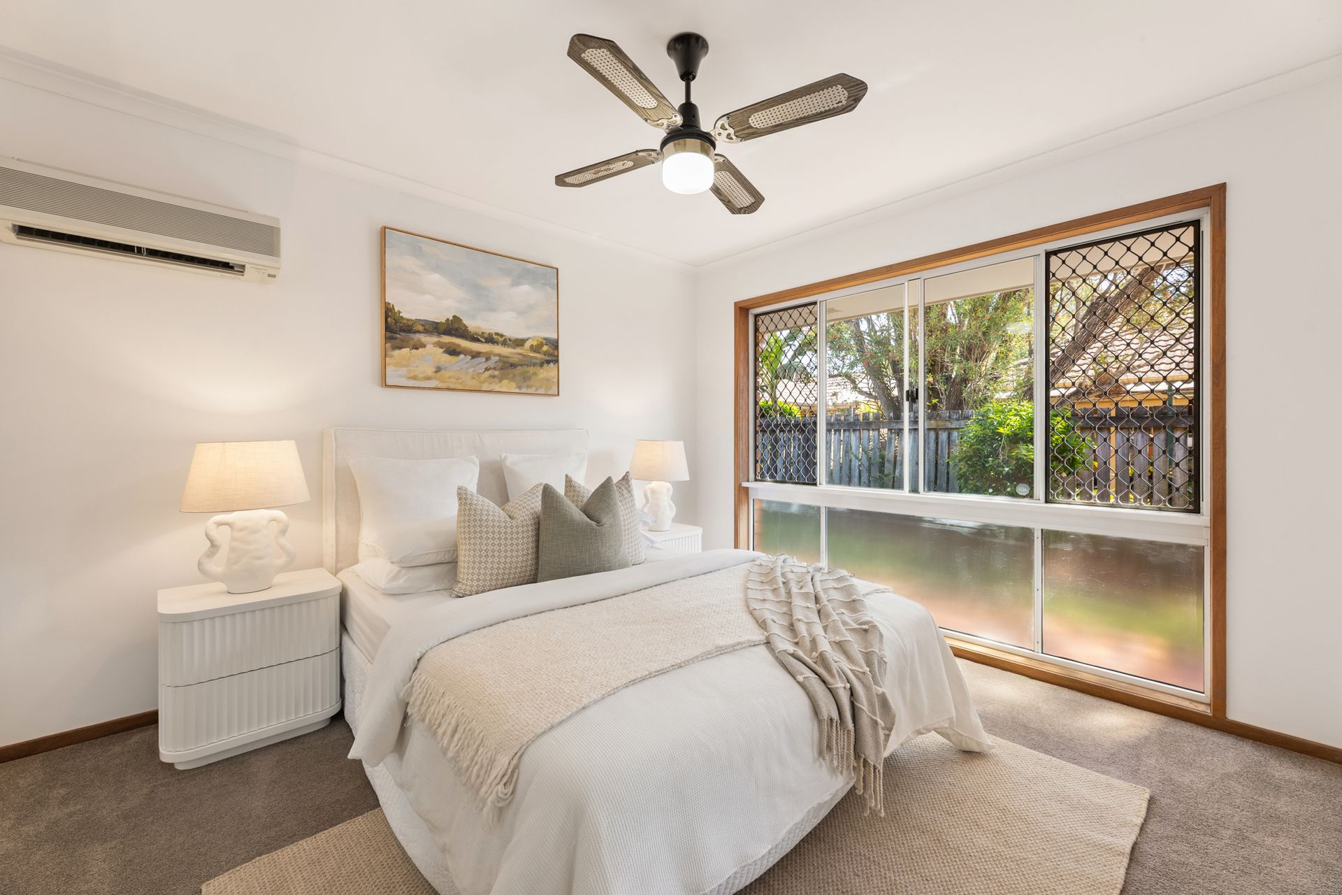 Outdoors, established gardens and level lawns create a private and practical setting for daily enjoyment, with ample space for children and pets to roam. The 630sqm allotment offers generous outdoor appeal and scope for future improvements. Comfort is enhanced by air-conditioning, ceiling fans and screened windows, while a separate laundry, water tank and garden shed add functional convenience. A double garage with drive-through capability provides secure parking and easy rear-yard access, completing a home designed for relaxed, family living.