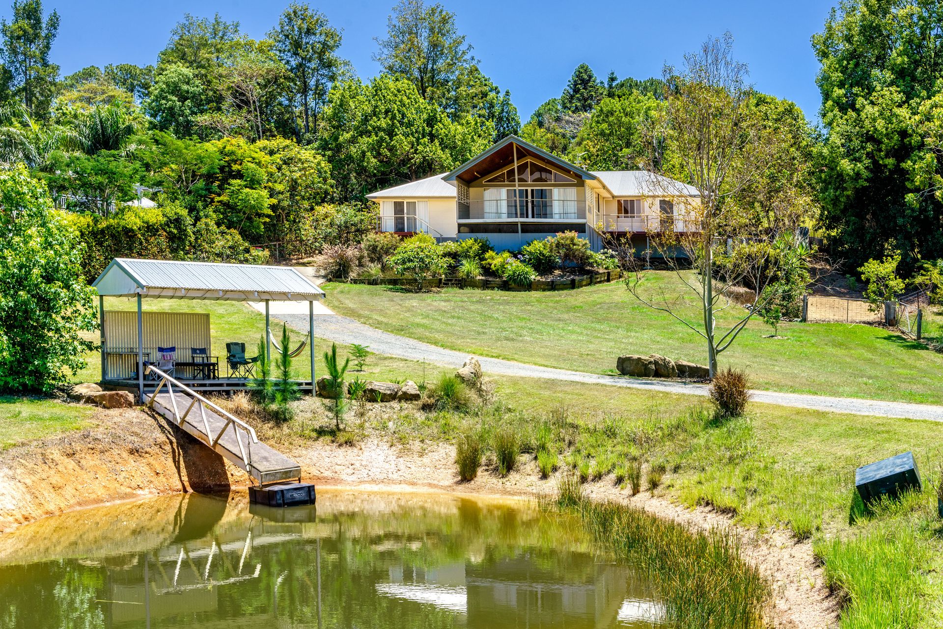 Property Features: • Spacious Open Plan Kitchen, Dining and Living Area • Kitchen has an Electric Stove Top, Oven, Microwave and Dishwasher • 4 Good Size Bedrooms with Carpeted Flooring, Built in Wardrobes, a Walk-In in the Master Bedroom and Ceiling Fans. • Study Nook with a Built-In desk, there is also a double Built-In desk next to Bedroom 2 and 3. • 2 Modern Bathrooms with Washing Machine facilities in Main and Spa Bath in Ensuite Bathroom. • Split System Air-Conditioning in the Living Area. • Wooden Flooring in all Living Areas. • Entertainment Deck overlooking the Mountains. • 2 Bay Carport with Internal Access. • Large Fully Fenced 1.8 Acres with a Dam. • Electric Access Gate with Remote. • Only 4km to Eumundi & Cooroy with the School Bus stopping at the Front Gate.