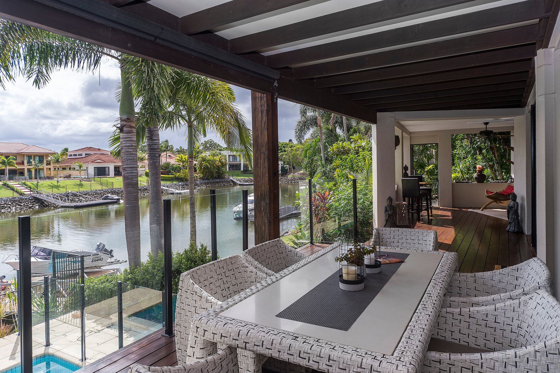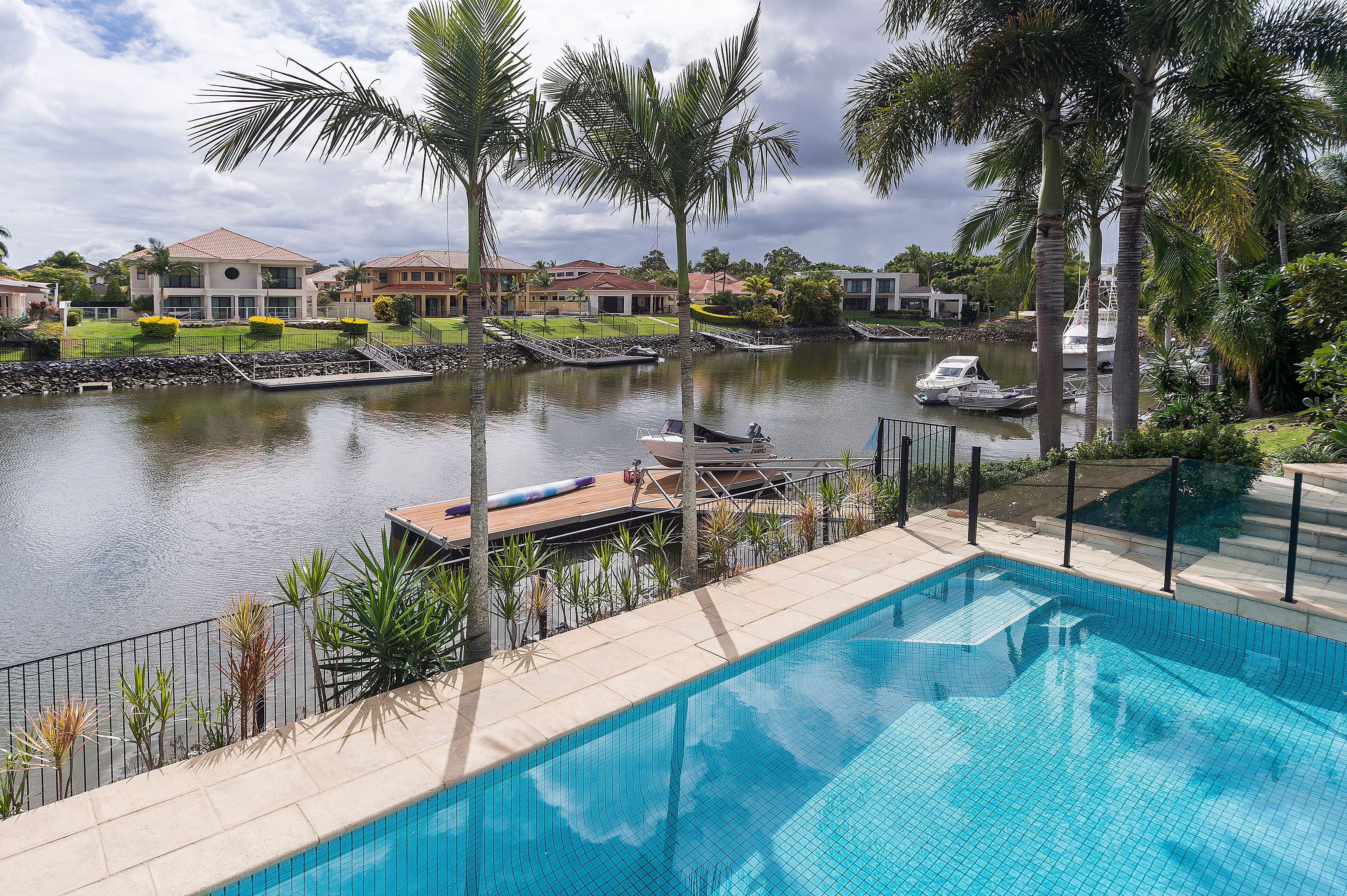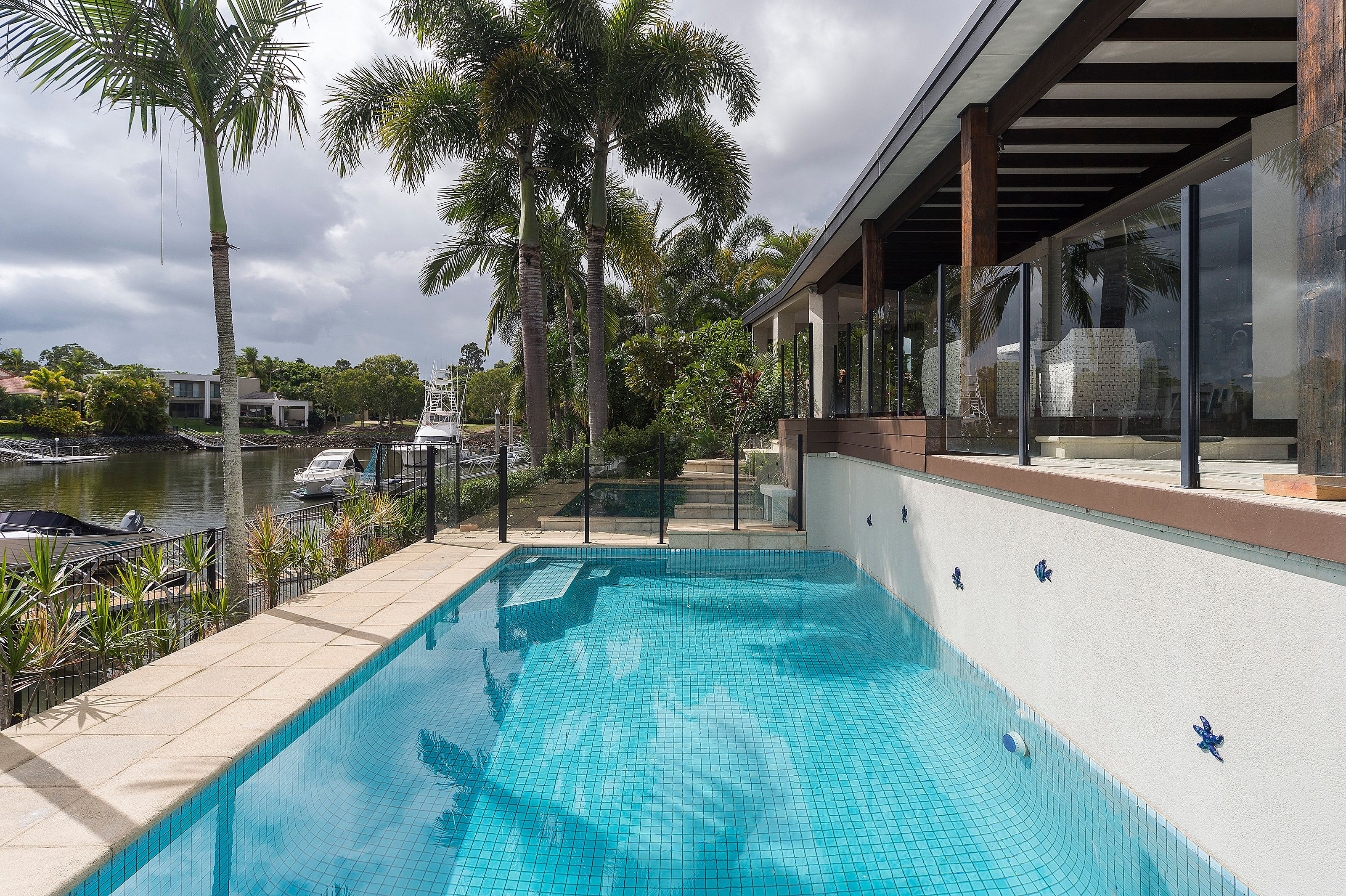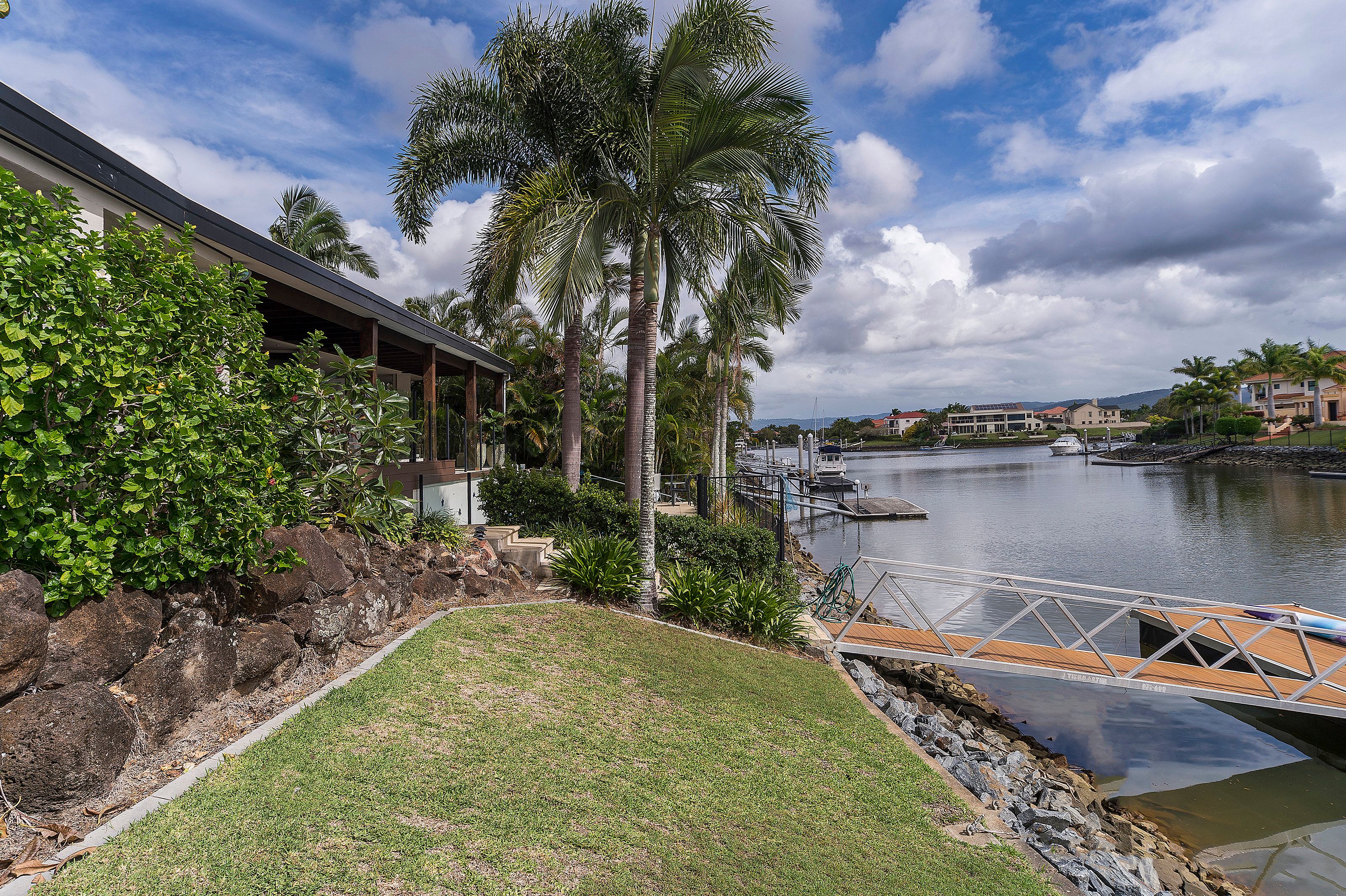 Features include: • 900m2 block with 30 metres water frontage • Four spacious bedrooms • Master bedroom boasts a large WIR, and tastefully appointed ensuite with his and her basins • All bedrooms are carpeted and air-conditioned, featuring BIR's • Open-plan living area, with sunken lounge, that extends through wide sliding doors out onto a spectacular entertainment deck. The deck enjoys a west aspect water views as well as the pool area. • Chef's kitchen with quality appliances • Powder room • Separate study • Large internal laundry with dryer, generous cupboard & bench space • Large tiled pool • Pontoon with bridge free access to the Broadwater and the Seaway beyond • Beautiful tropical, low maintenance gardens surround the home • Ducted air conditioning throughout, with ceiling fans • Double lock up garage with additional space for the golf buggy • 3,200 litre rainwater tank • Secure gated community with 24 hour security (both land and water) • FIRB approved for foreign investment