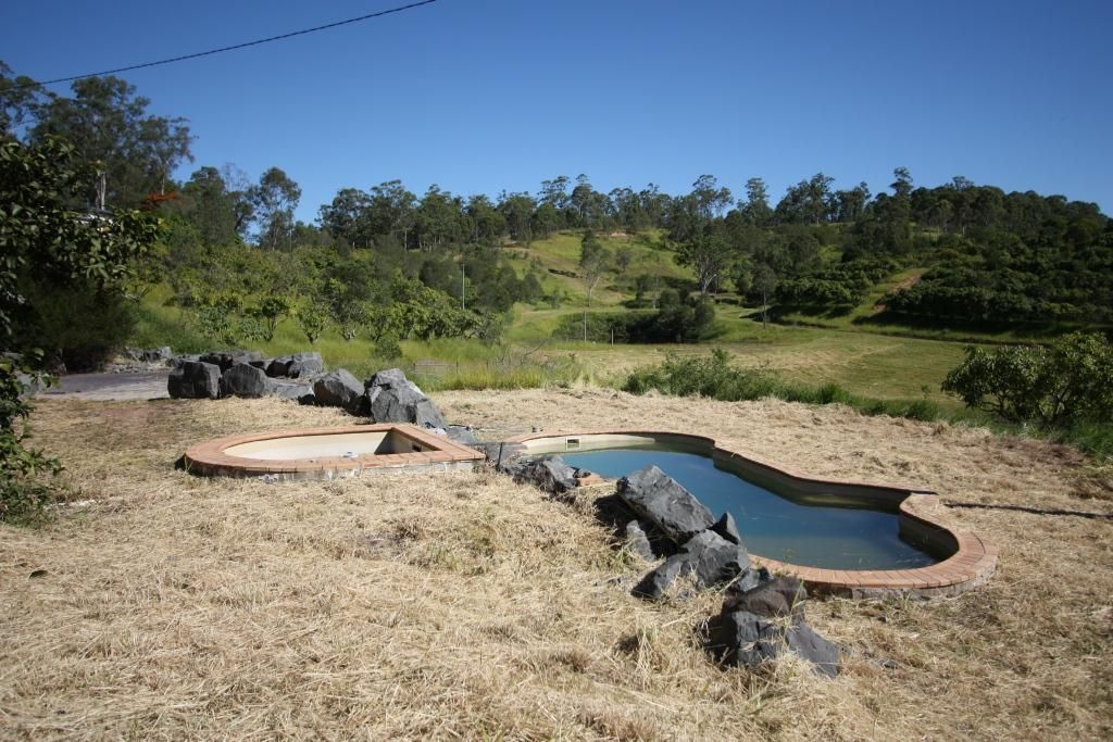 MAIN HOUSE: This work in progress needs completing. 4 bedrooms - master with 2 walk-in robes, one could become an ensuite. Lounge, dining and kitchen, split system air-con in lounge. An internal staircase leads to a possible sun-room and a media / rumpus room. These rooms are adjacent to the spa and pool. Outside on verandah bathroom, kitchen and bath could be extended. Underneath is a secure cool room and work area for home brewing/ cheese making etc. Spa and pool connected by a water feature and jets. Inground, saltwater pool which is lit. The house is about 100 years old and was the main house for a large pineapple farm.