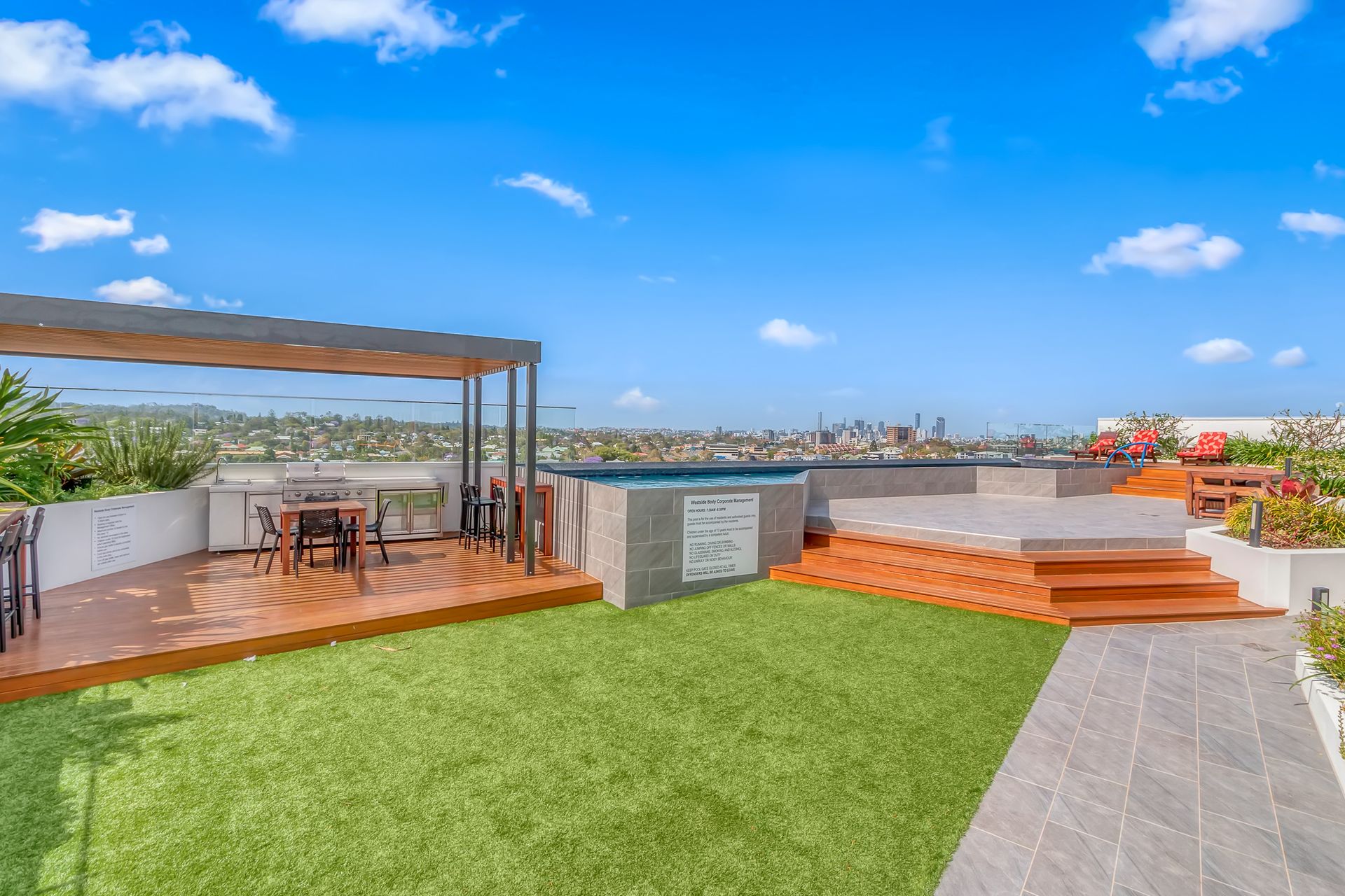 Westside apartments is a modern building with rooftop pool and entertainment area featuring city and mountain views, perfect for that drink on sunset or dinner with guests.