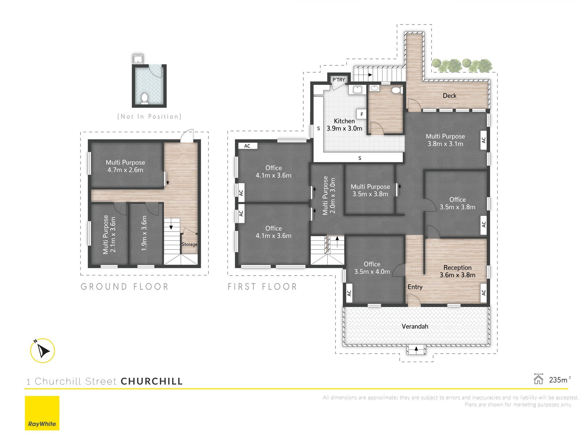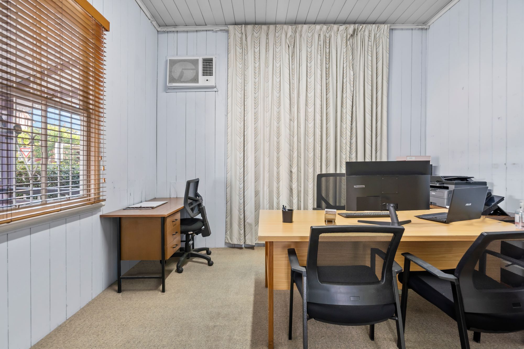 Improvement and Building Layout: Renovated Queenslander converted to professional air-conditioned offices Level 1: • Reception area • 4 private offices • 3 multipurpose rooms • Document safe • Kitchen • Toilet with vanity • Rear decking and stairs Level 2: • Internal stairs • 3 multipurpose rooms • Storage • External second toilet