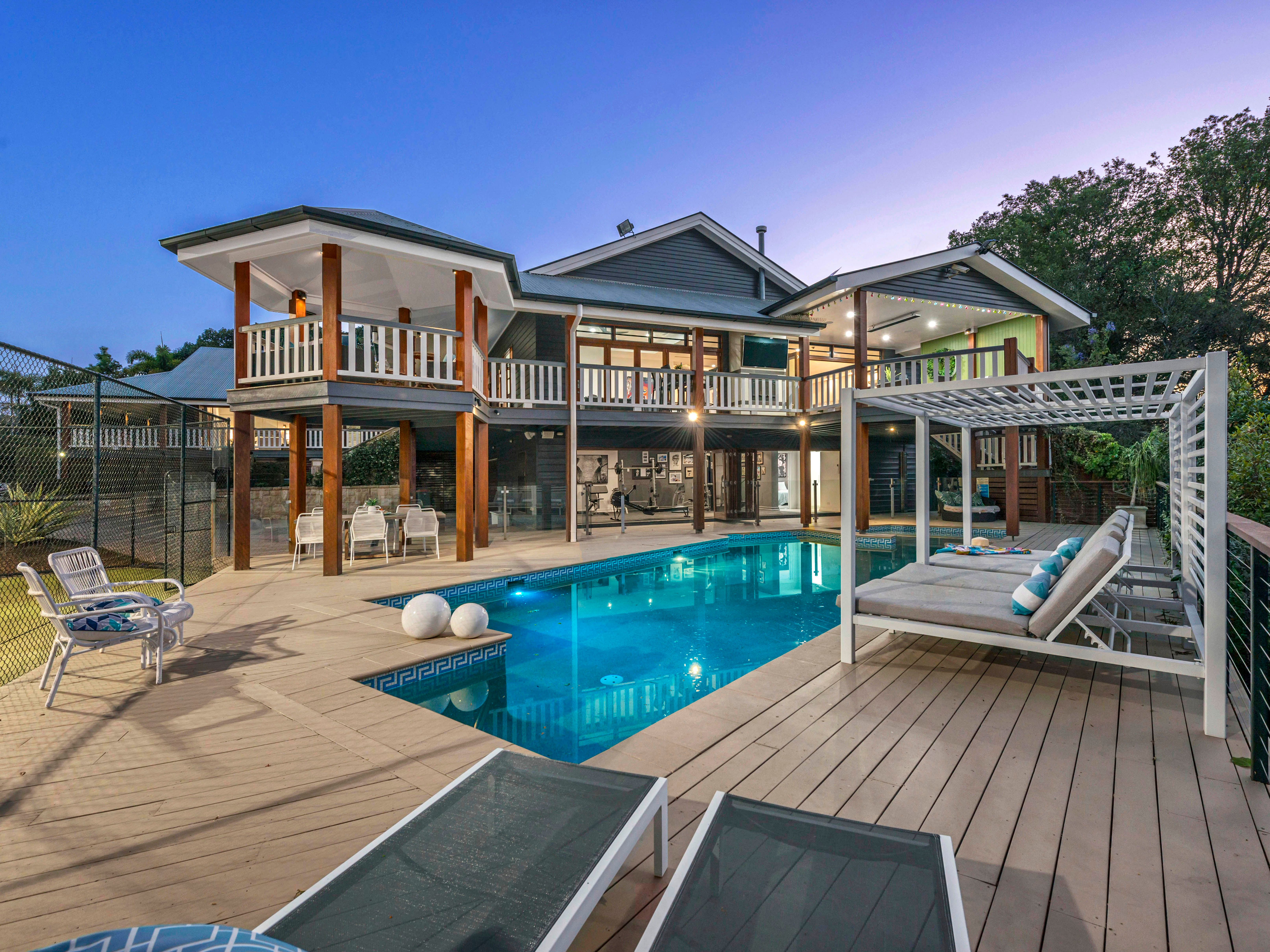 More like a mini resort, the property boasts a floodlit Wimbledon size tennis court with elevated spectator's Rotunda, an in-ground swimming pool with spa and twin lounging cabanas, fully equipped air-conditioned gymnasium and outdoor entertaining facilities that overlook the picturesque parkland views. The home has broad north facing verandahs on 3 sides, and is just under 1,000sqm of stunning living under roof.