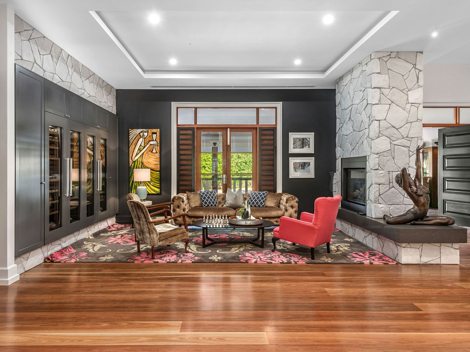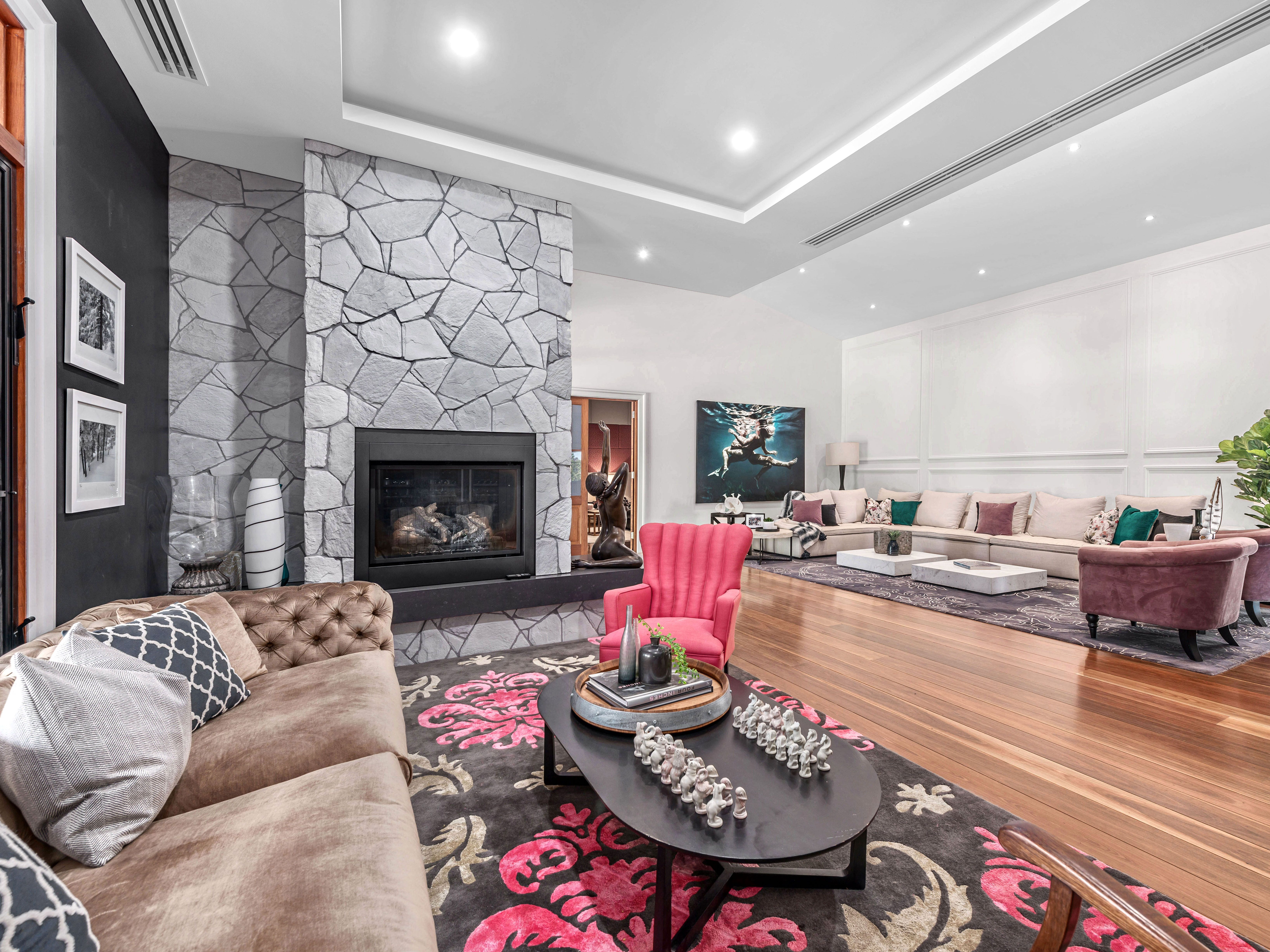 Soaring ceilings, panelled walls, natural light and expanses of polished timber flooring feature throughout this spacious five bedroom - all with ensuites - quality family home with an abundance of living and entertaining spaces. You'll also find a 4k High Definition Theatre with In-Wall Surround Sound, 2 Fireplaces, Wine Cellar, Bar Room, 12 camera CCTV, Keyless Entry, Home Automation and Video intercom systems. The bedrooms are generously sized with high ceilings, and all have lots of built-in storage options.