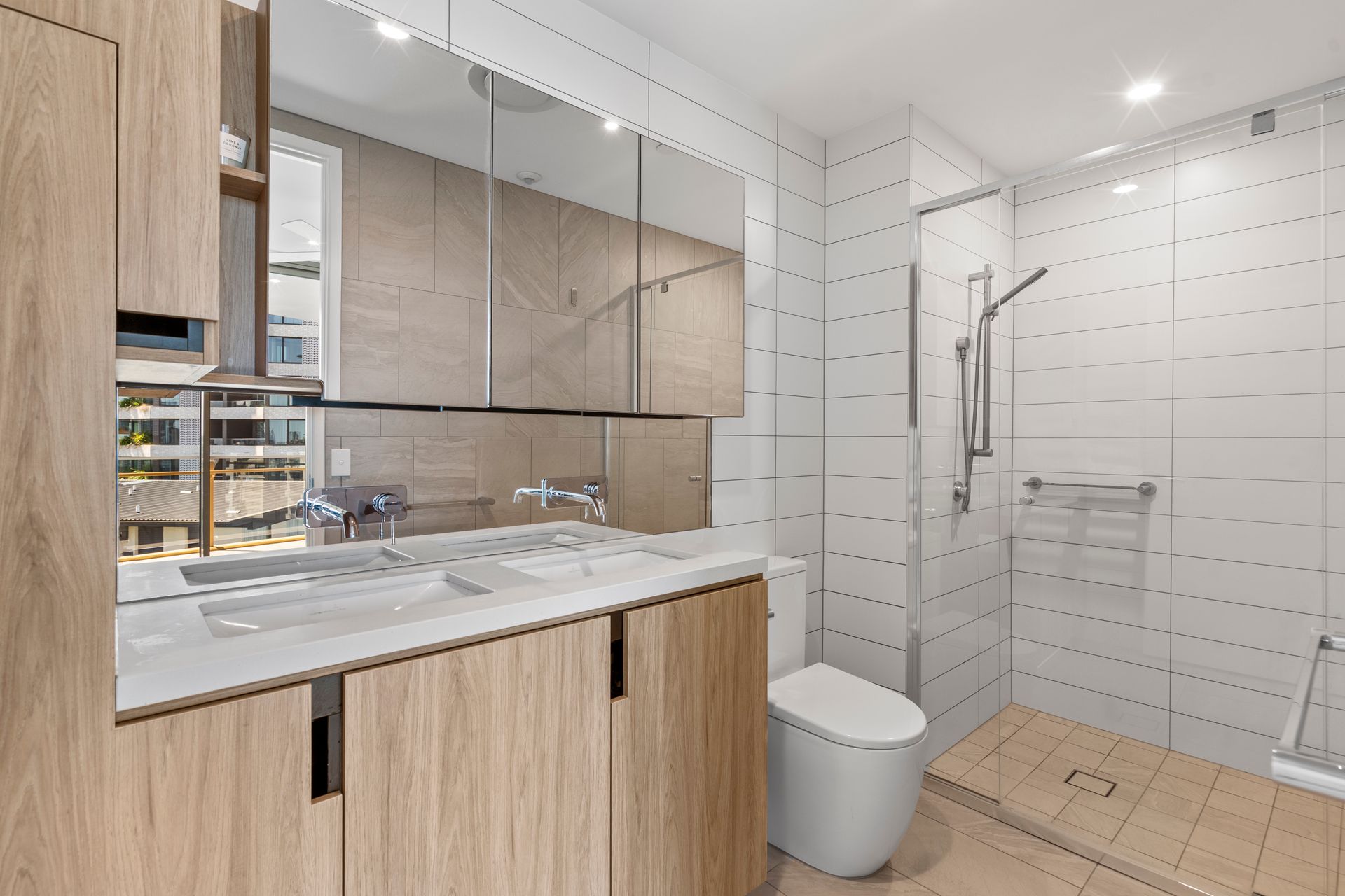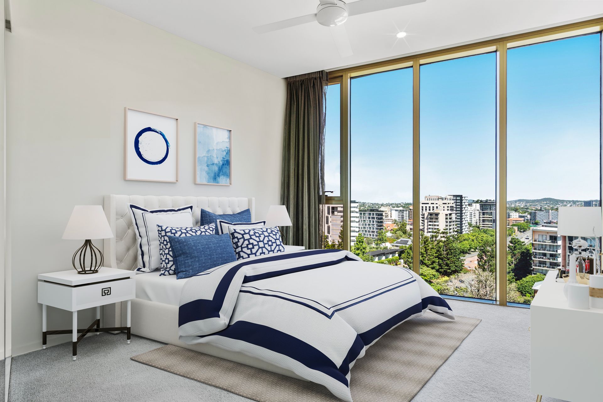 Inviting executive esteem and bespoke beauty across a 108sqm configuration, floor-to-ceiling glass accentuates the high ceilings, the timber tones of the custom integrated cabinetry add warmth to the uplifting interiors, and the sprawling aspect forms an ever-changing backdrop where you can watch the sun shift throughout the day, and the sky illuminate at dusk with evening lights.
