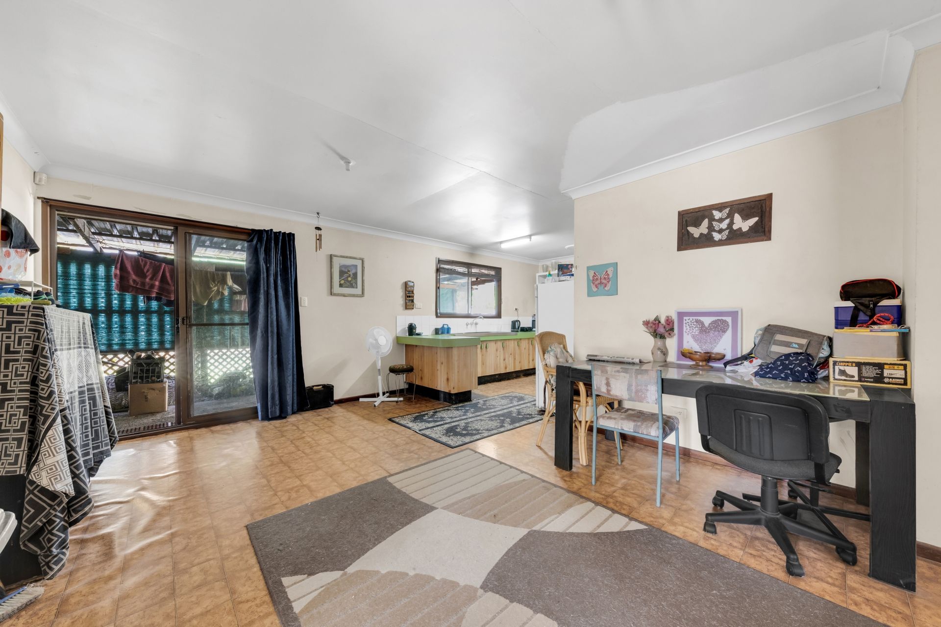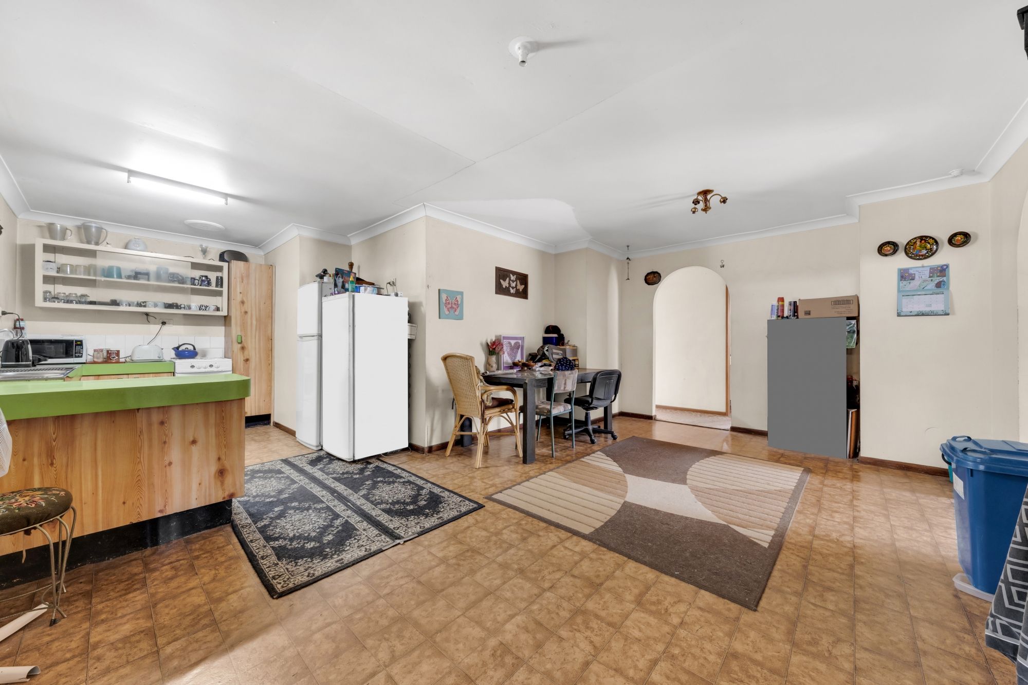 Upon entrance, you are welcomed by the spacious living area that leads you to the open-plan kitchen and dining area featuring timber cabinetry providing ample storage space with an electric cooktop and oven.