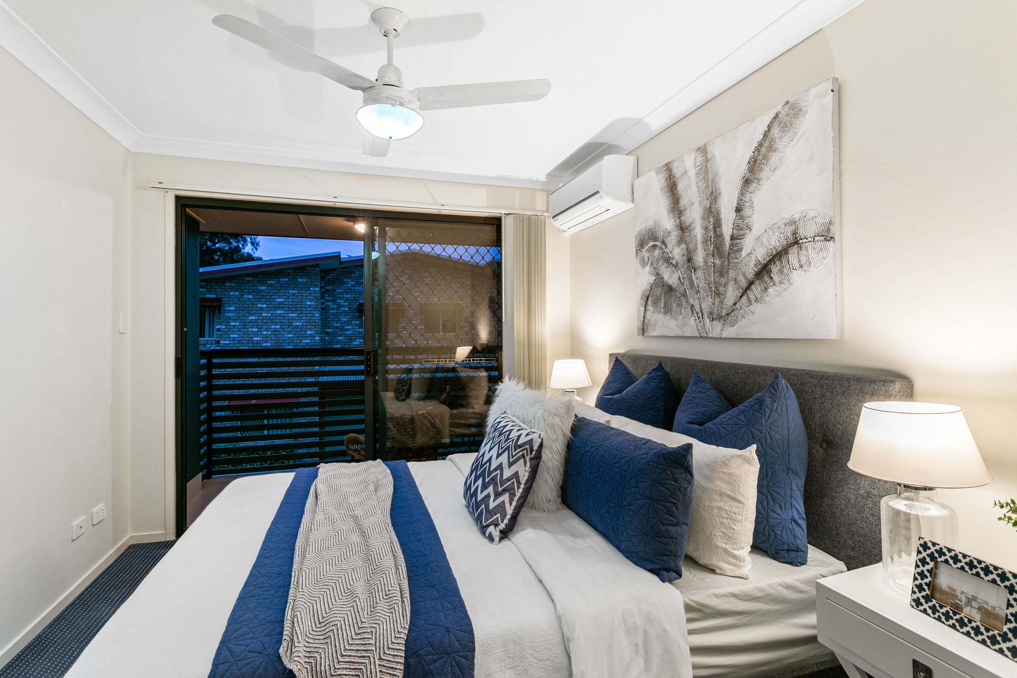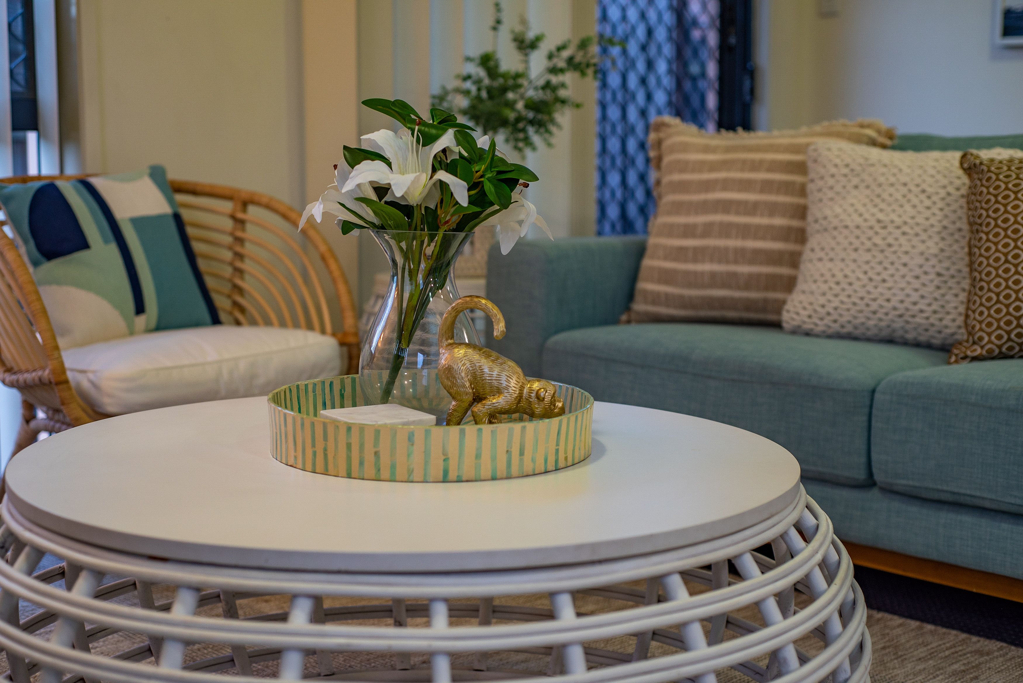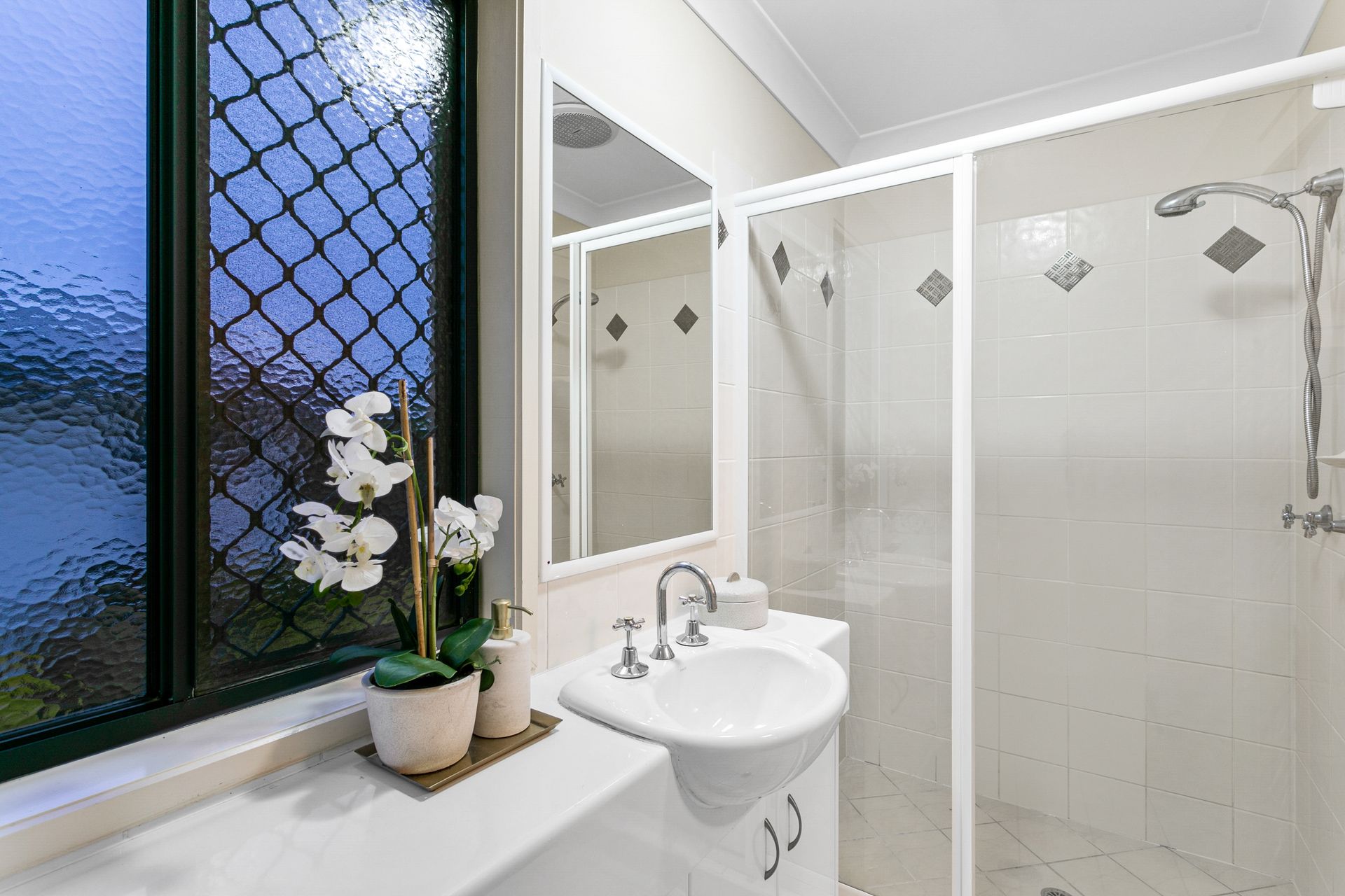 All three bedrooms are on the upper level of the home as well as a substantial study nook. All bedrooms have built in wardrobes and ceiling fans while the master bedroom is airconditioned and has a large walk-through wardrobe which leads through to an ensuite bathroom with shower and toilet. Glass sliding doors from the master bedroom lead out onto a private balcony, the perfect spot to sit and enjoy afternoon breezes. There is also a family bathroom on the upper level with a shower and toilet.