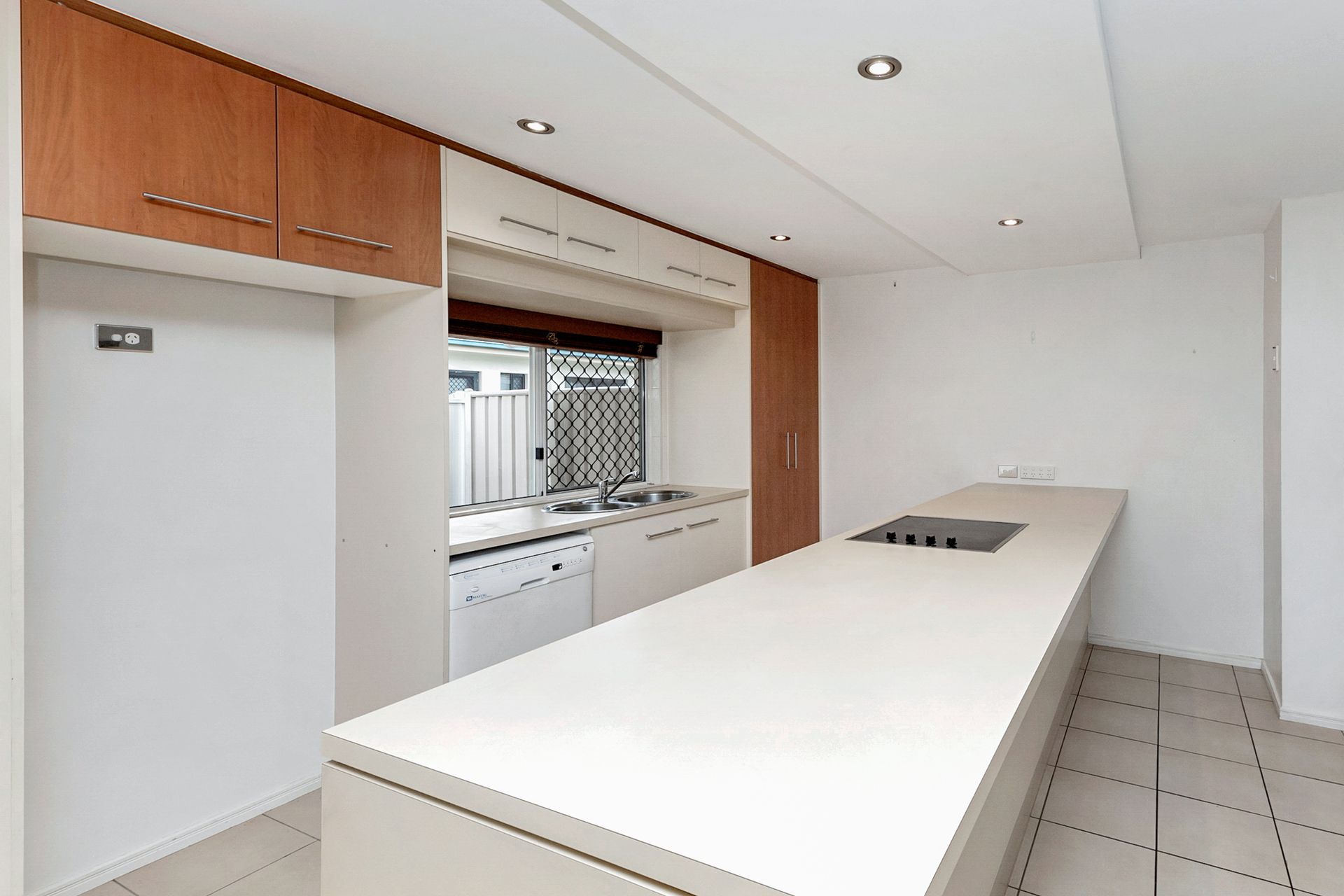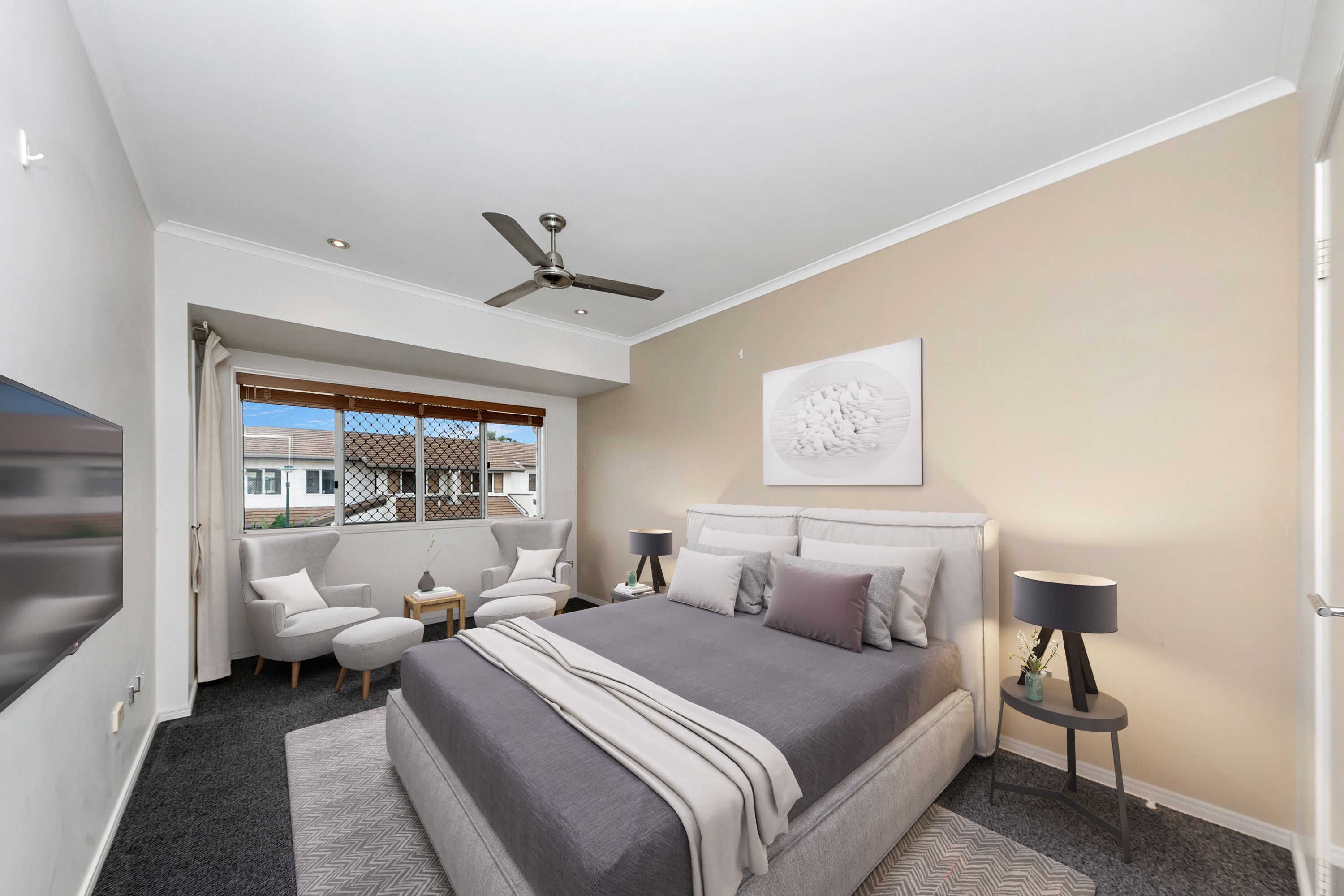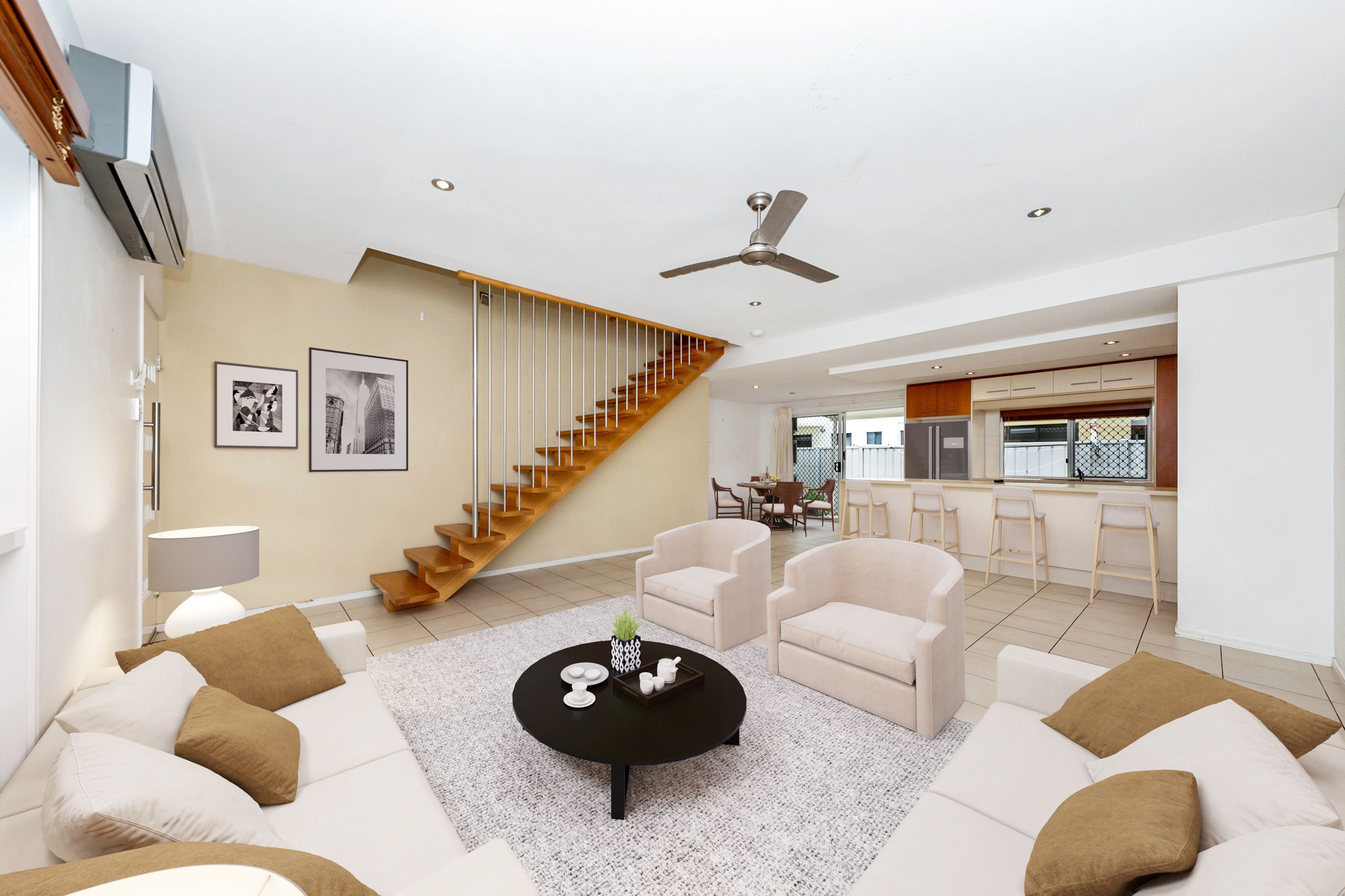 Downstairs offers a large living area with an eye catching set of stairs. This room is huge and will accommodate a full family without feeling like everyone has been crammed in. Colours throughout are bright and neutral and will pair well with any furniture that you decide to add in. With an abundance of storage and bench space, the kitchen has been thoughtfully designed and will impress you. With room for a few stools on the other side of the bench, cooking and entertaining is made so easy. Just behind the dining area is a nice sized patio, truly low maintenance, you could add a few pot plants to add a little flair!